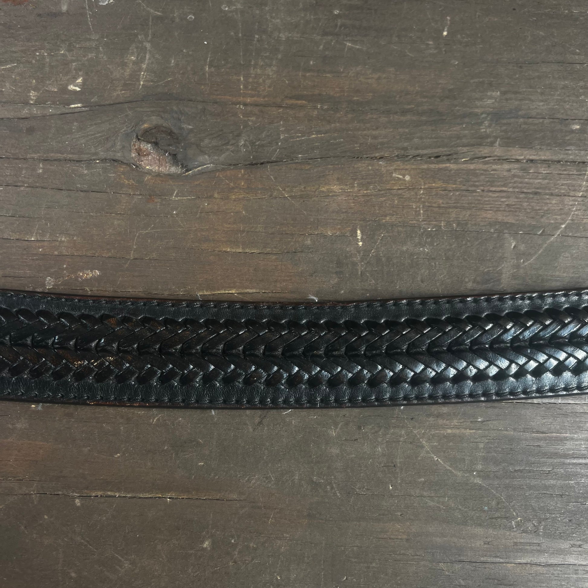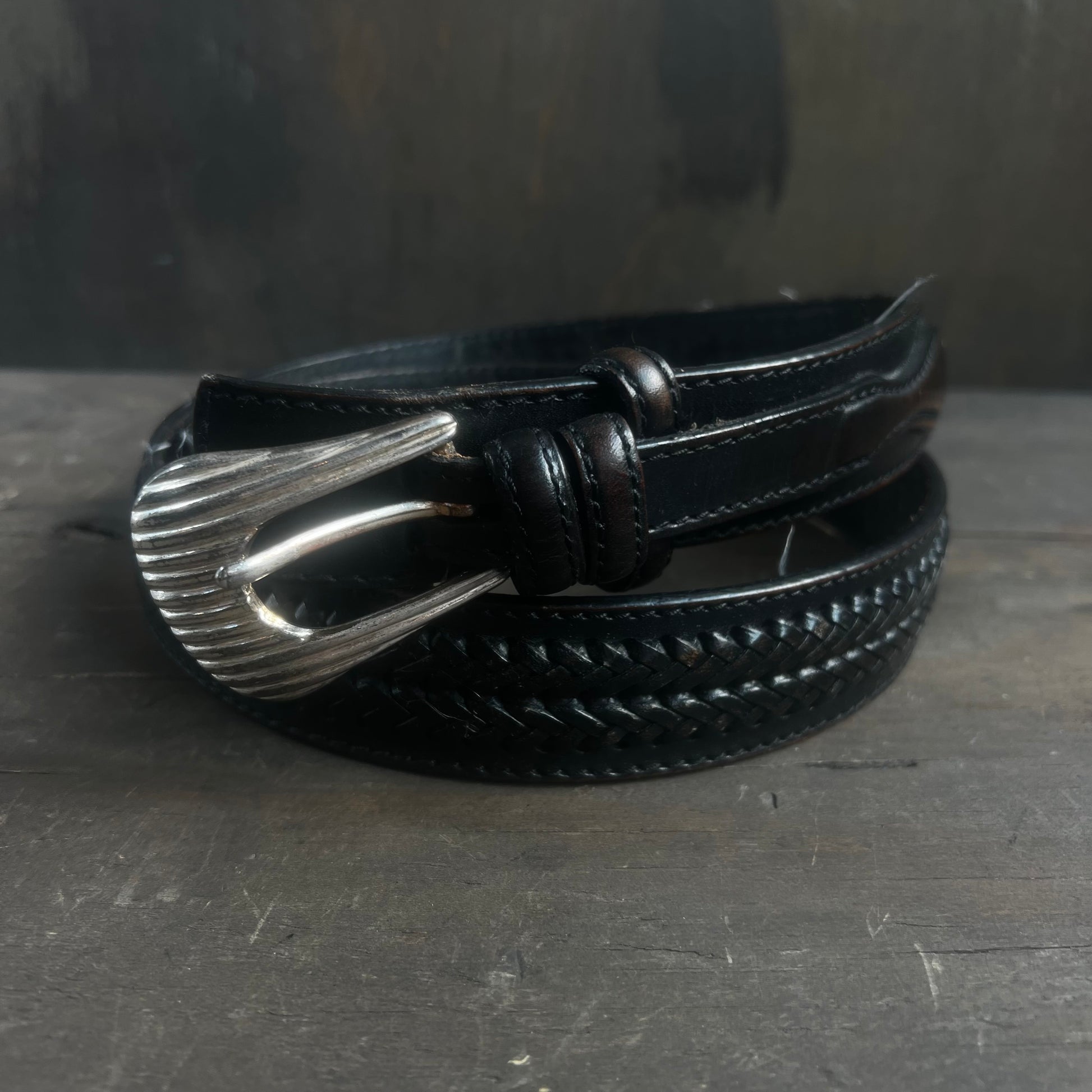 Classy Leegin black belt with braided leather details. Pretty silver belt buckle, in great condition. Size 36 (L).
