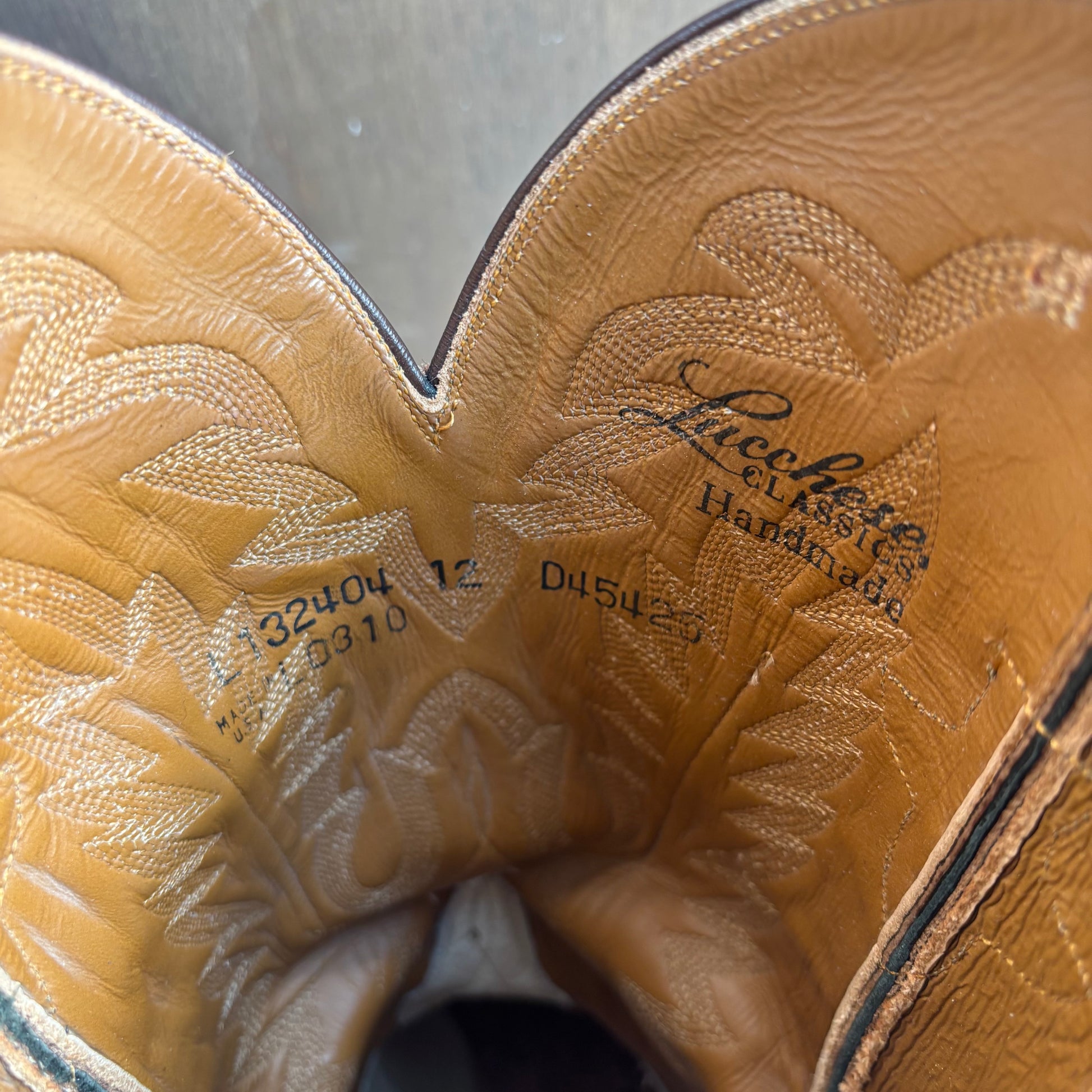 Beautiful Lucchese two-tone reptile boots in brown crocodile boot in men's 12 / women's 13.5, incredible tail detail down the toe, would be a great men's dress boot.