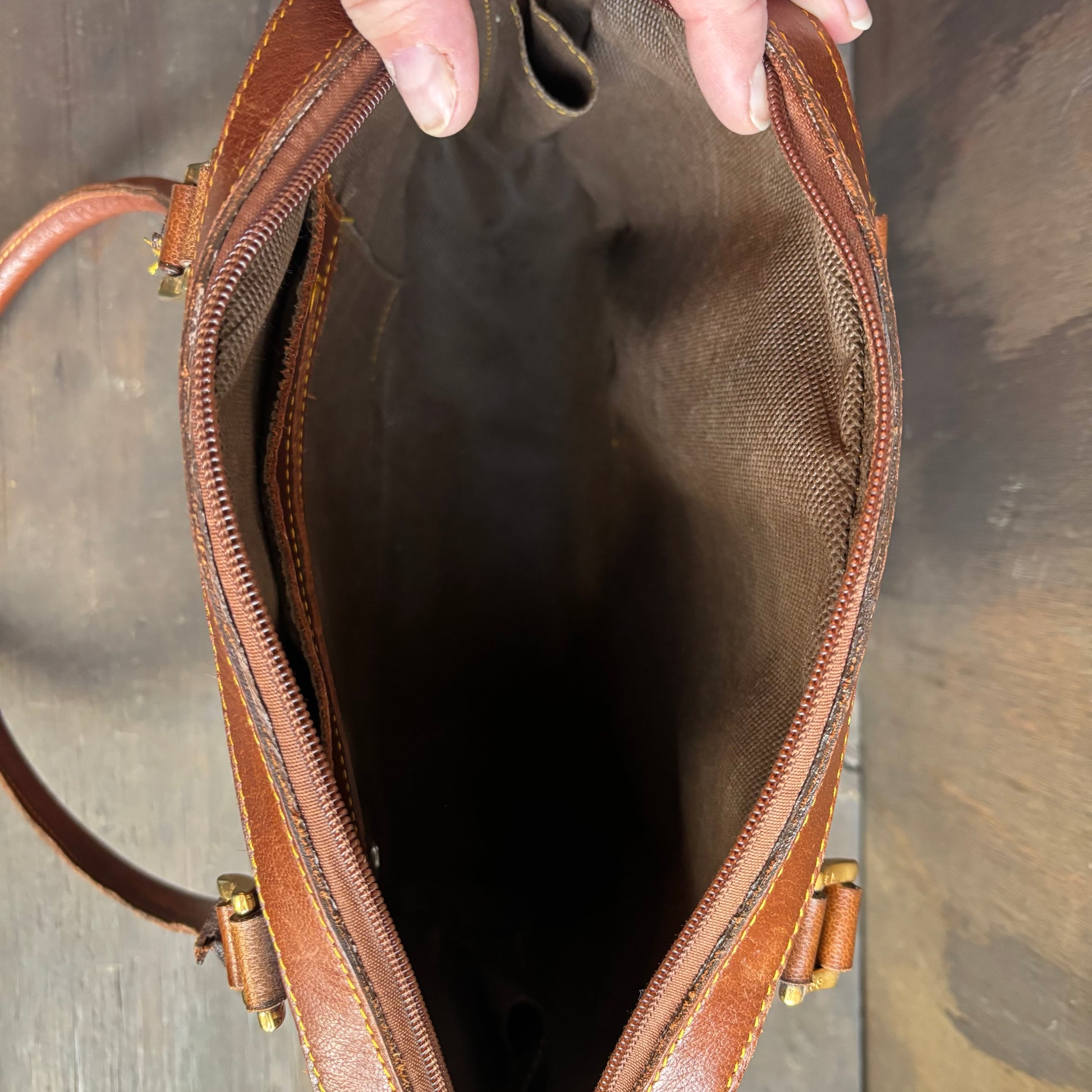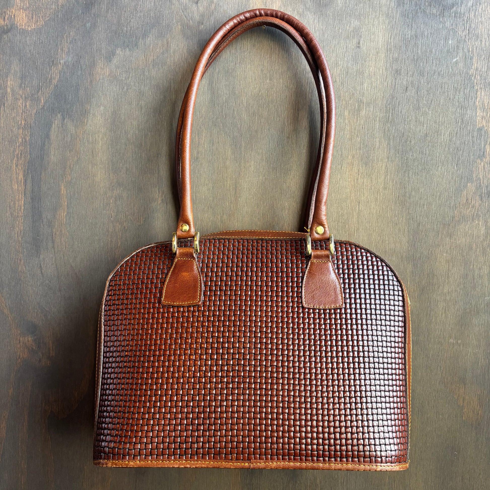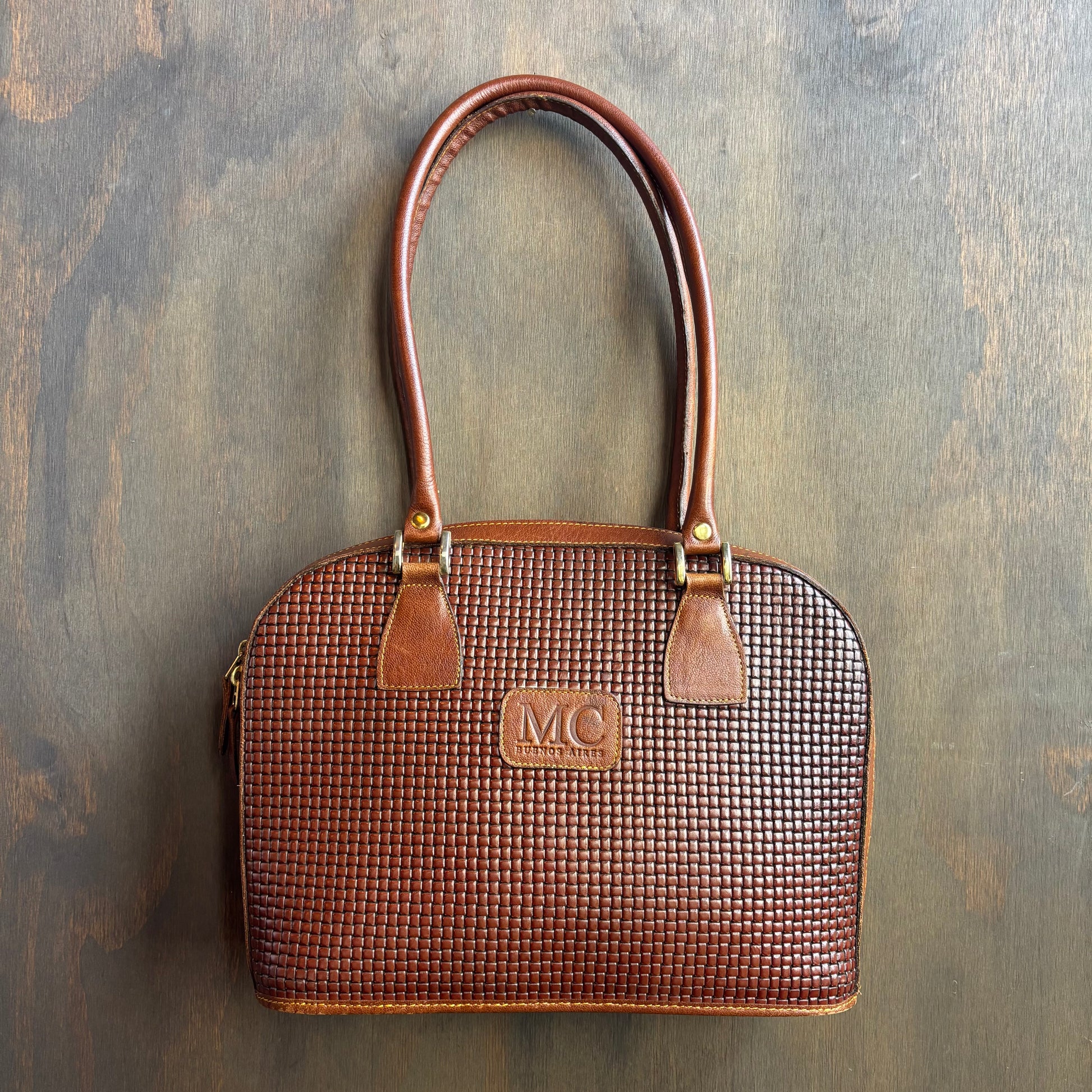 Beautiful luggage colored woven leather bag with full top zip and interior pockets, a neutral and classic style, made in Argentina.