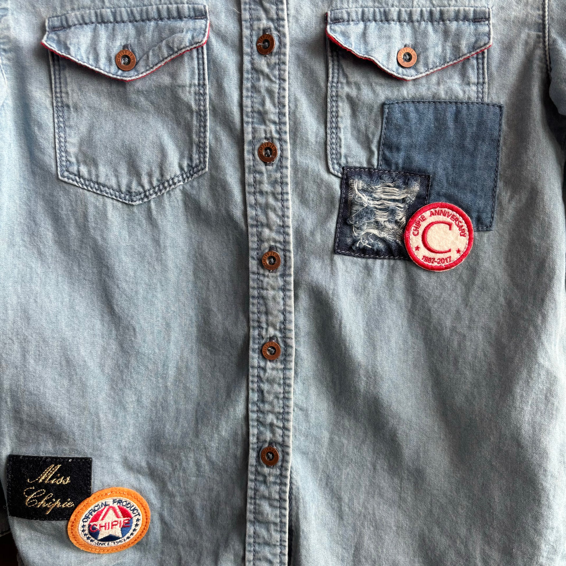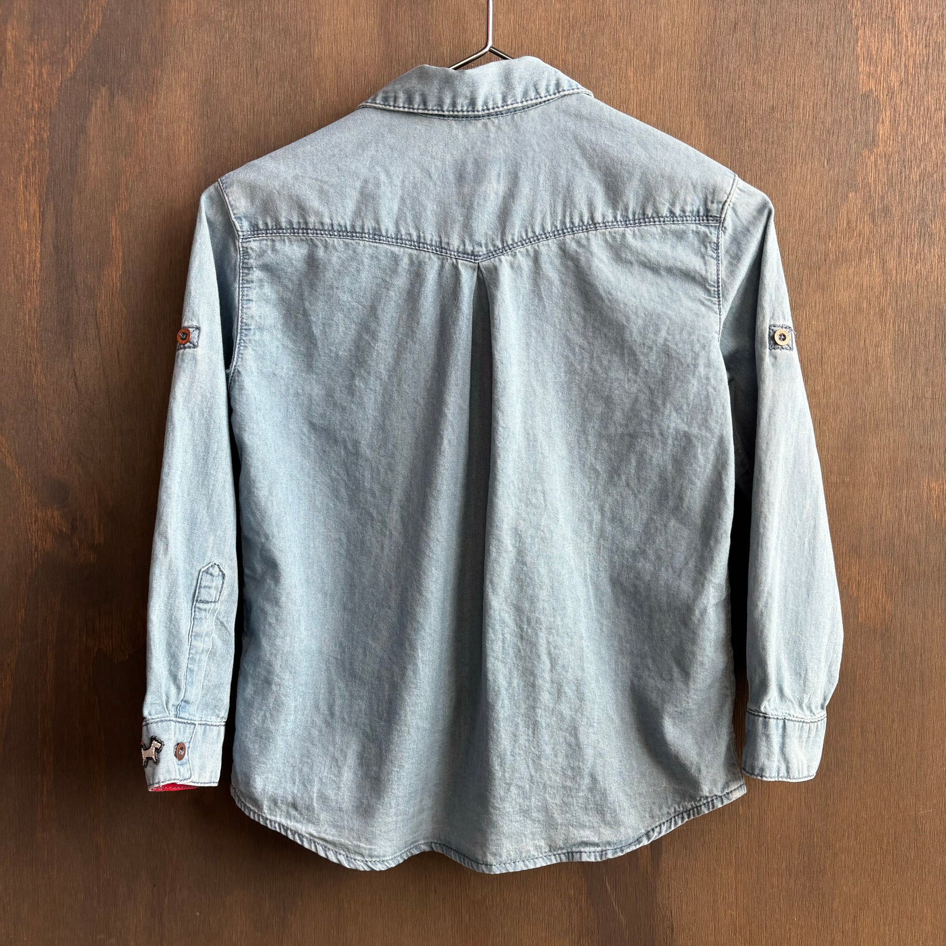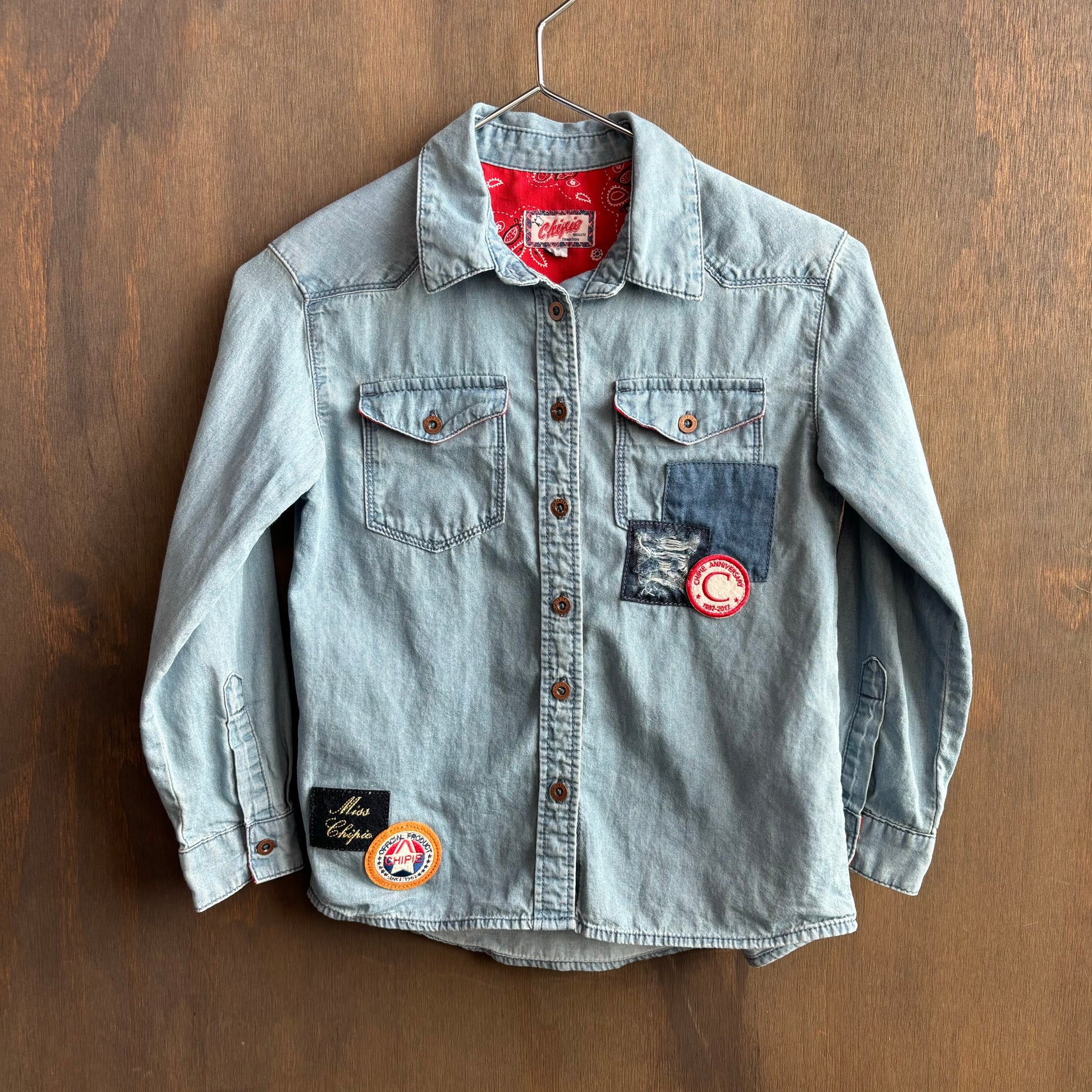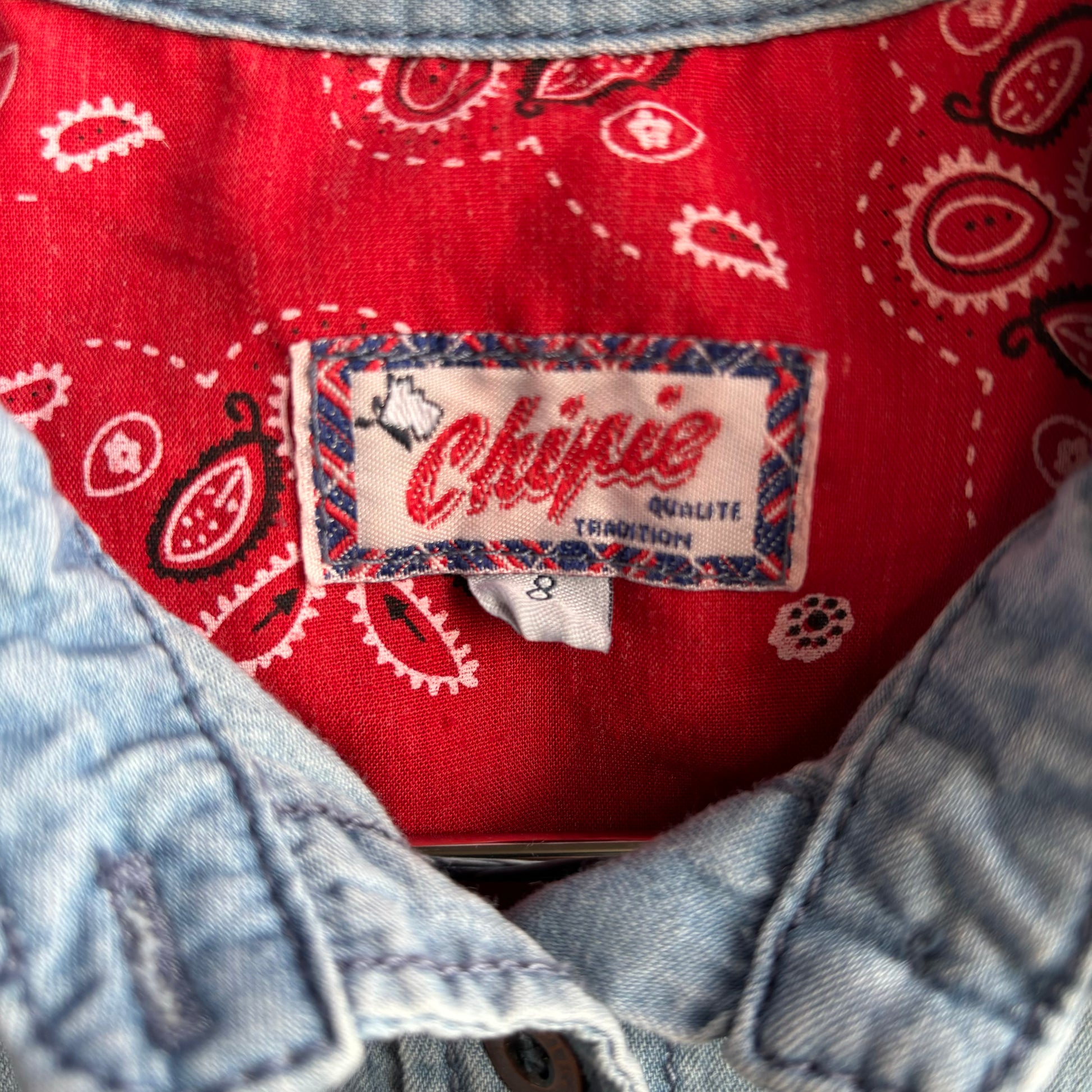 Adorable light colored denim shirt by Miss Chipie brand with cute patches. Size 8, in great condition. Perfect for your little cowboy or cowgirl!