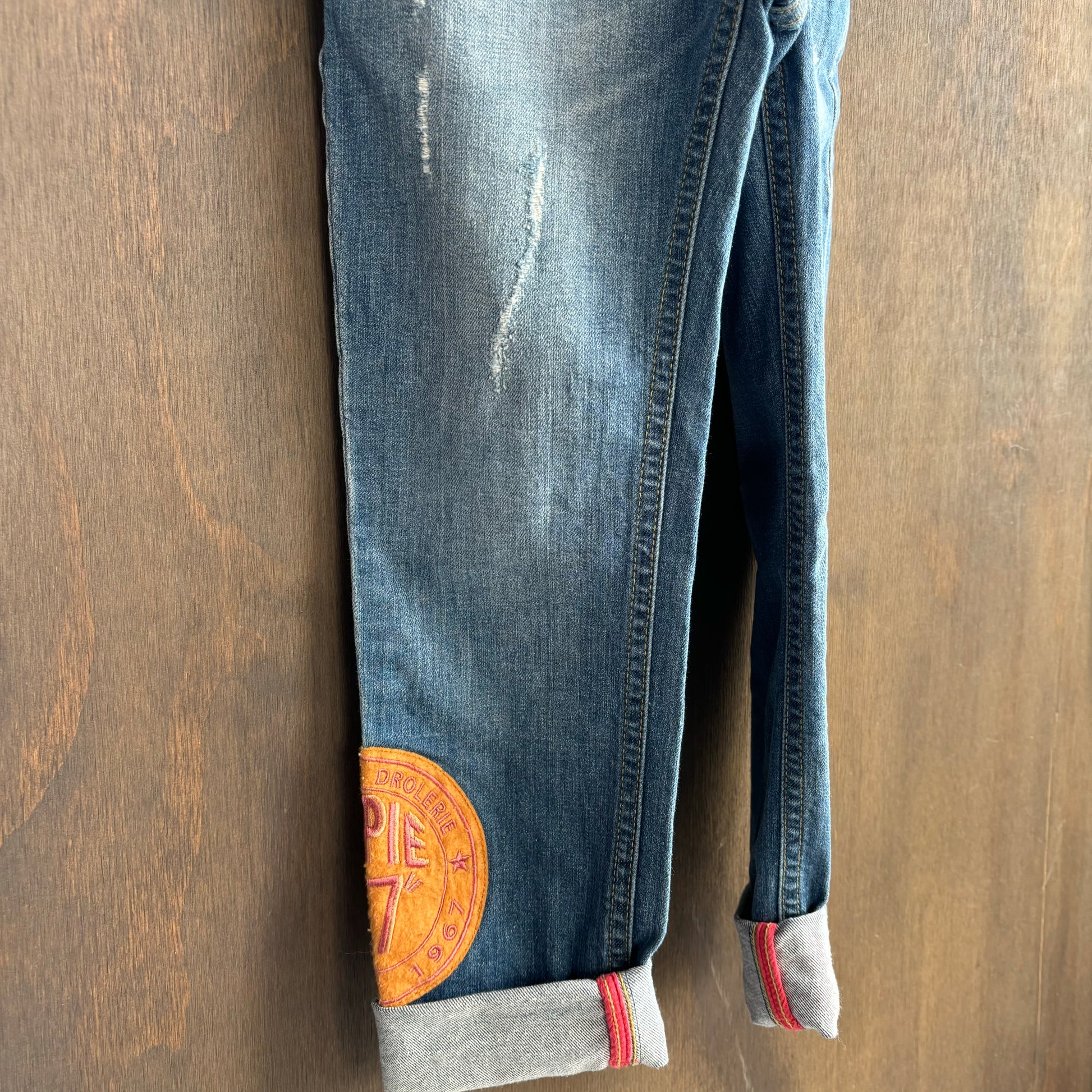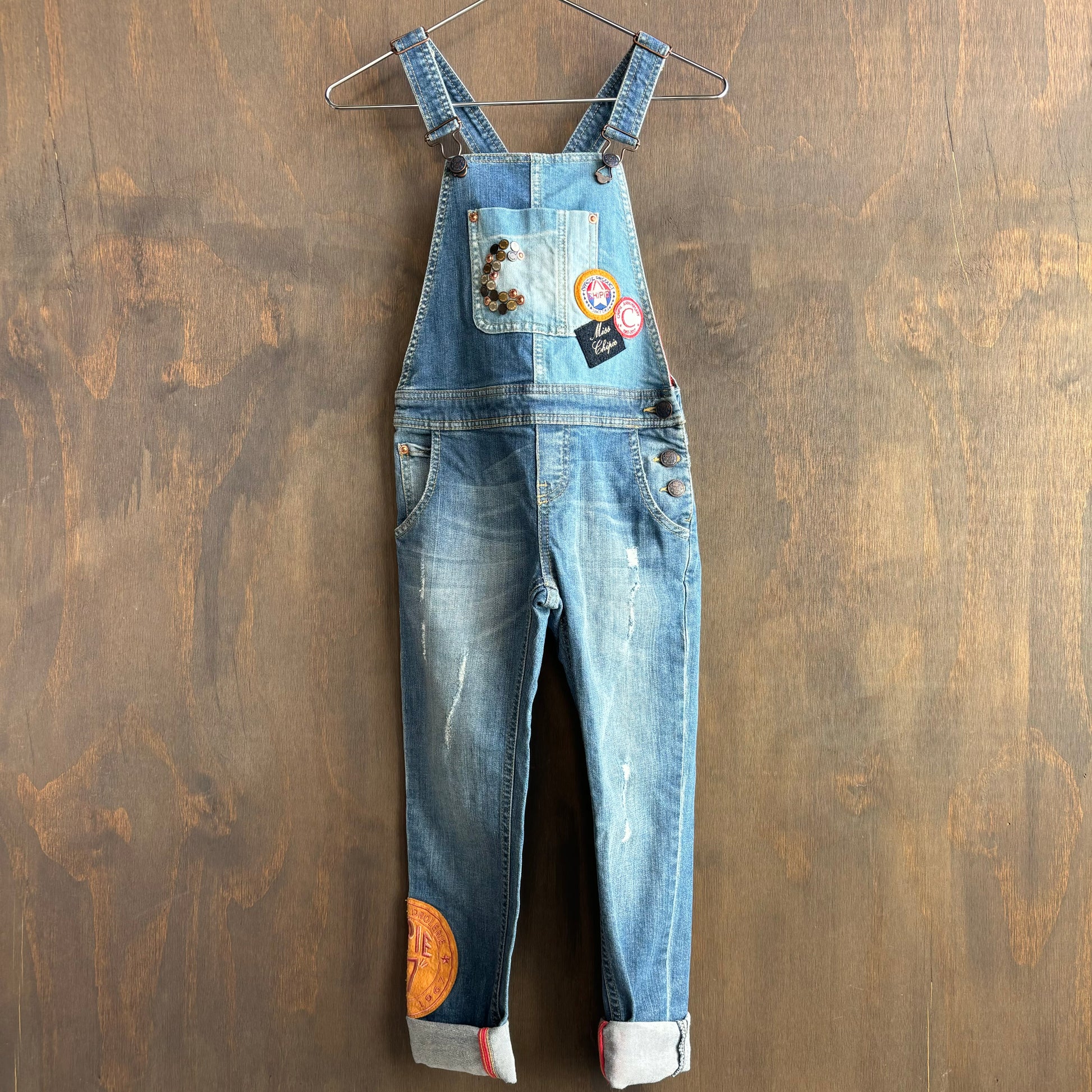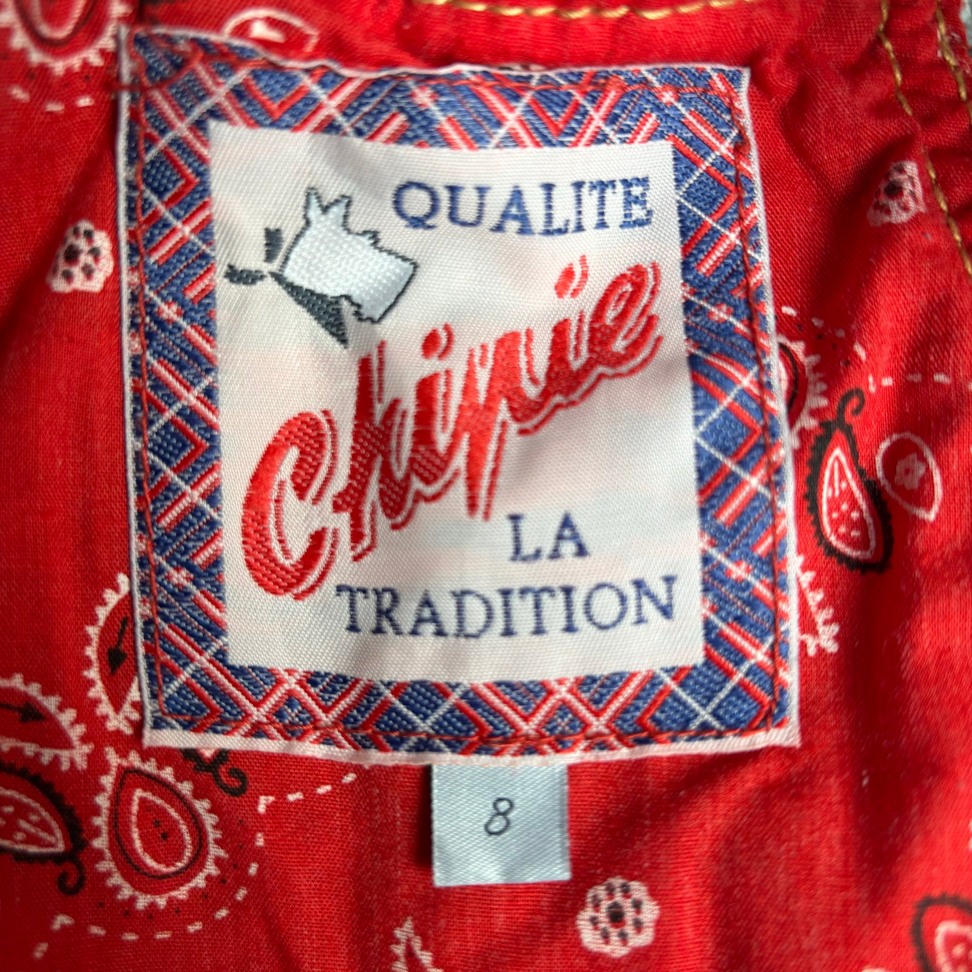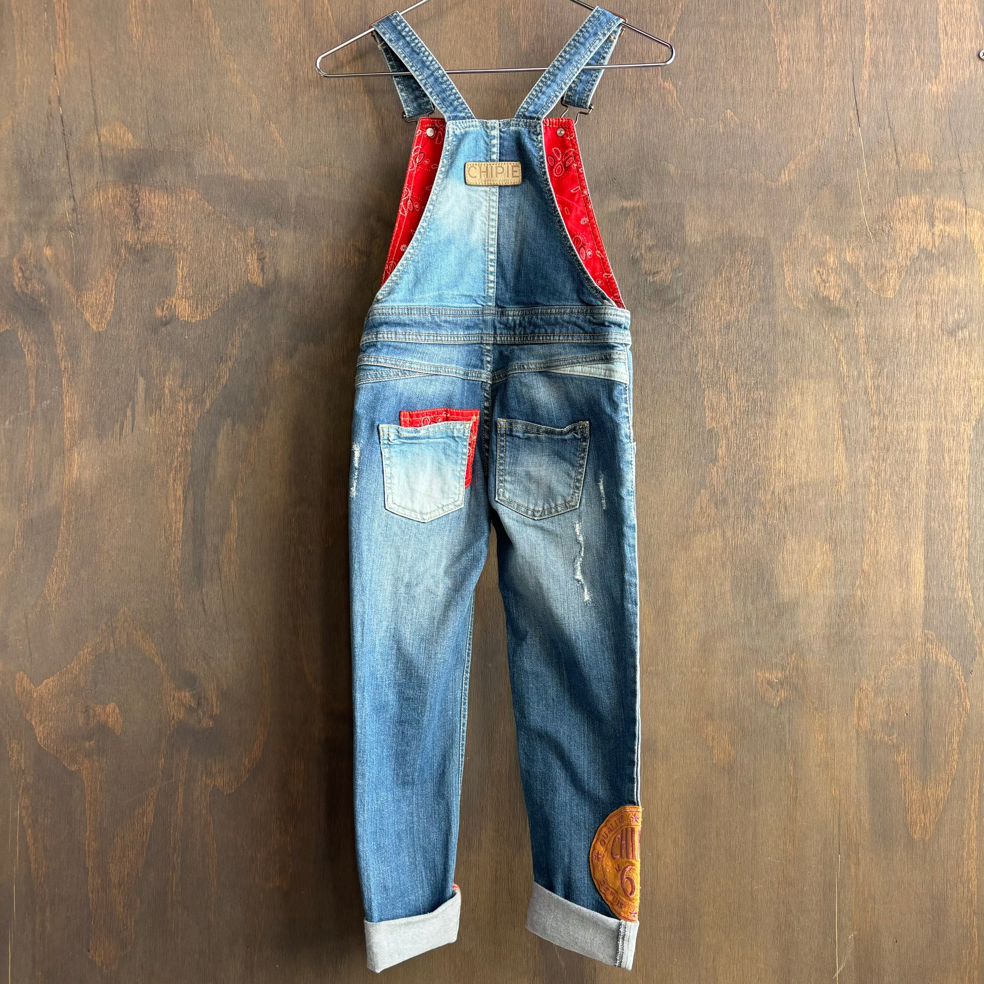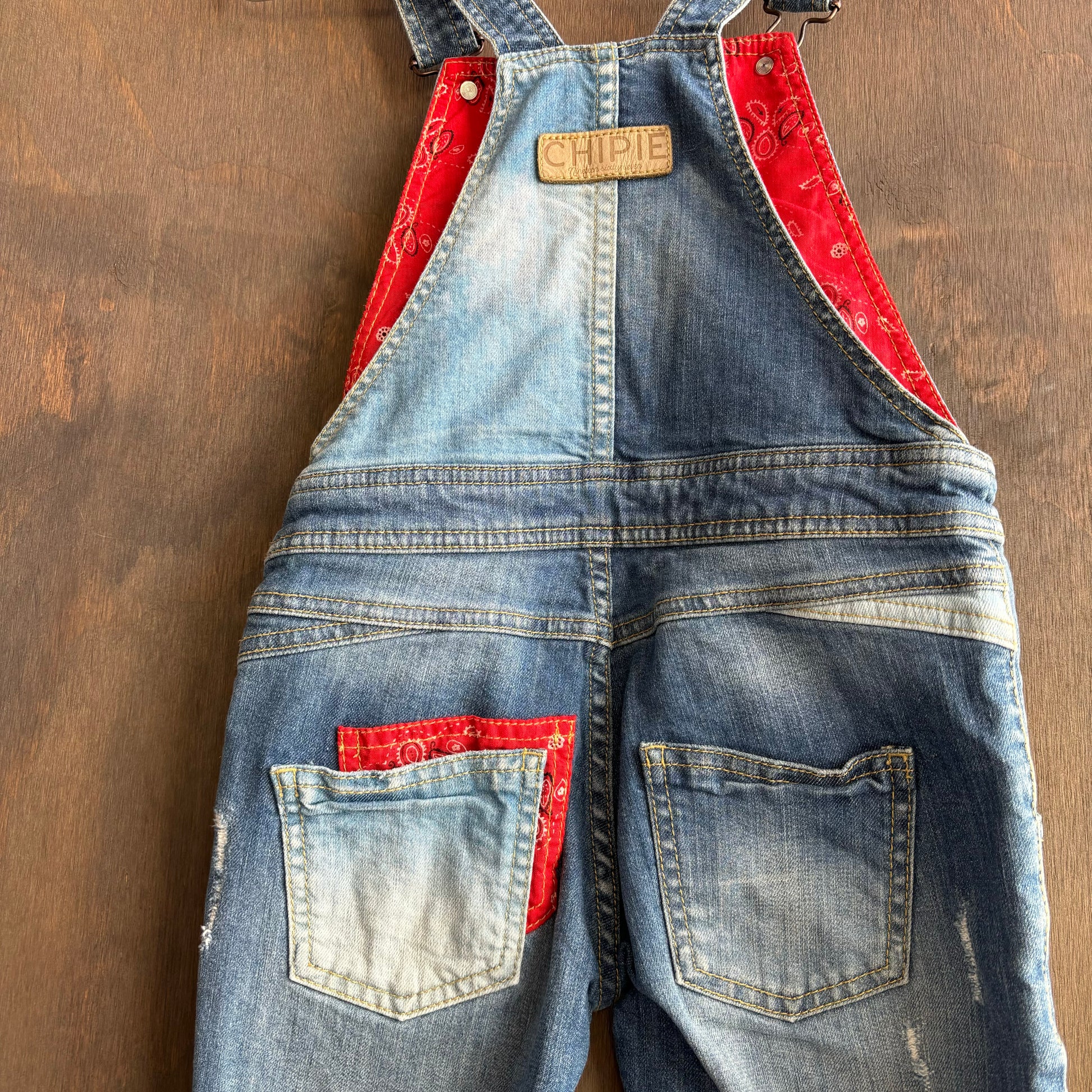 Adorable kids Miss Chipie brand overalls with riveting details and patches lined with fun red Paisley print, size 8. Perfect for your little cowgirl!