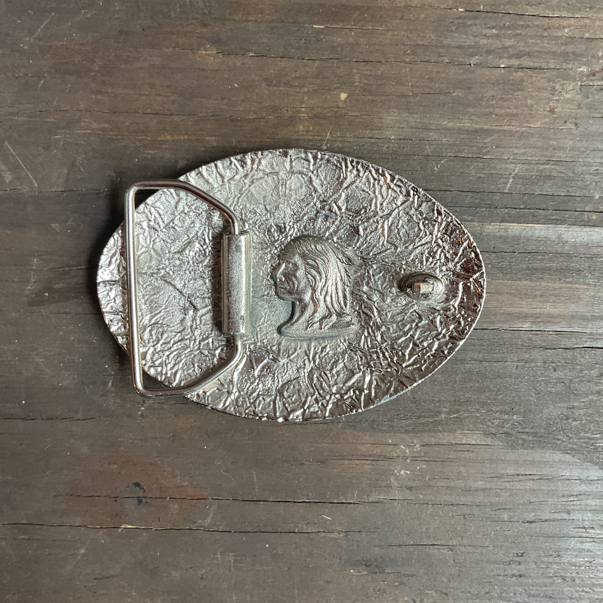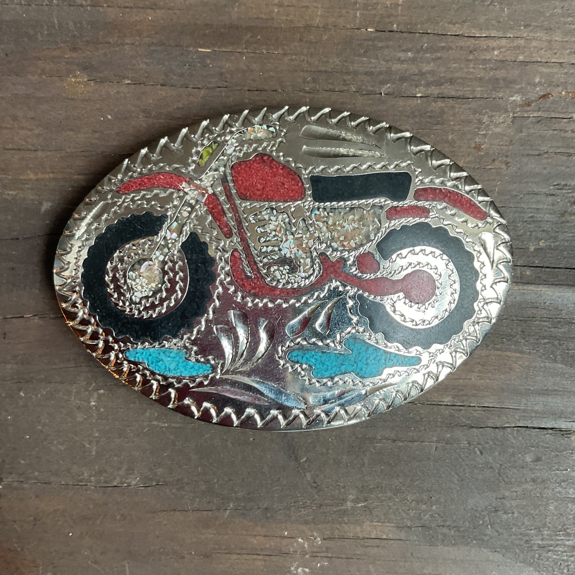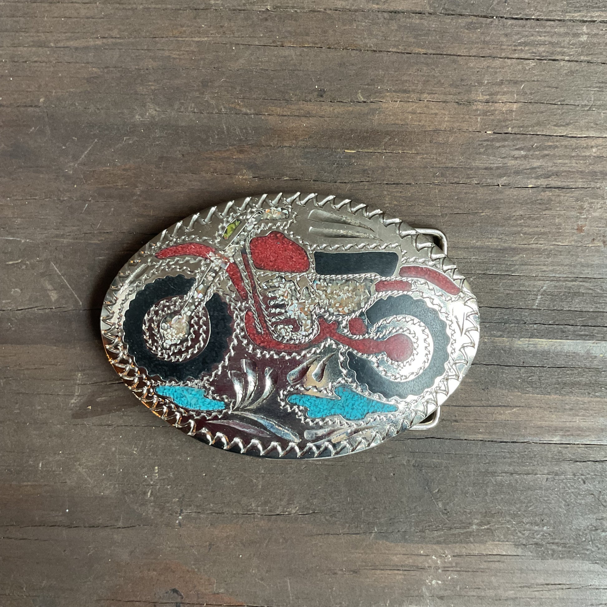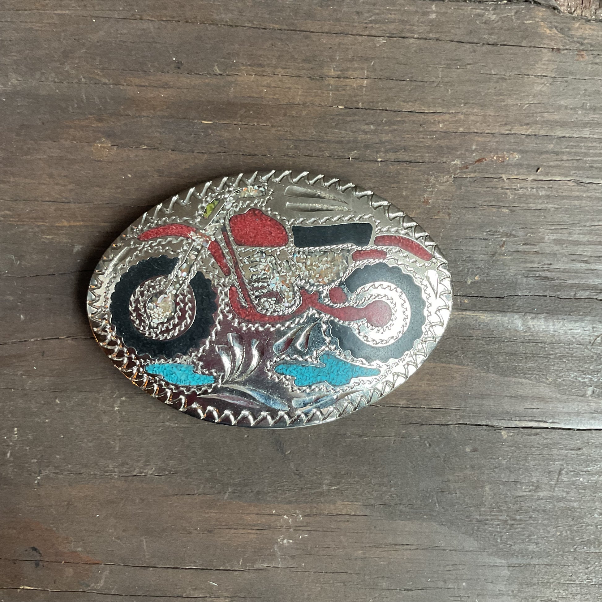 Pretty vintage belt with an abstract style motorcycle, made from stone chips. In great vintage condition. 4" across.