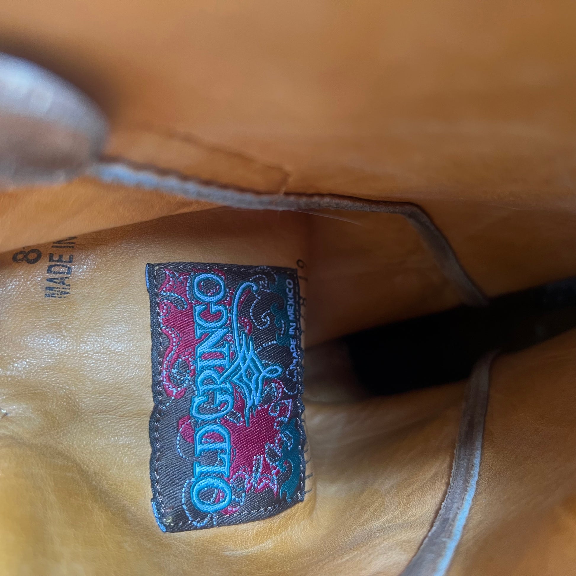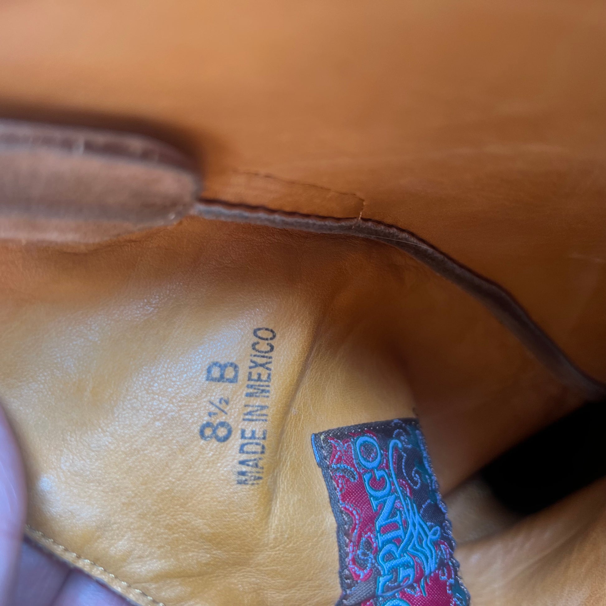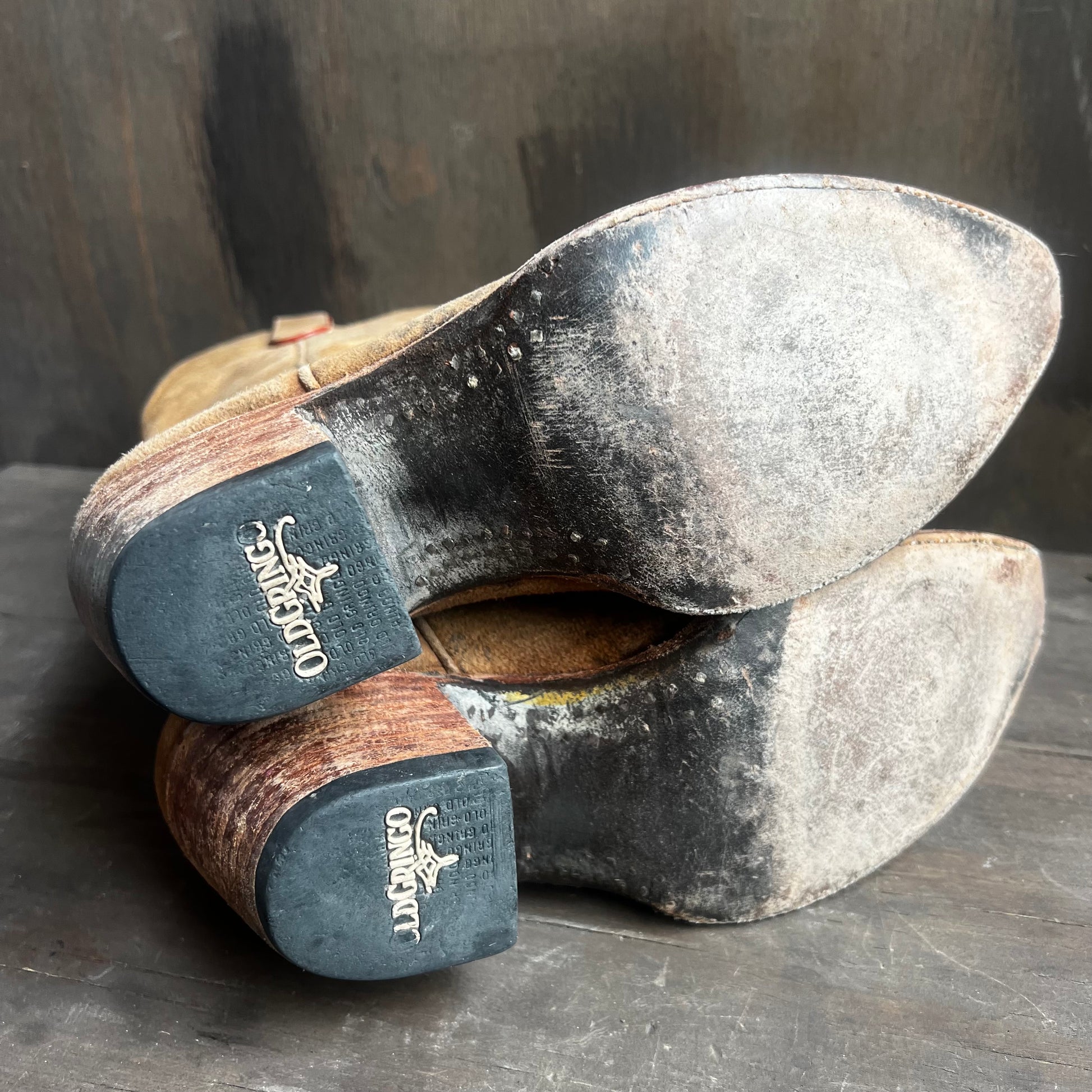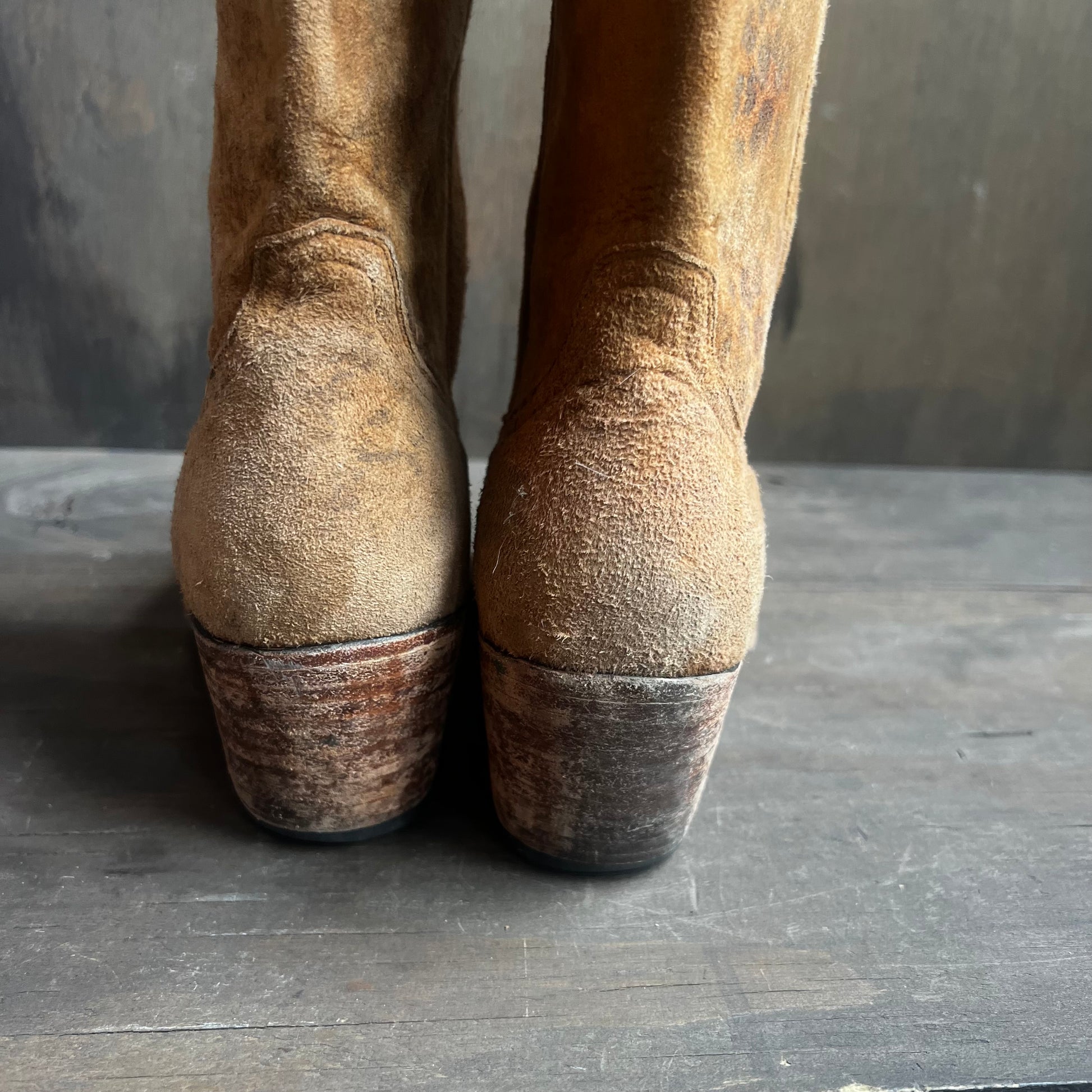 Beautiful tan boots made from suede. The boots have a subtle cheetah print pattern, a 2” heel, and a red lining embellishment on the boot pulls. In great condition. Men’s 8.5, women’s 10.