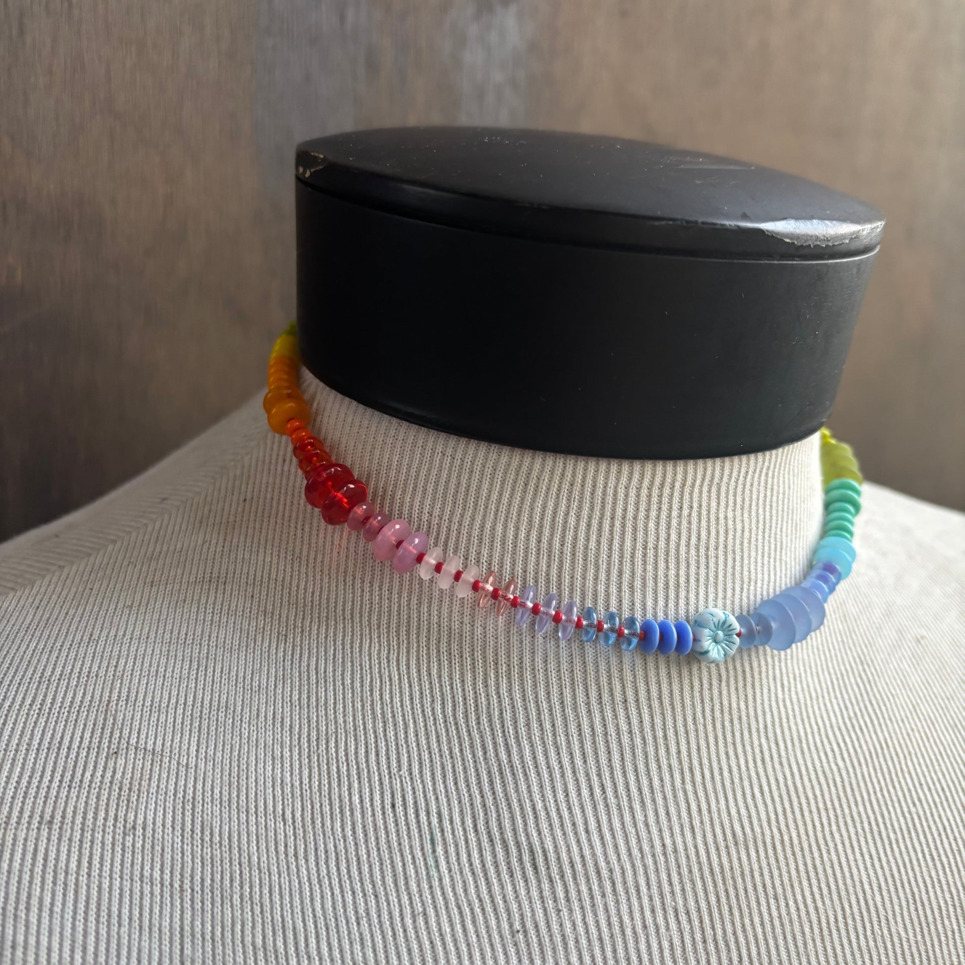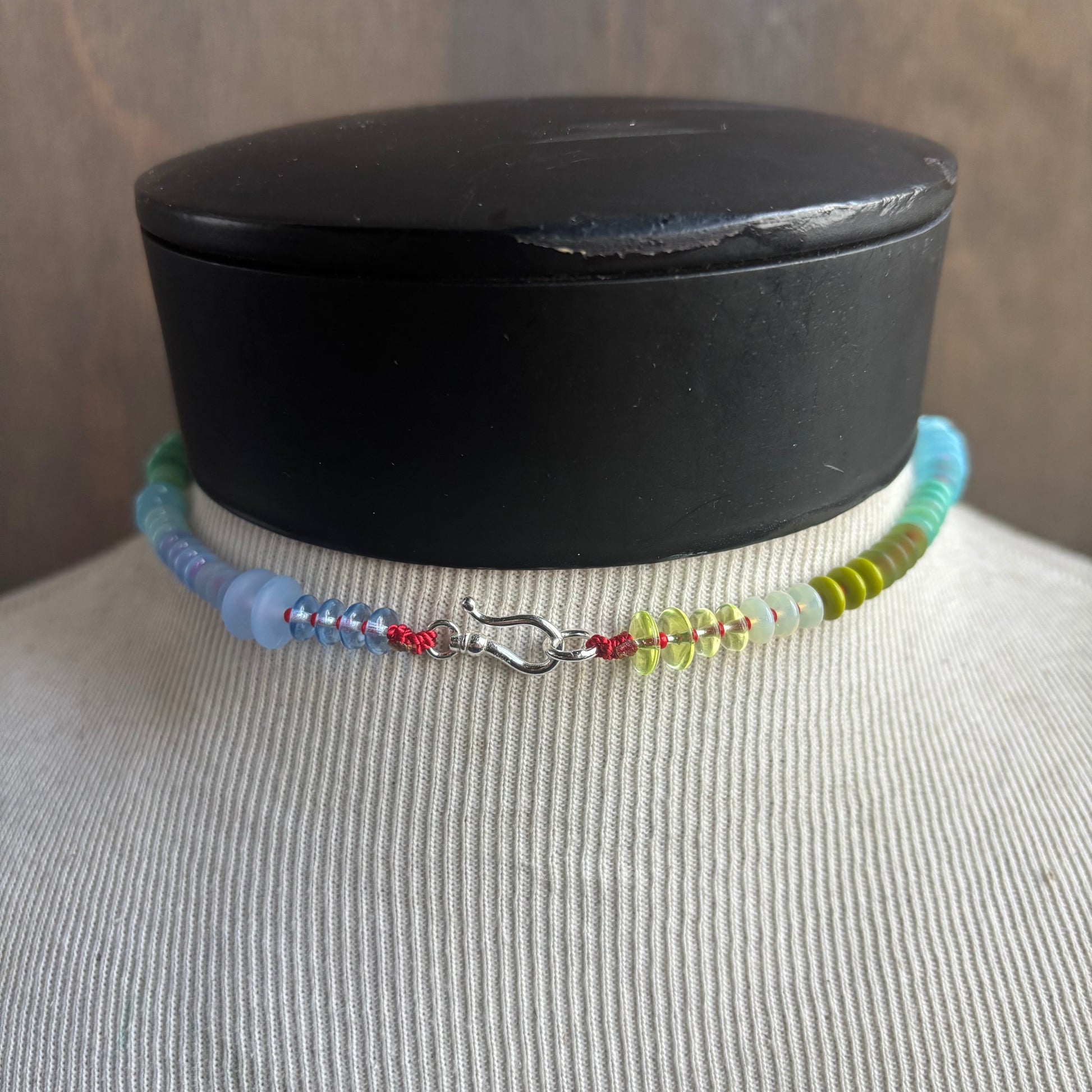 All glass beads with randomly found vintage beads scattered throughout with sterling silver clasp.