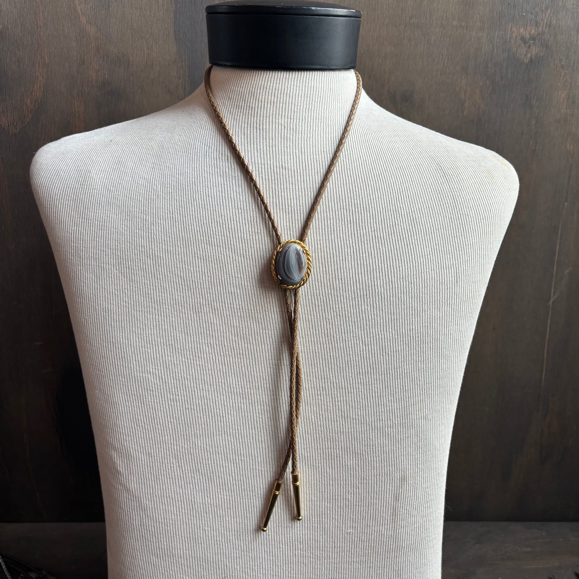 Gorgeous gray toned Botswana Agate stone on a gold tone setting with a beige tie and gold toe tips, a beautiful and classy style.