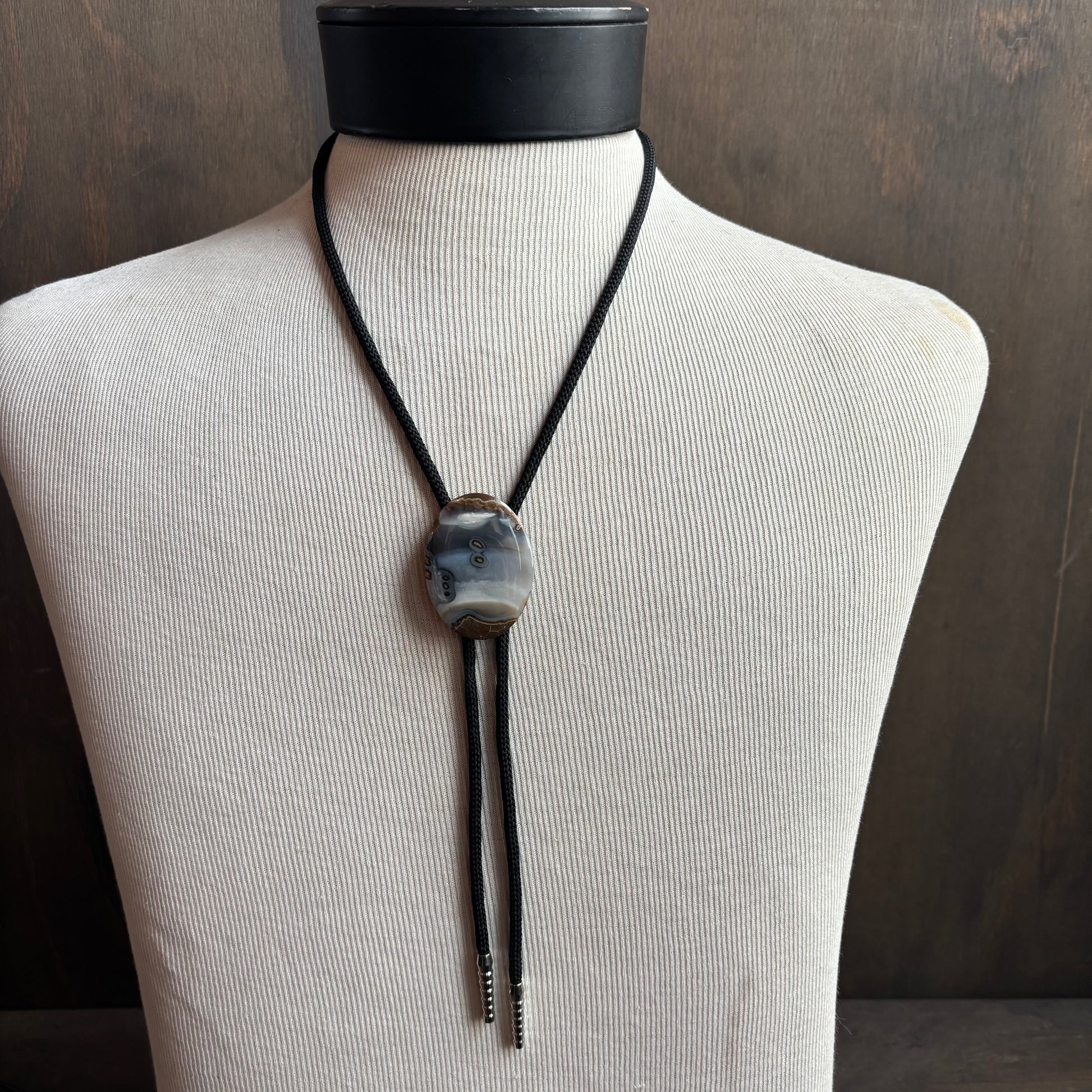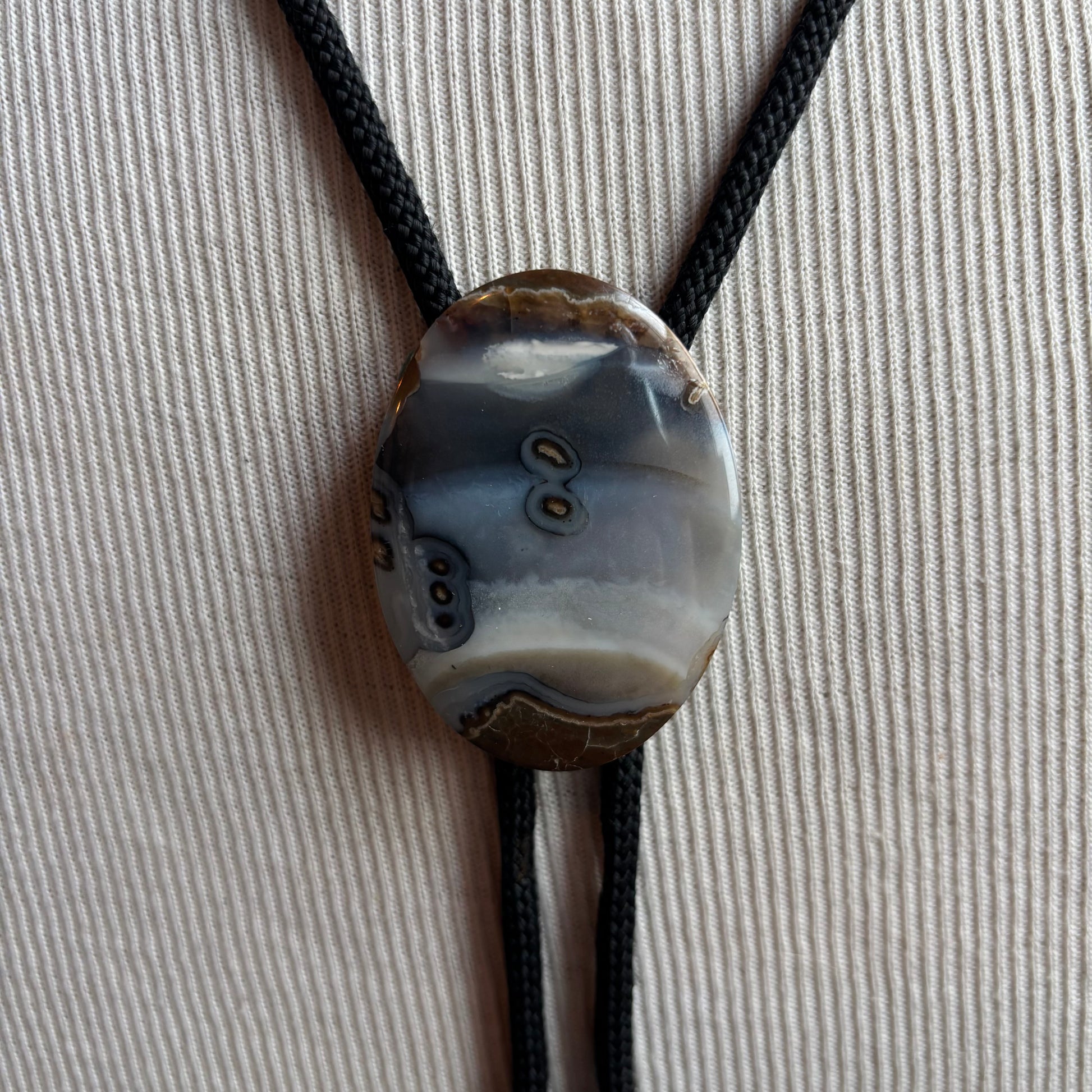 Beautiful, polished Striped (Banded) Agate bolo with no setting on a black tie with silver tips.