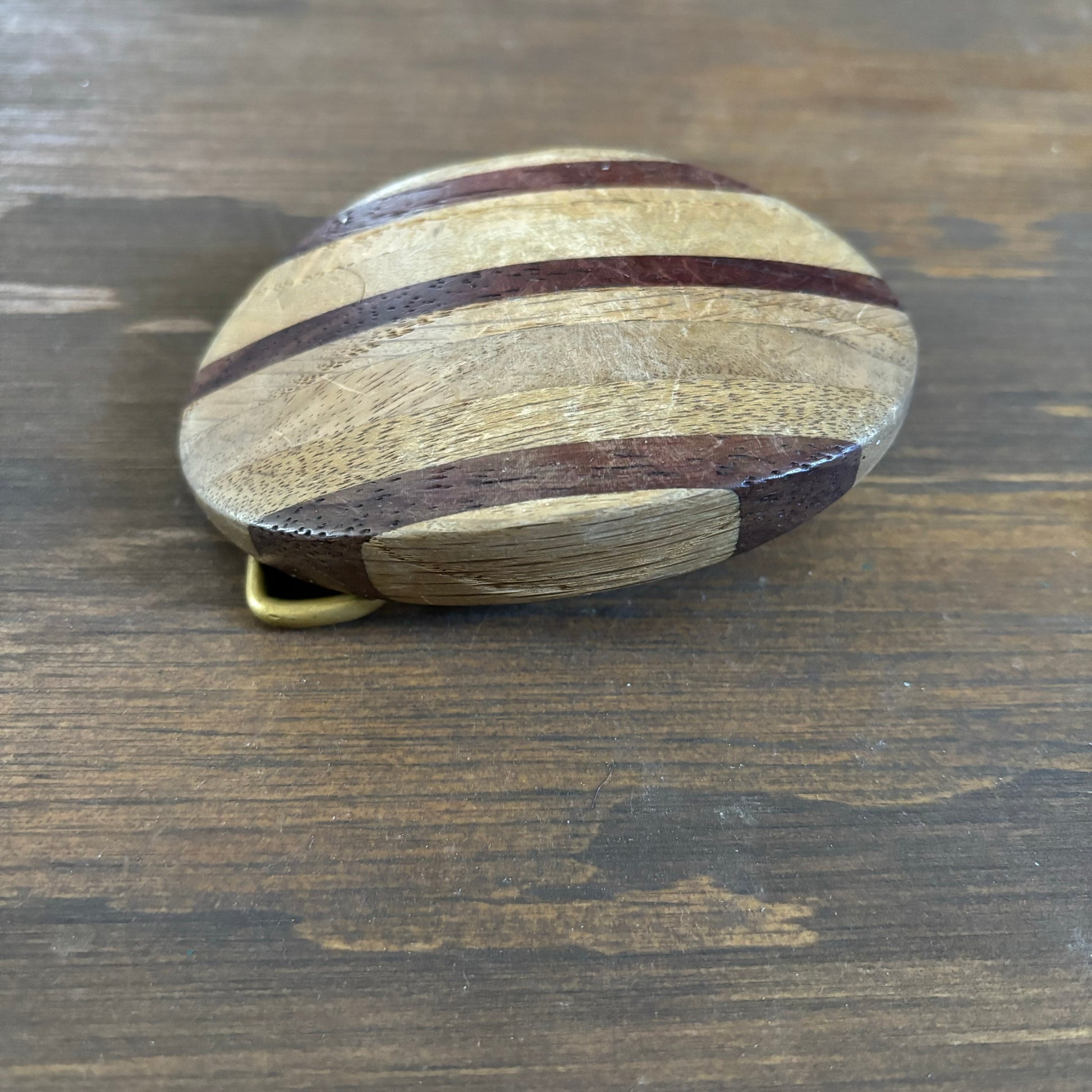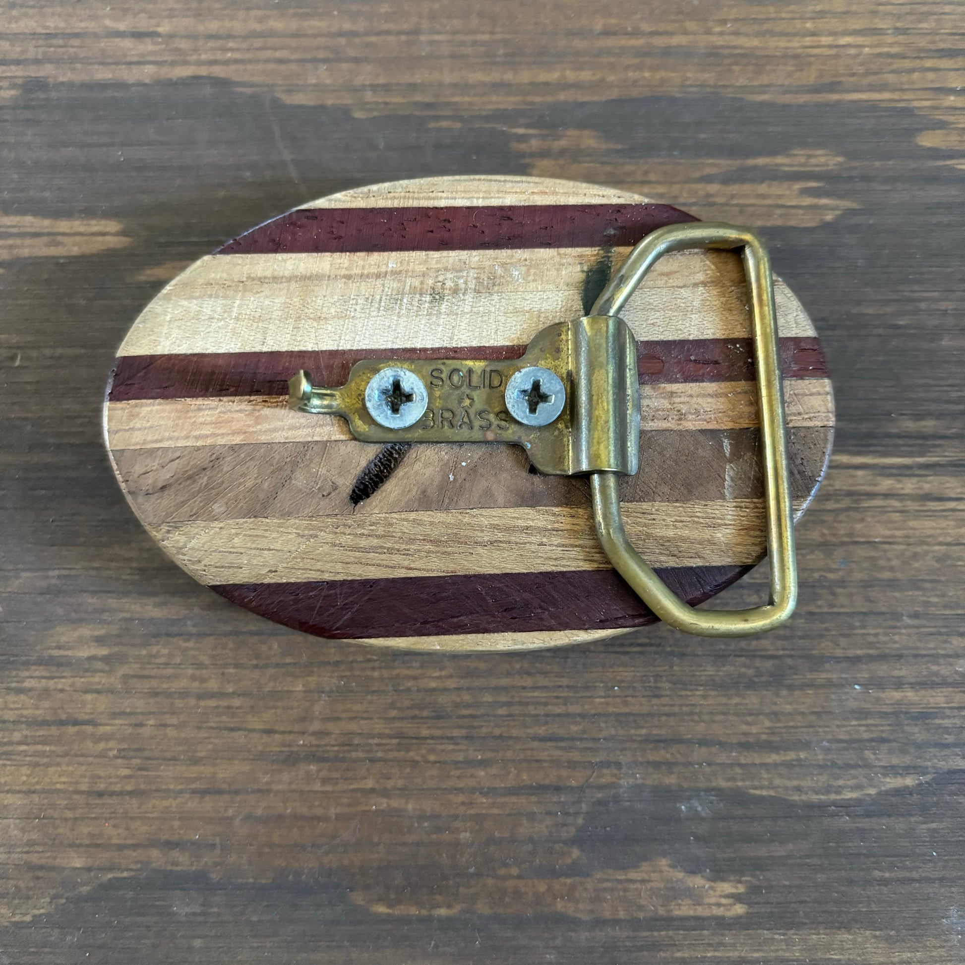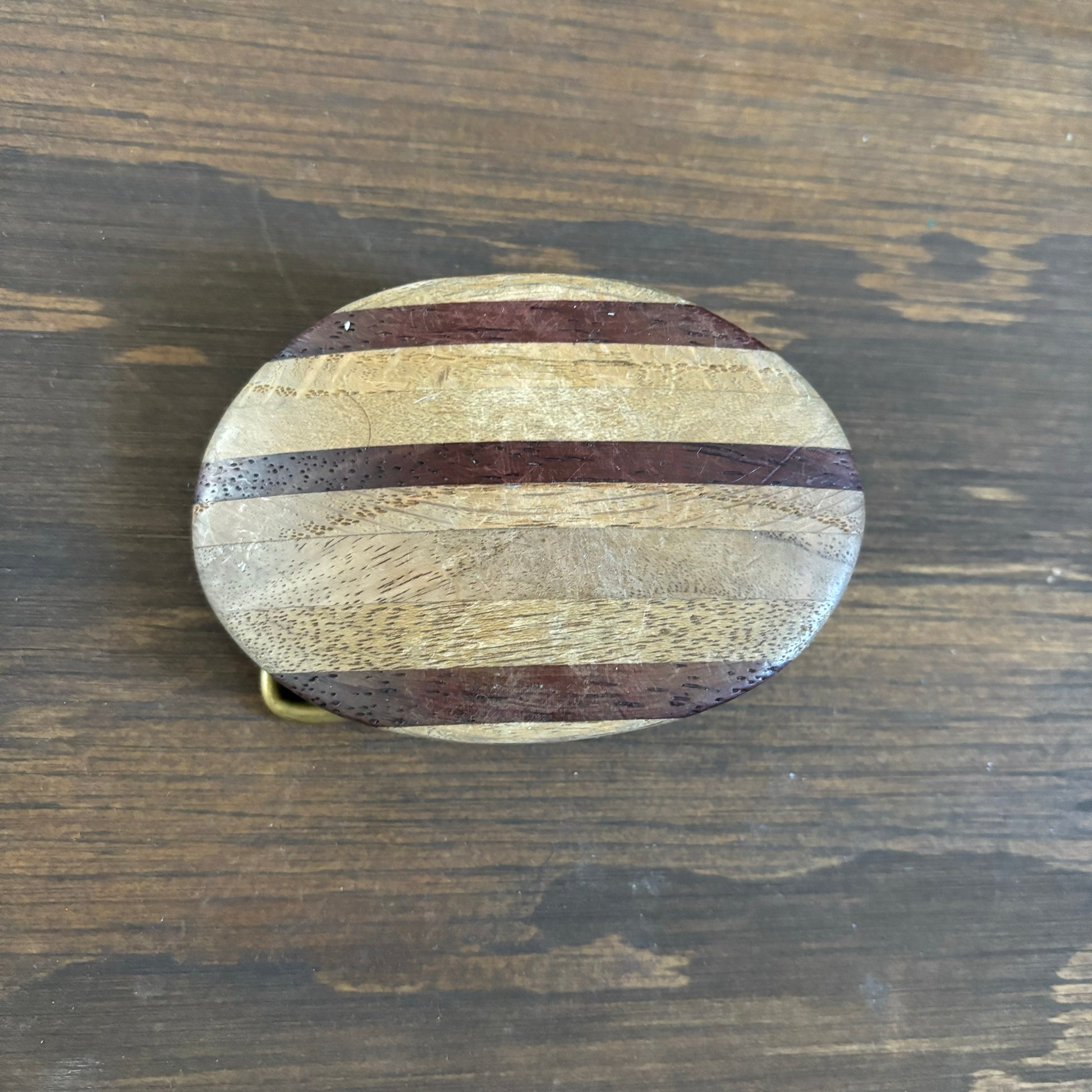 Handmade oval -shaped belt buckle featuring two kinds of wood and a solid brass buckle. 2.5 x 4”