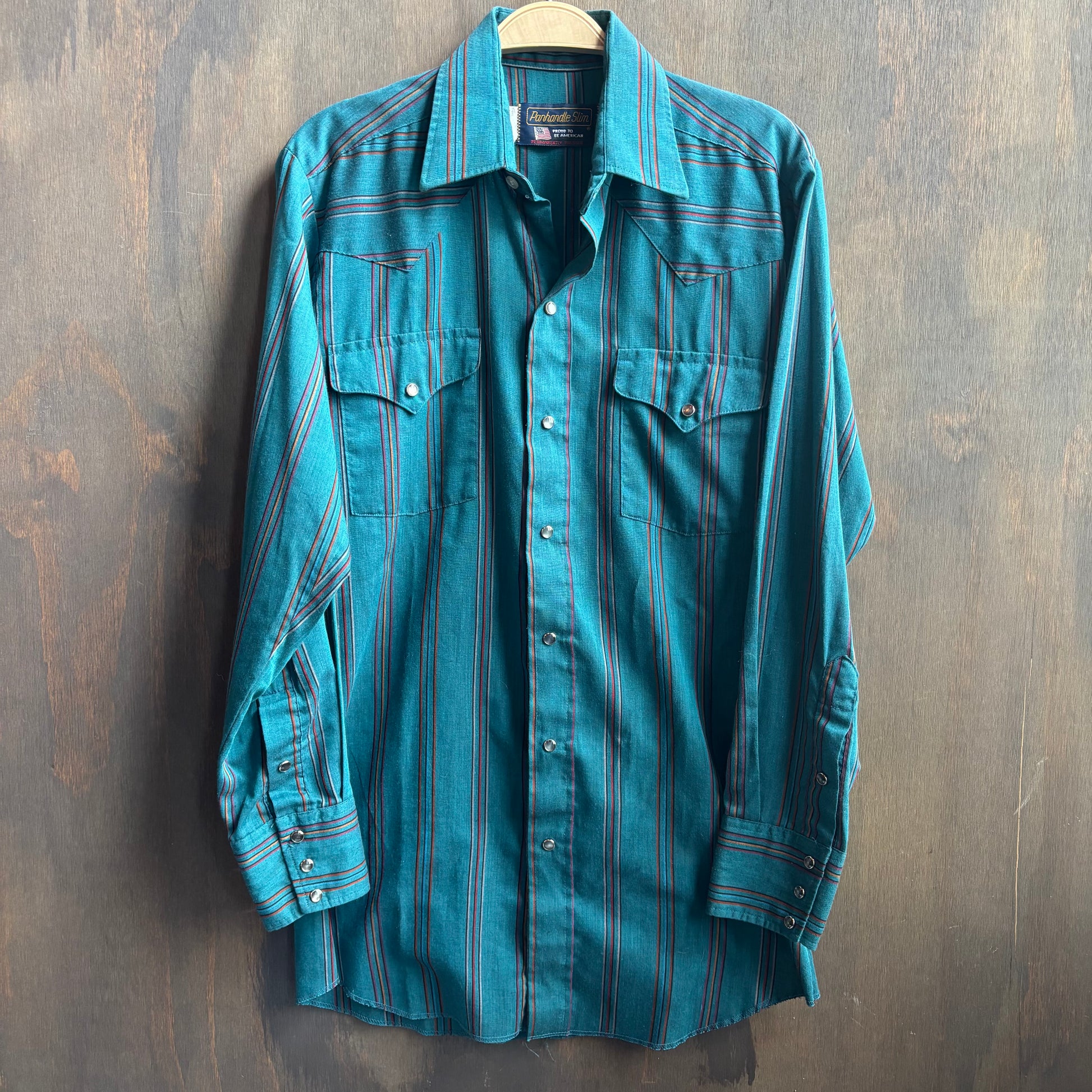Good looking and classic Panhandle Slim teal striped pearl snap shirt in great vintage condition, size 15 33 / M