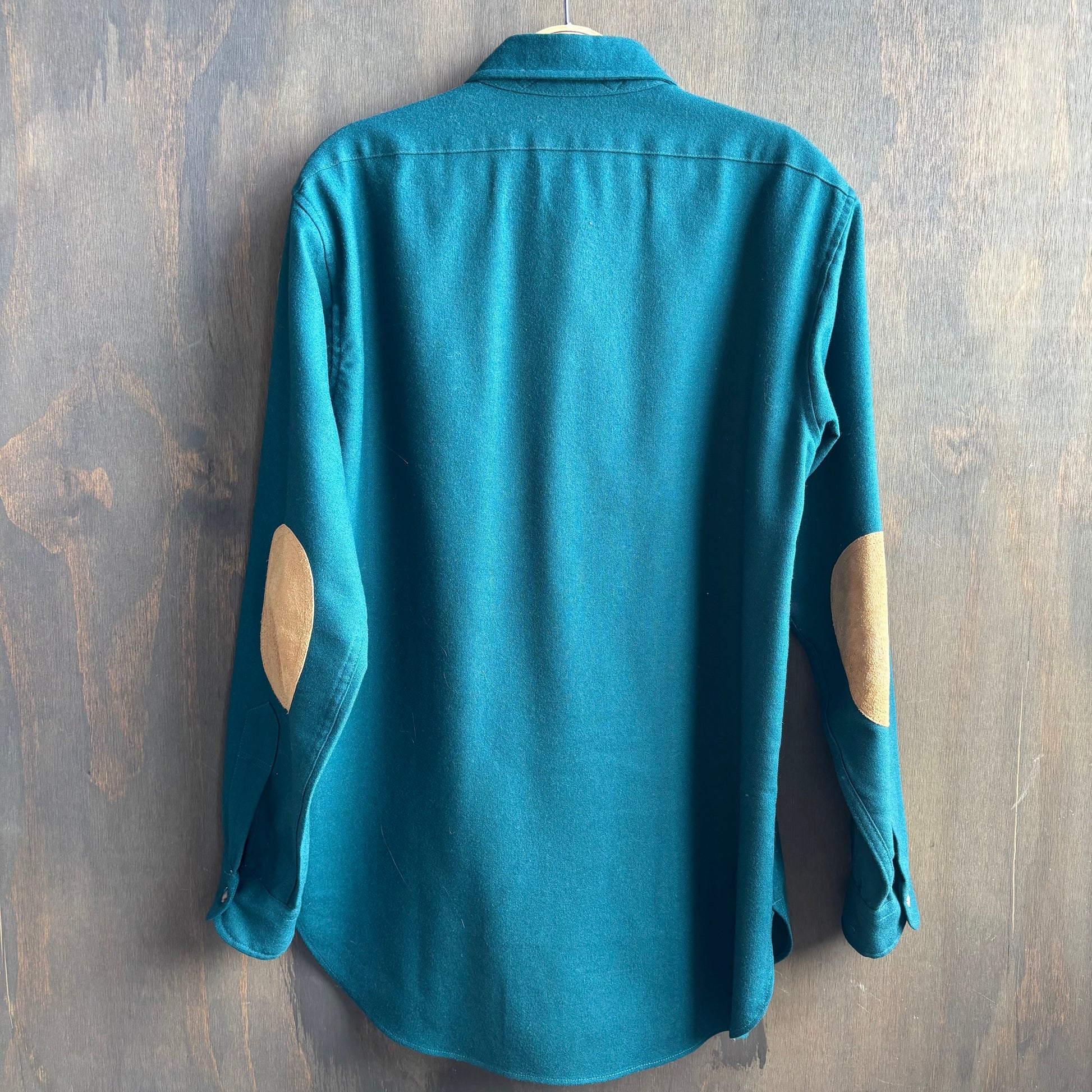 Iconic US brand Pendleton teal wool shirt in great condition featuring beige leather elbow patches, size M
