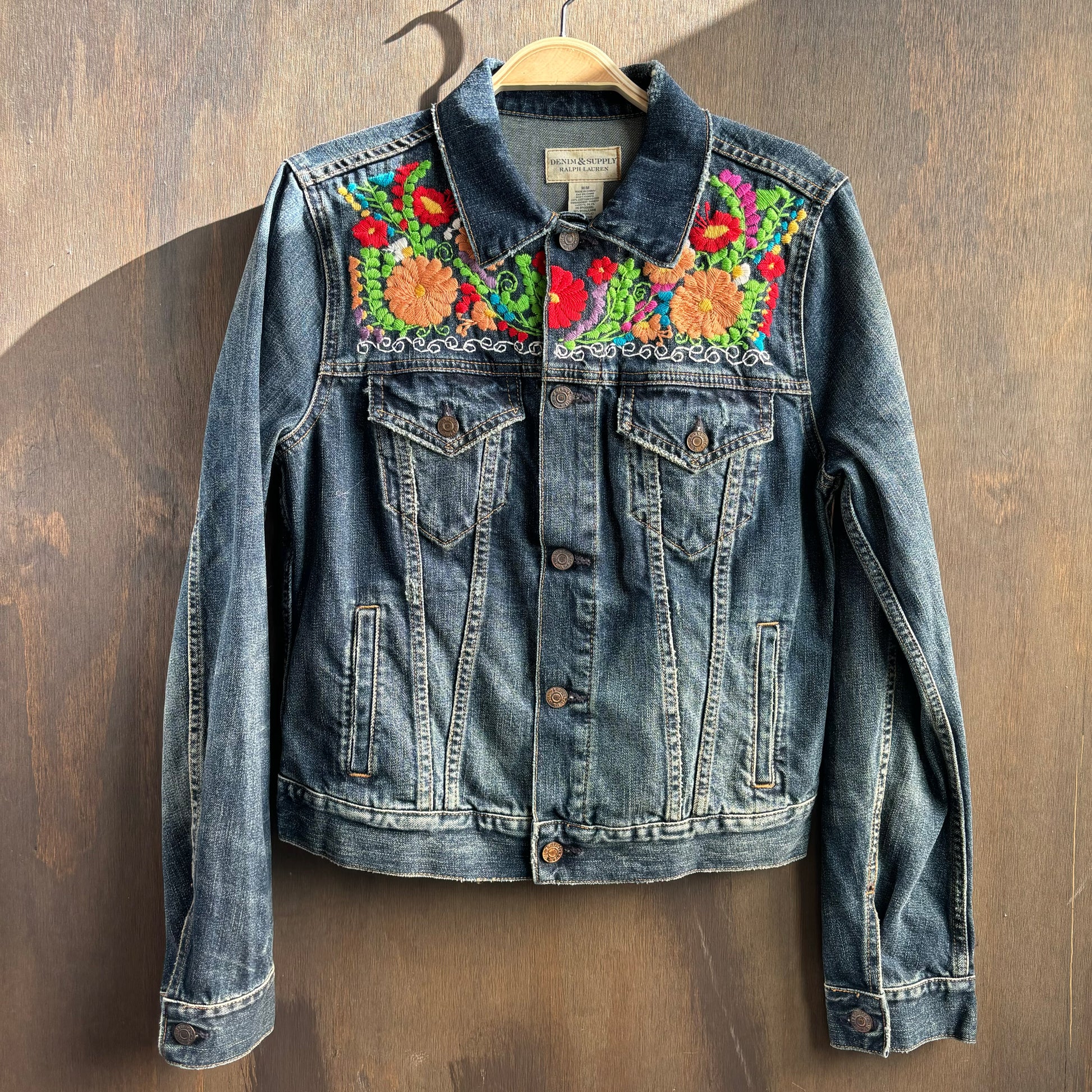 Denim & Supply by Ralph Lauren embroidered and distressed denim jacket, beautiful colorful floral embroidery on front and back, size medium.