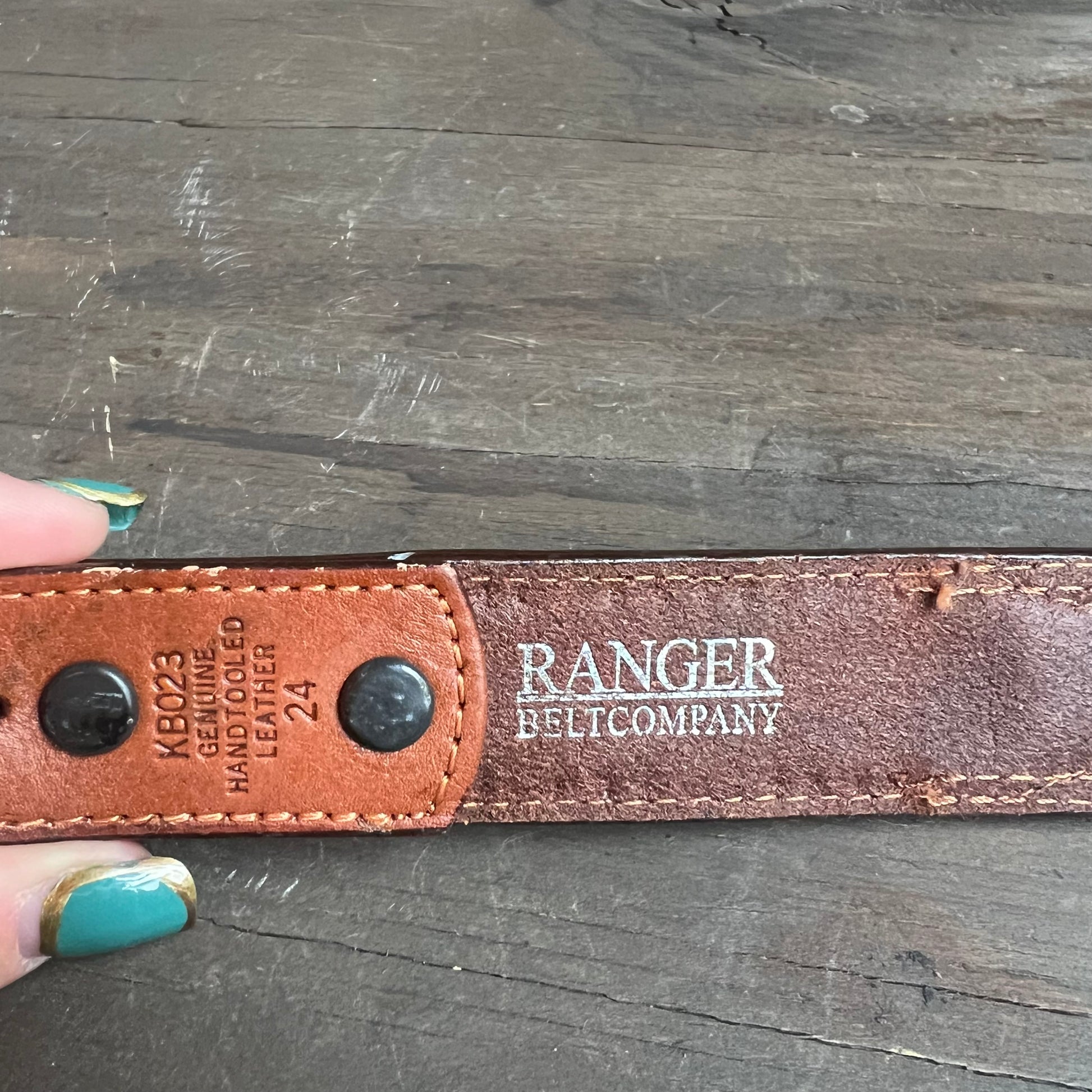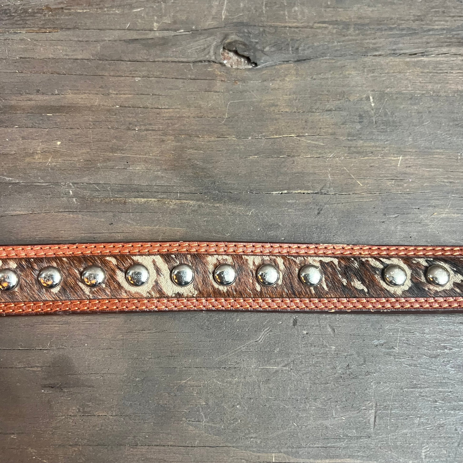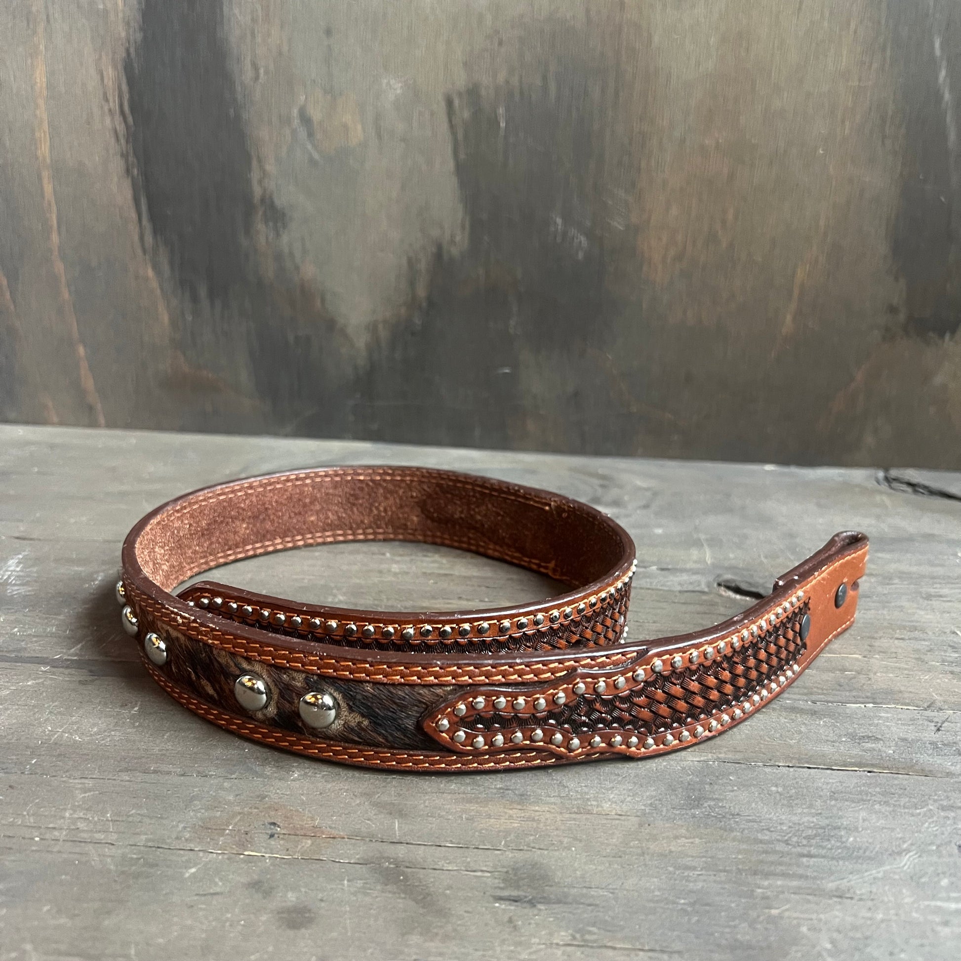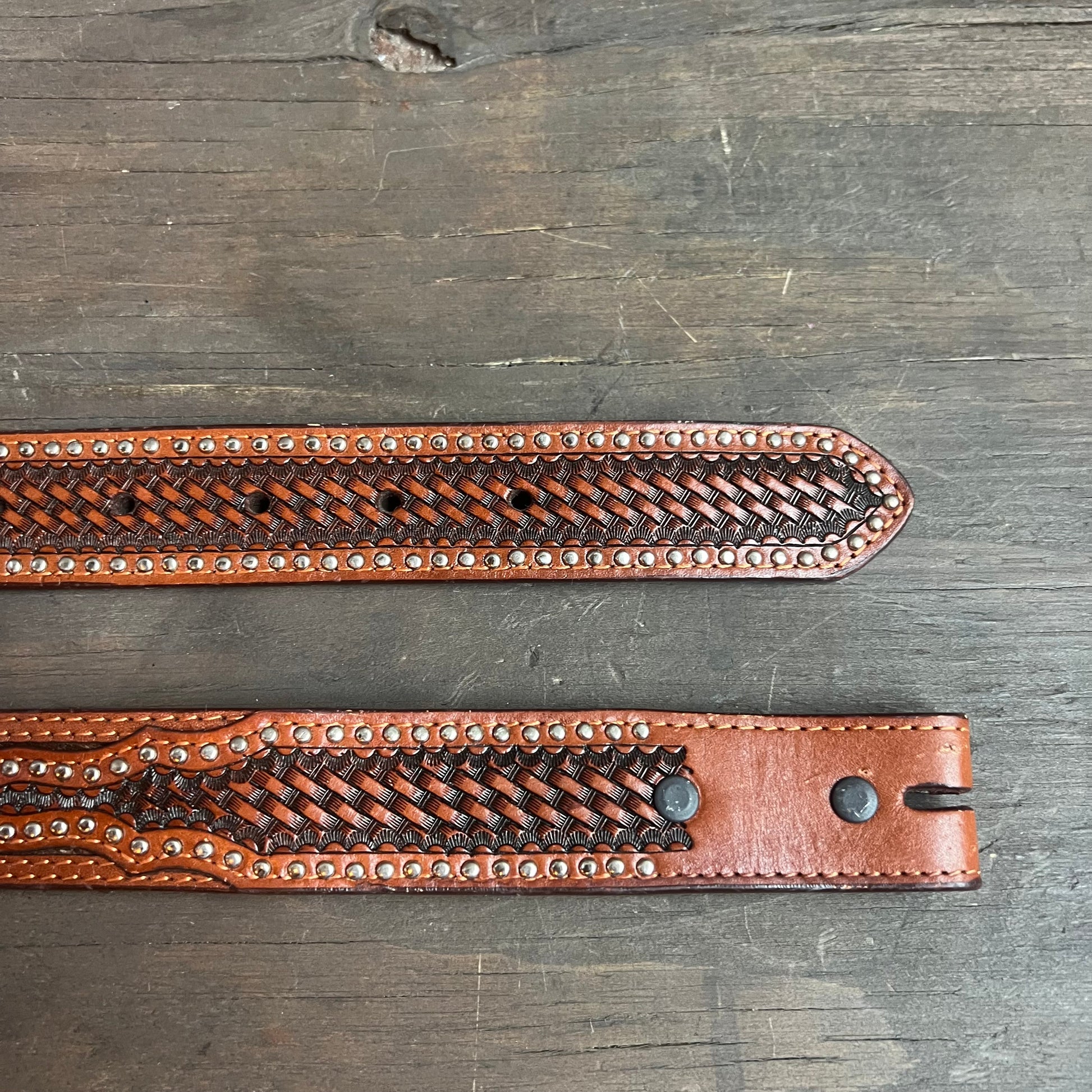 Stunning genuine leather belt with tooled hatch work style designs. The belt also has a cowhide inlay, and is studded with silver studs.