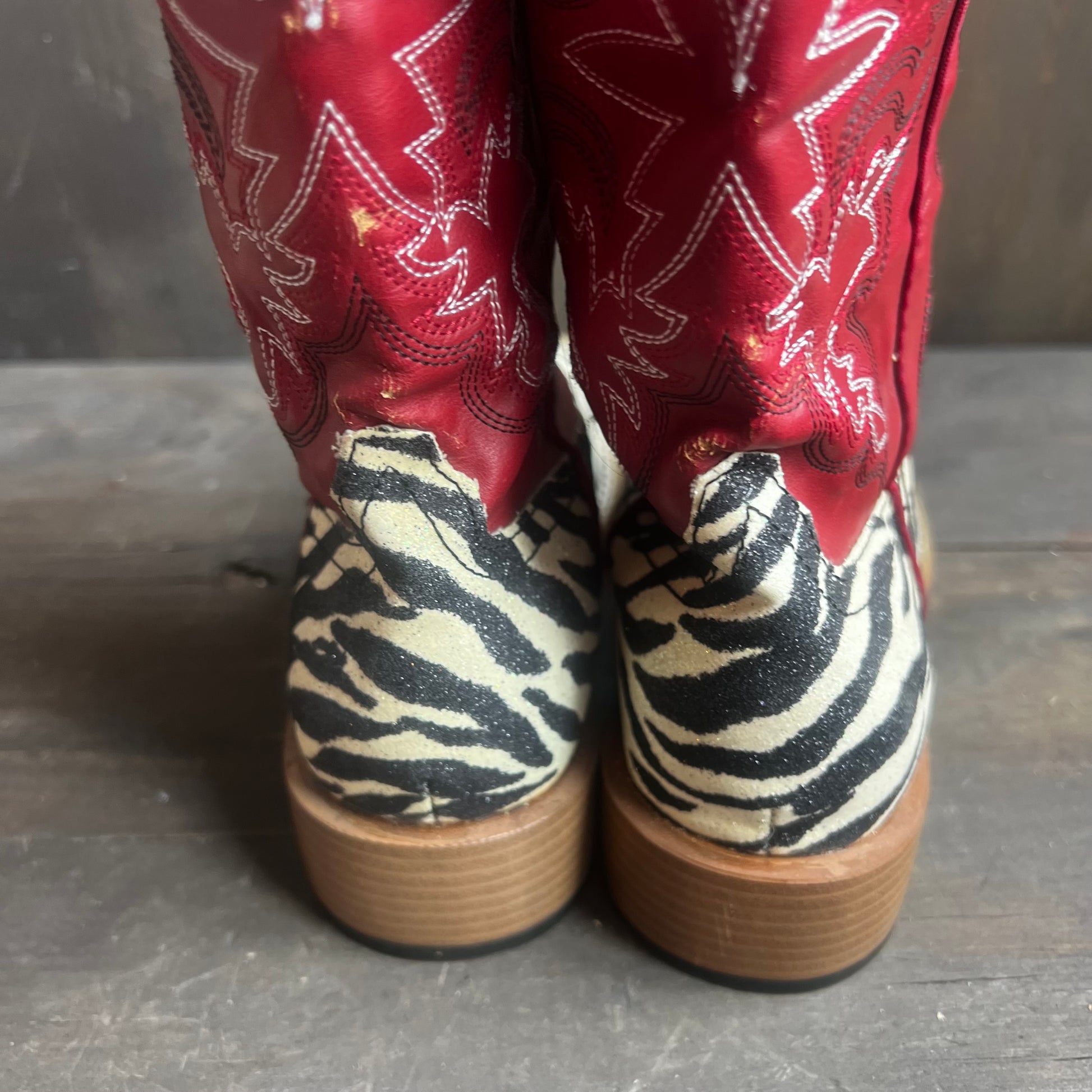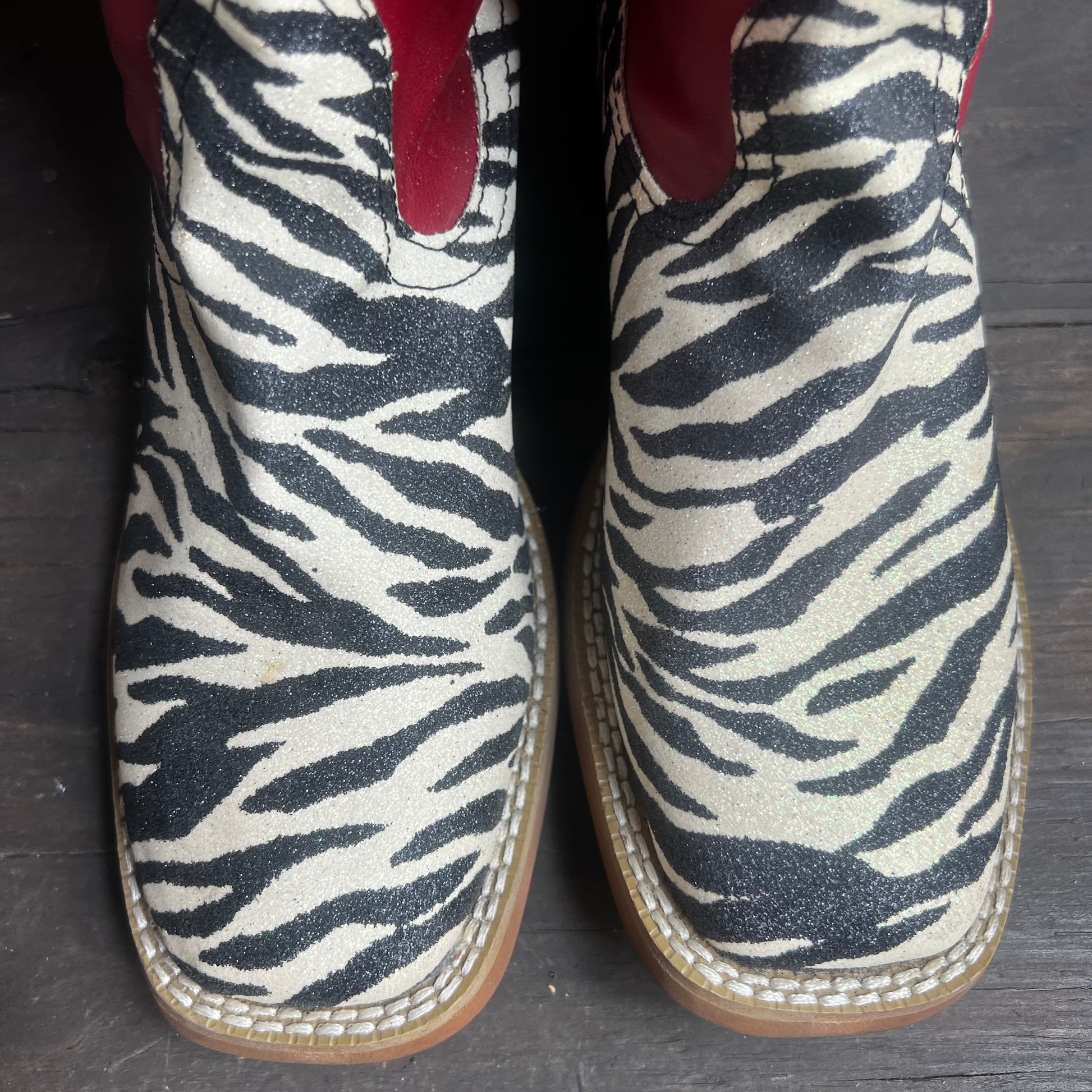 Stunning and unique boots with a shimmery zebra print vamp, and a red leather shaft. If you like to stand out, there are for you! In excellent condition. Women’s 6.5, men’s 5.