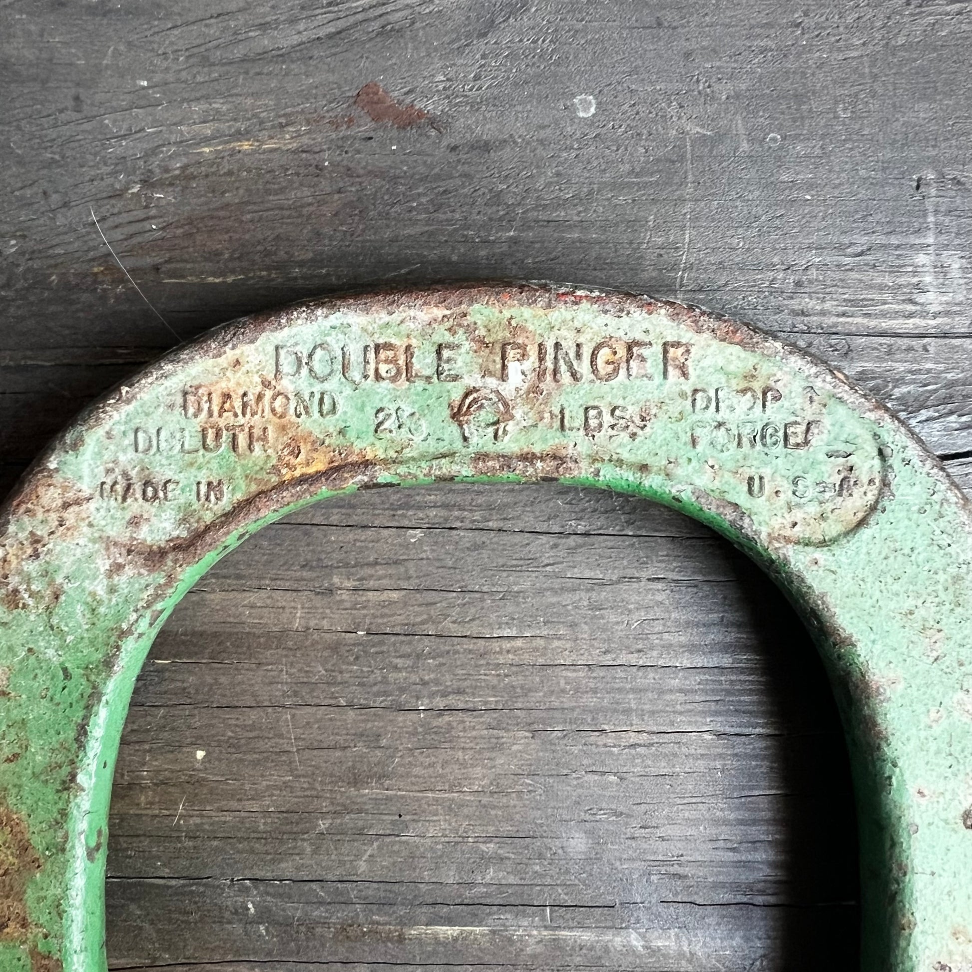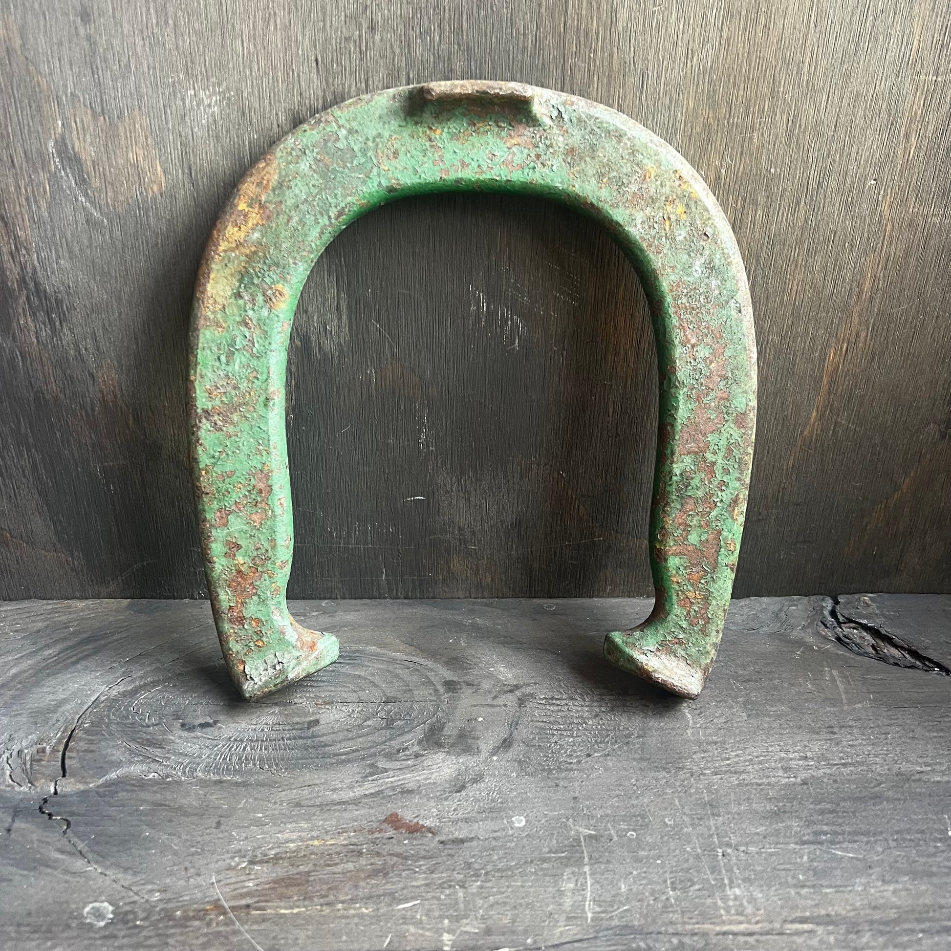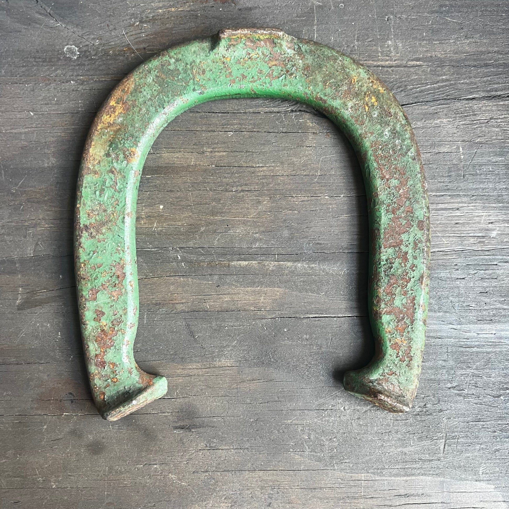Large vintage double ringer horseshoe. This was used in professional horseshoe games. Originally painted green but it has rusted and faded over time, adding to its rustic charm. In good vintage condition. Item is about 8” tall.