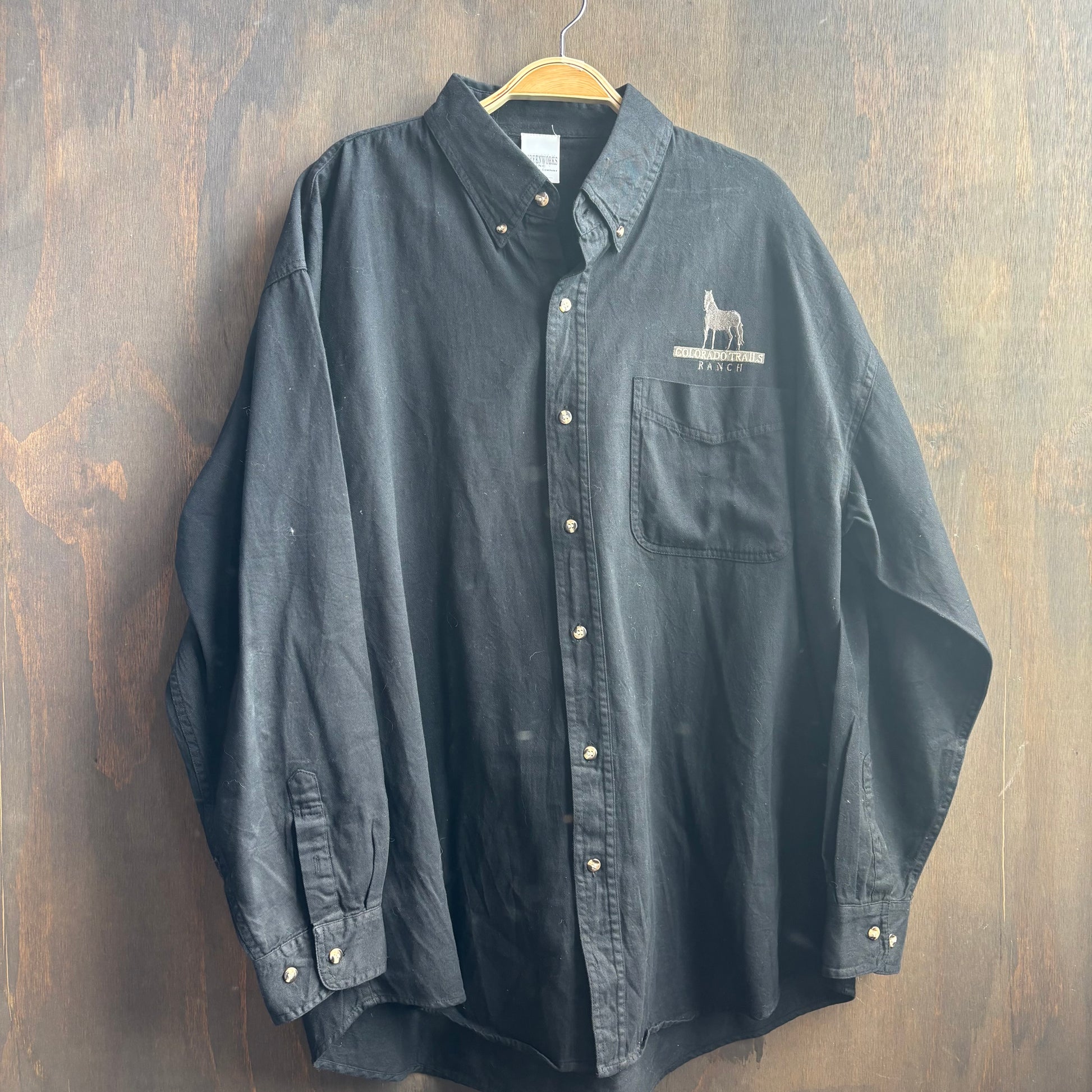 Black authentic employee button u shirt from Colorado Trails Ranch in a size XL, a little piece of local history!