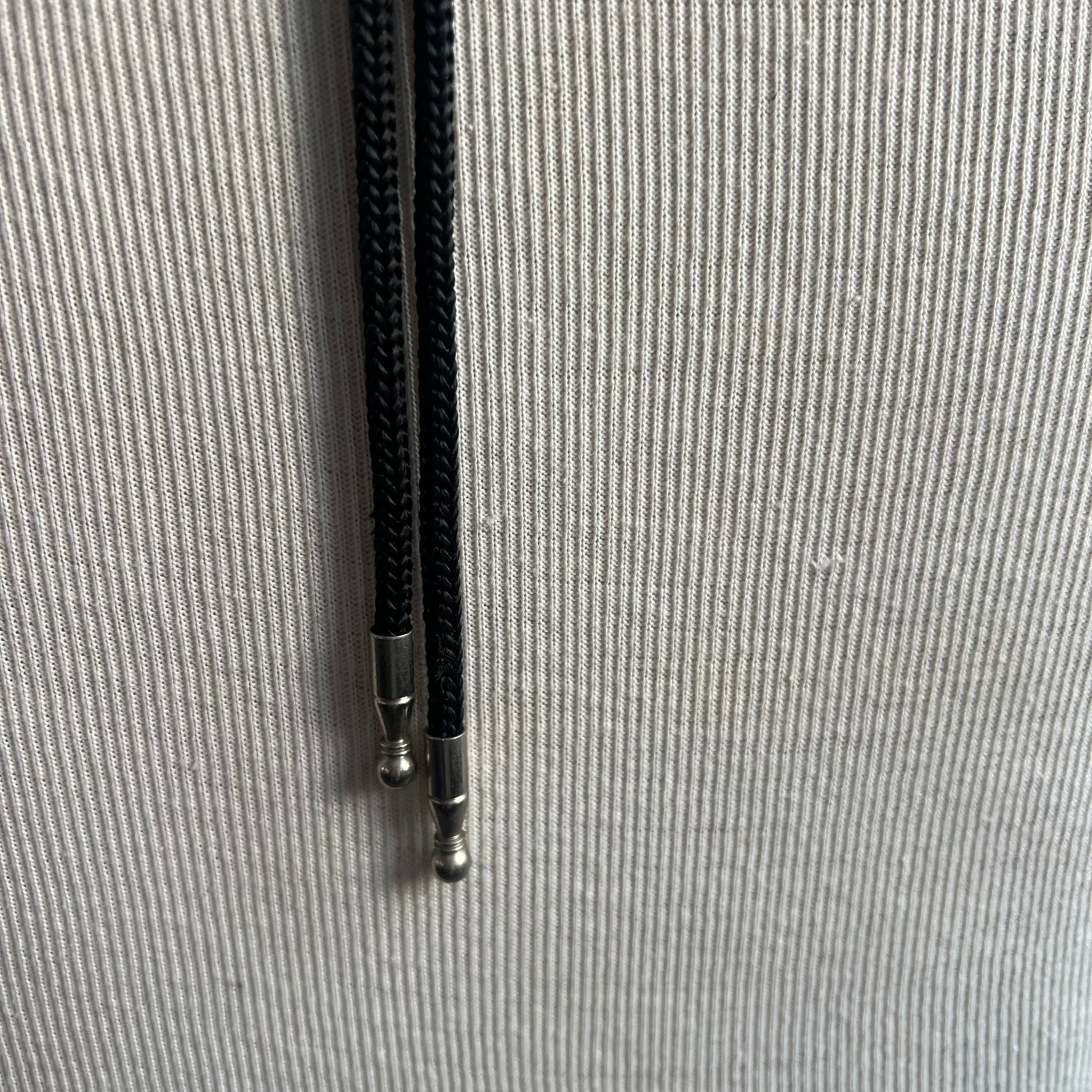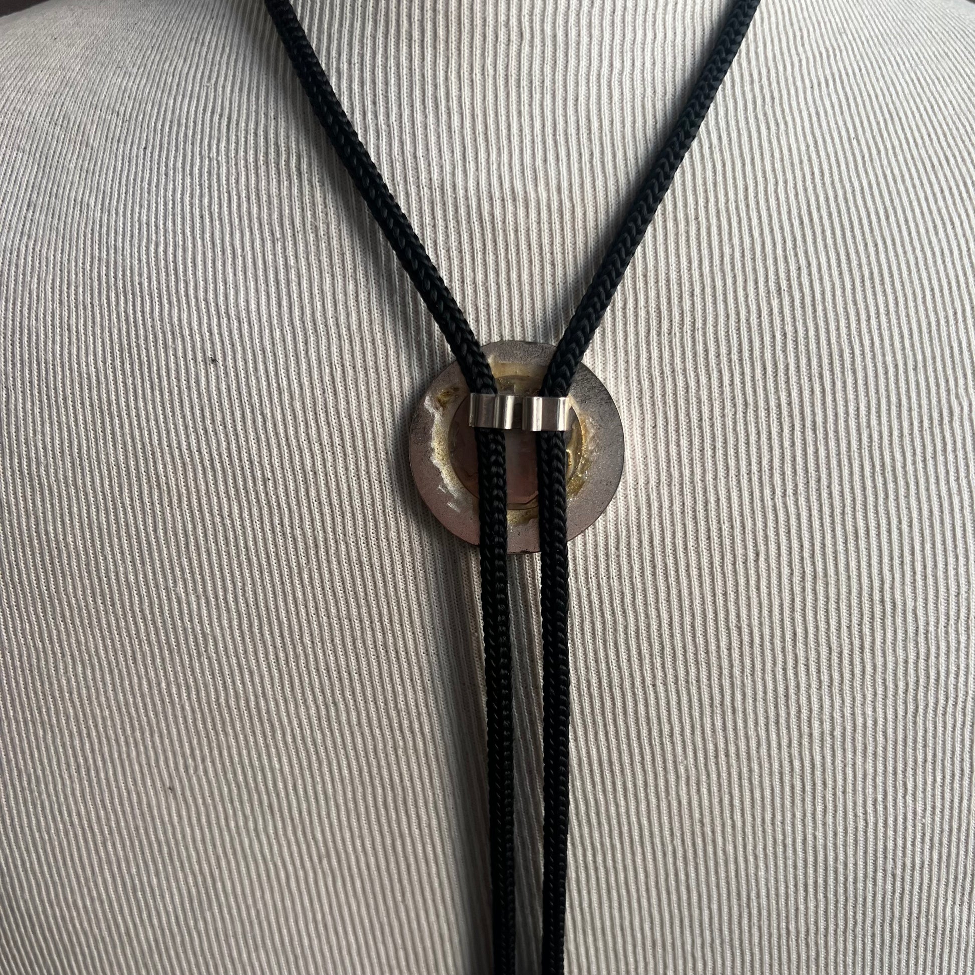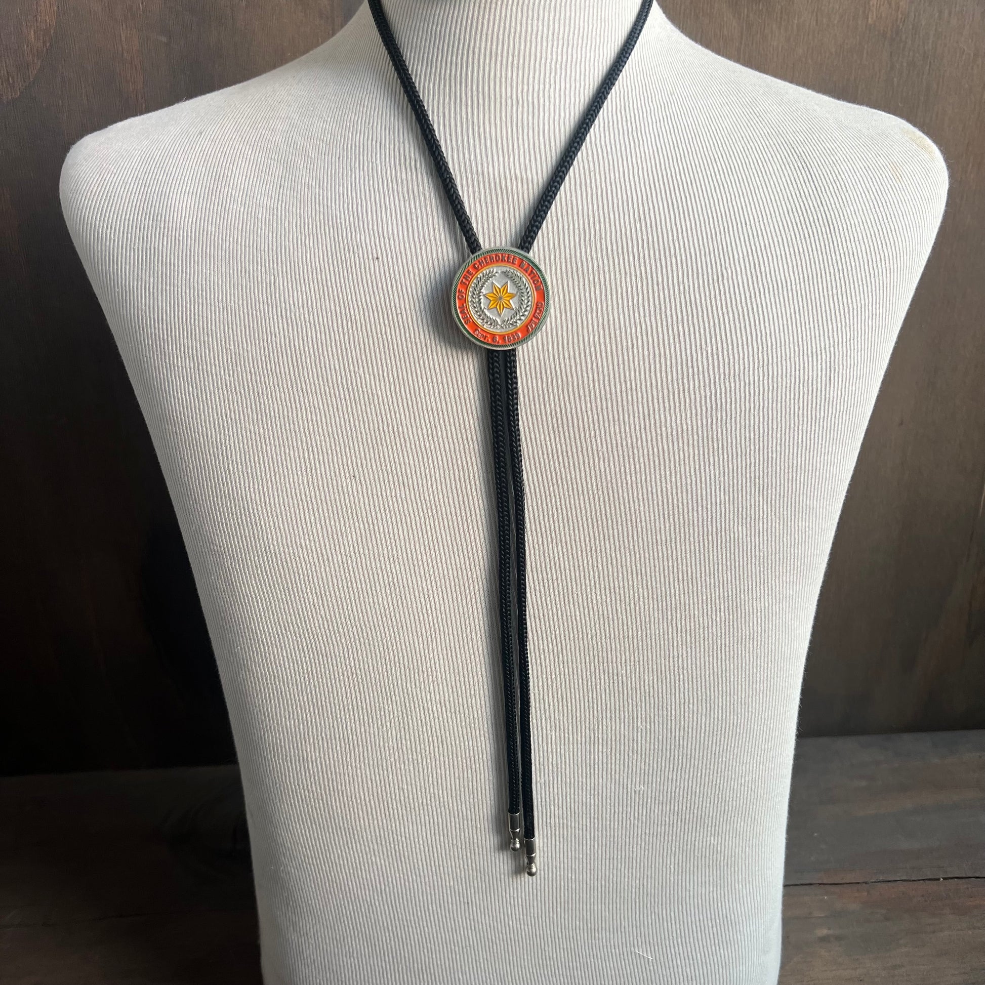 This beautiful bolo tie features a metal pendant embossed with the Seal of the Cherokee Nation from September 6th, 1839. The Cherokee Nation is one of the largest Native American tribes, historically located in the southeastern United States. The pendant is on a black cotton cord with silver bolo tie tips.