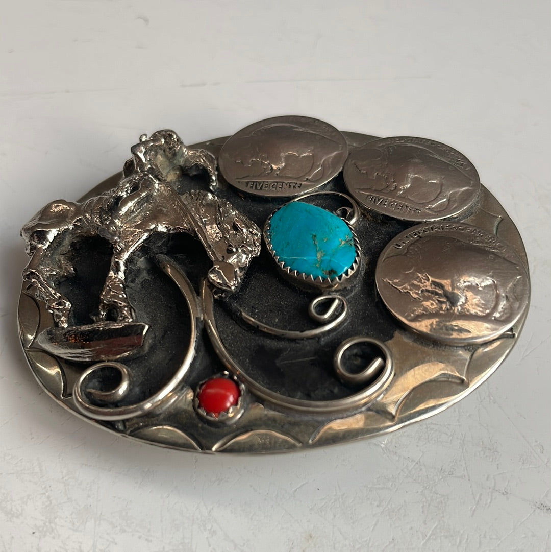 Silver, oval with 3 Buffalo nickels. This belt features a Native American on a horse with a piece of turquoise and red coral. It is a standard belt buckle, just needs belt.