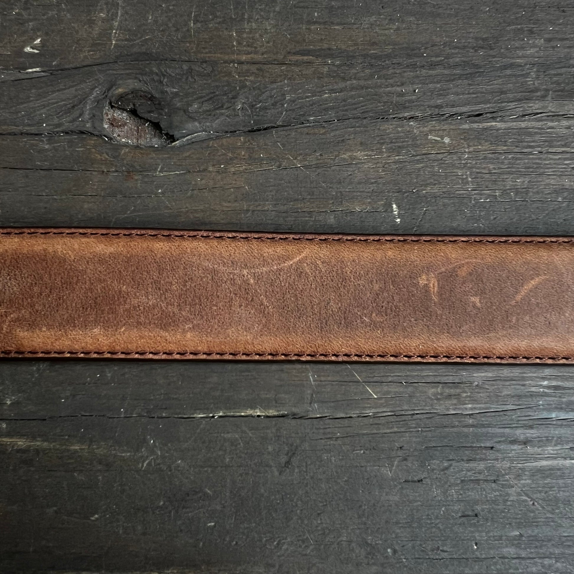 Beautiful leather belt with engraved silver buckle. In great condition, size 38 (L).