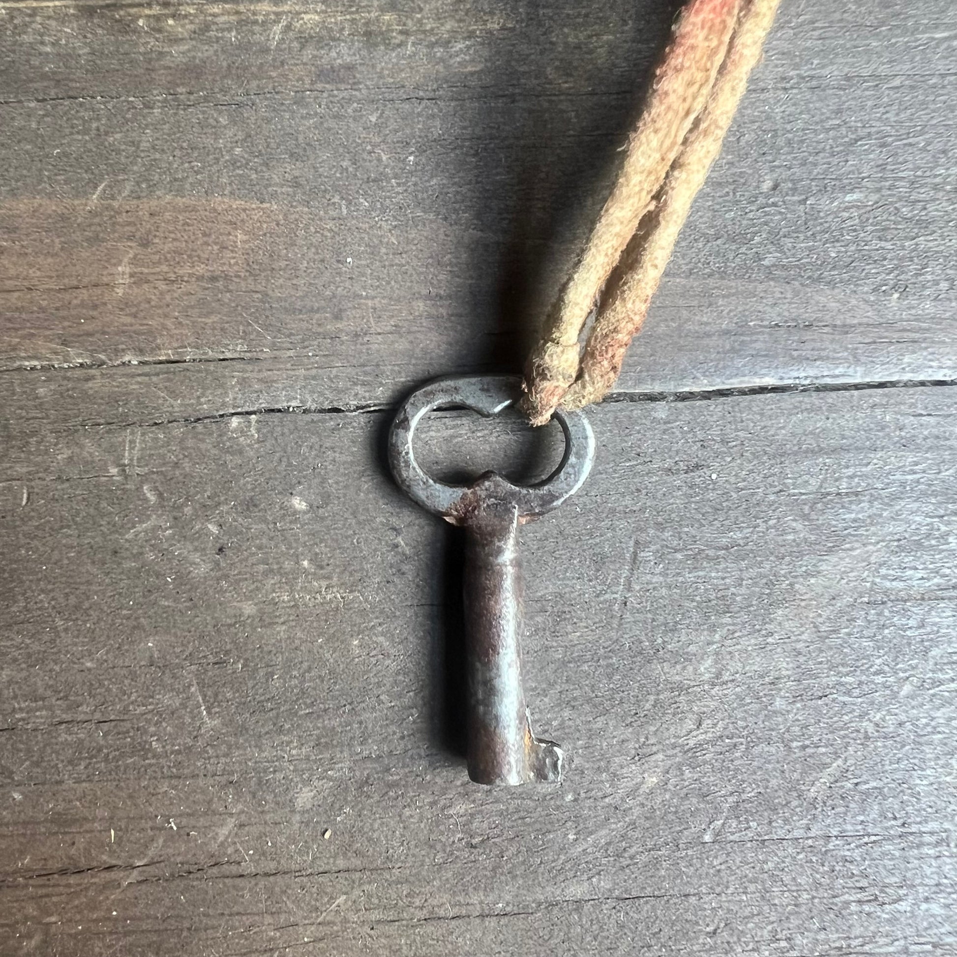 Small silver key pendant on leather tie, can be worn as a necklace, attached to a bag, hung on your wall, or tied to your keychain! See quarter for scale. 7”.