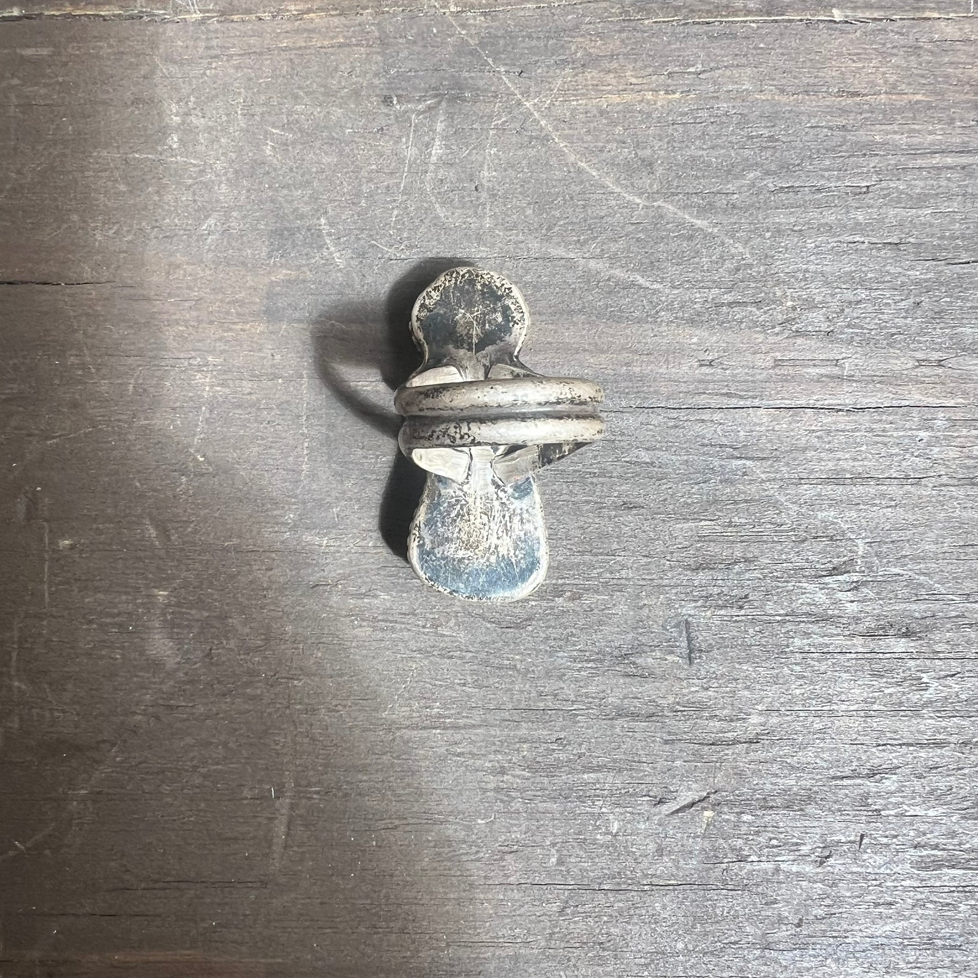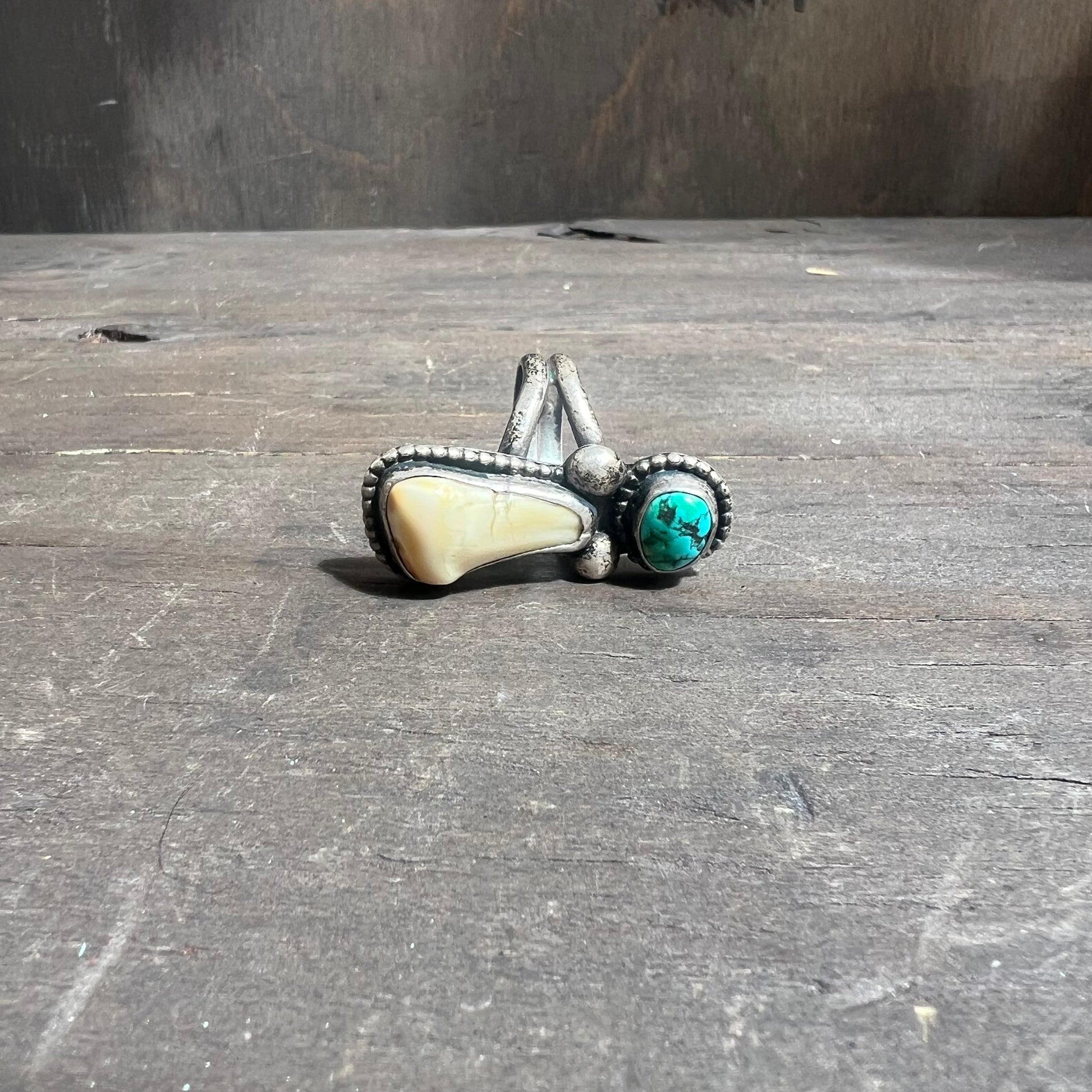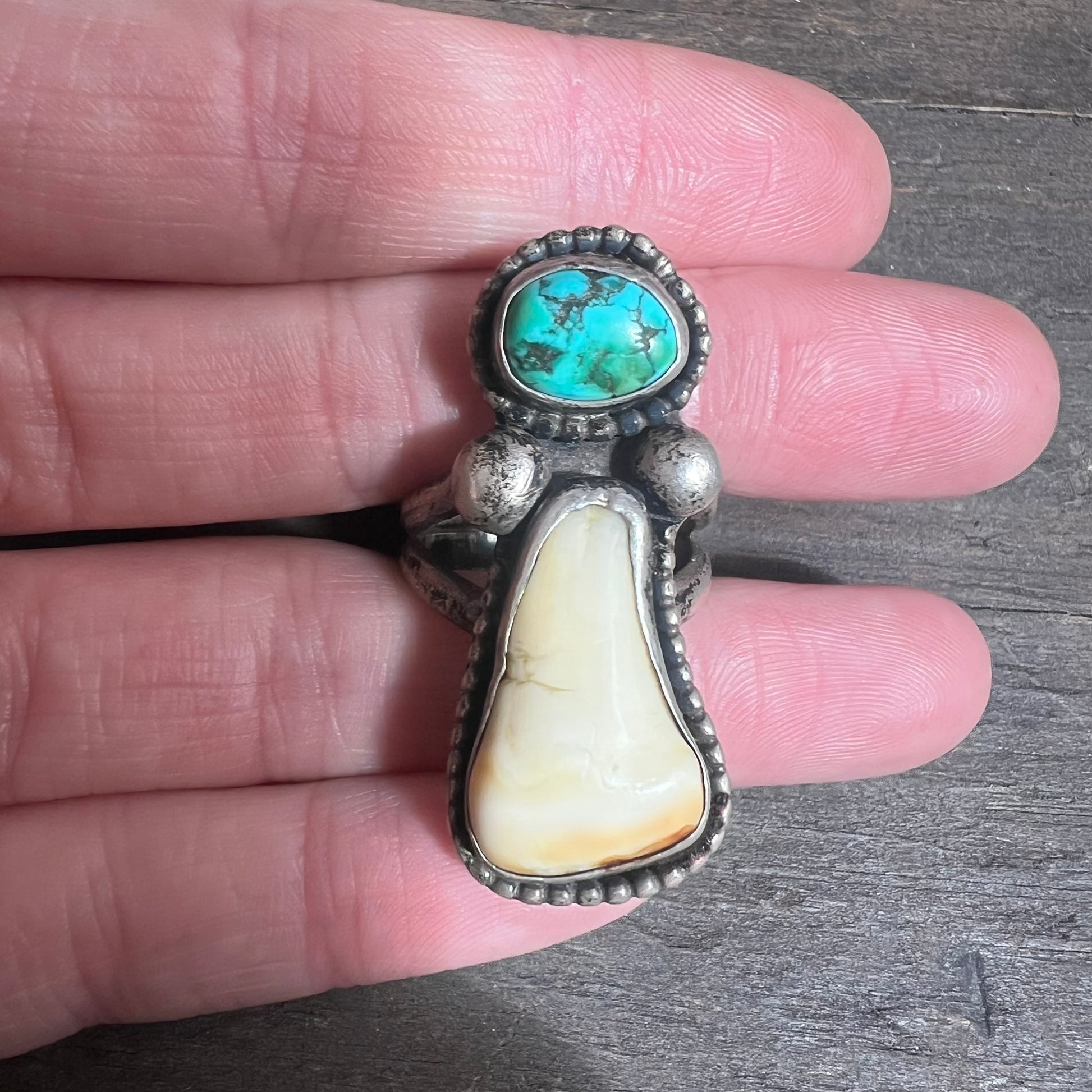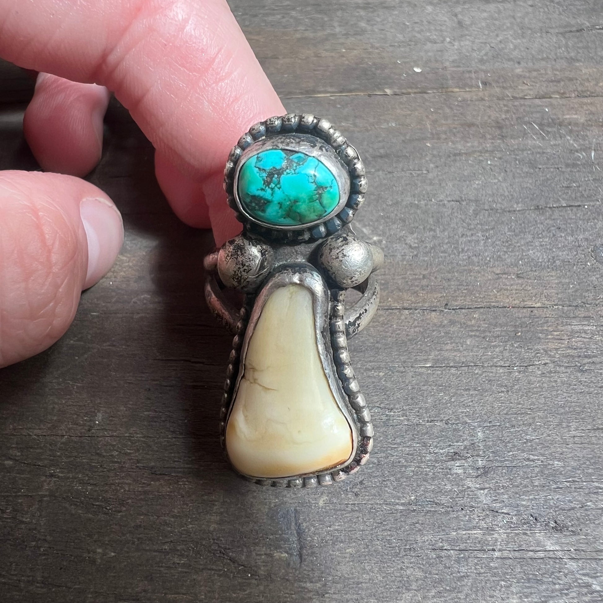 Gorgeous silver ring with two large decals. The bottom “stone” is a bear tooth, and the top is authentic turquoise. A chunky statement piece. In excellent condition! Size 7.5.