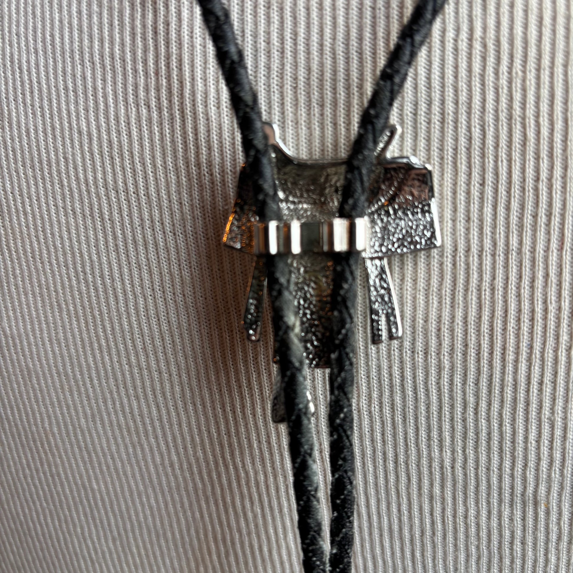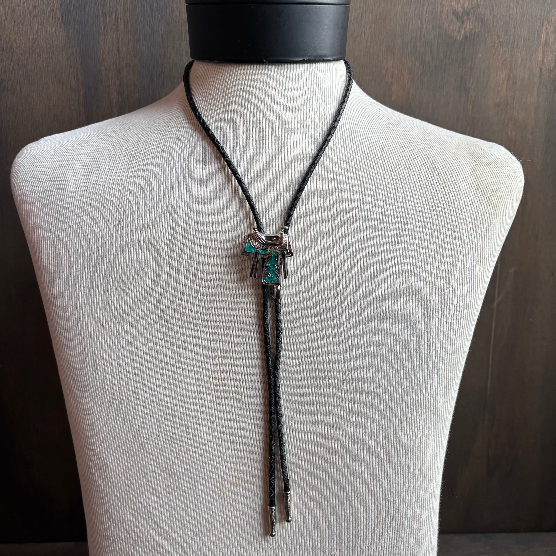 Pretty and classic looking silver saddle bolo on black leather tie with silver tone tips in great condition, includes turquoise flake fill