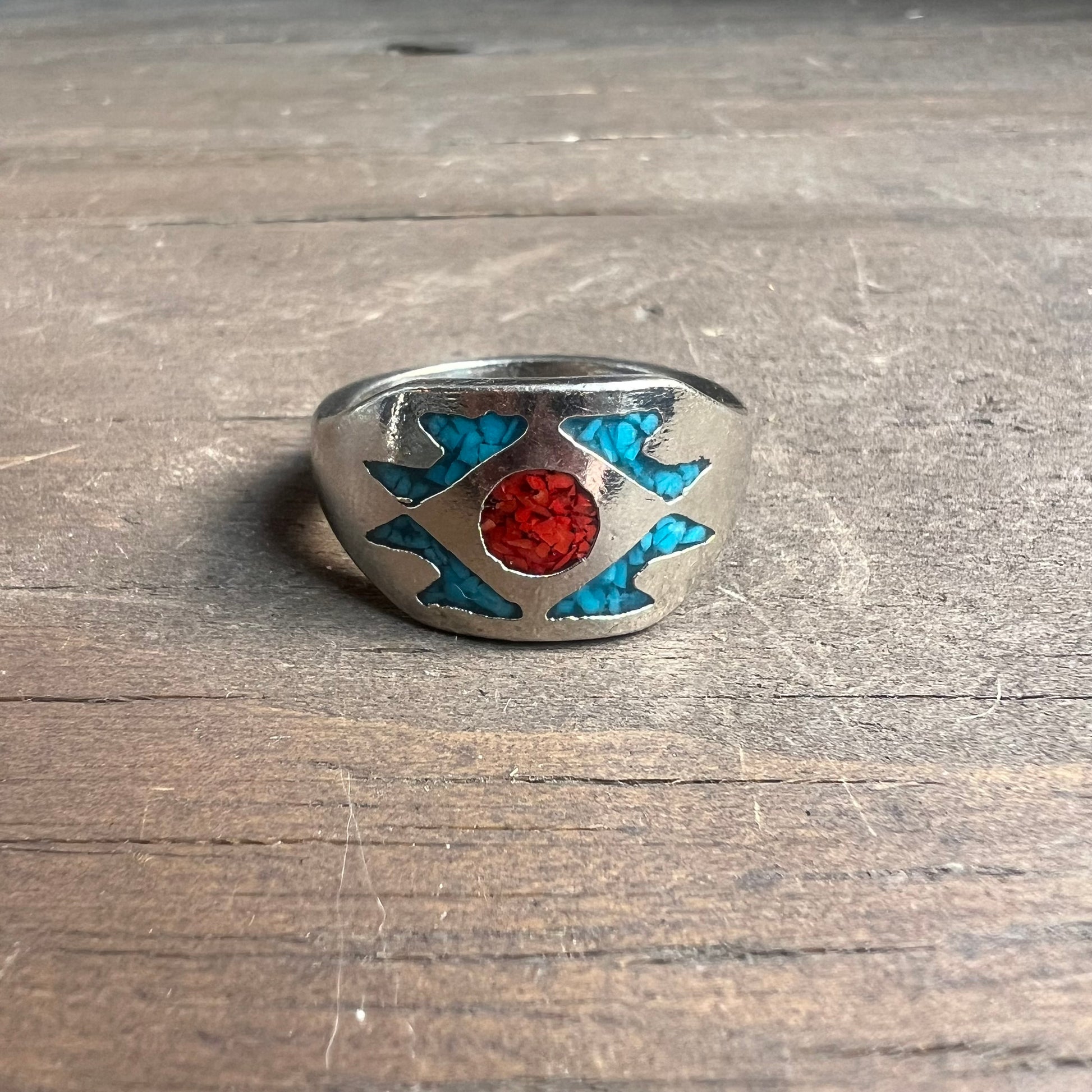 Gorgeous and classic faux silver ring with southwestern designs in authentic red jasper chips and authentic turquoise chips. In great condition. Size 10.5.