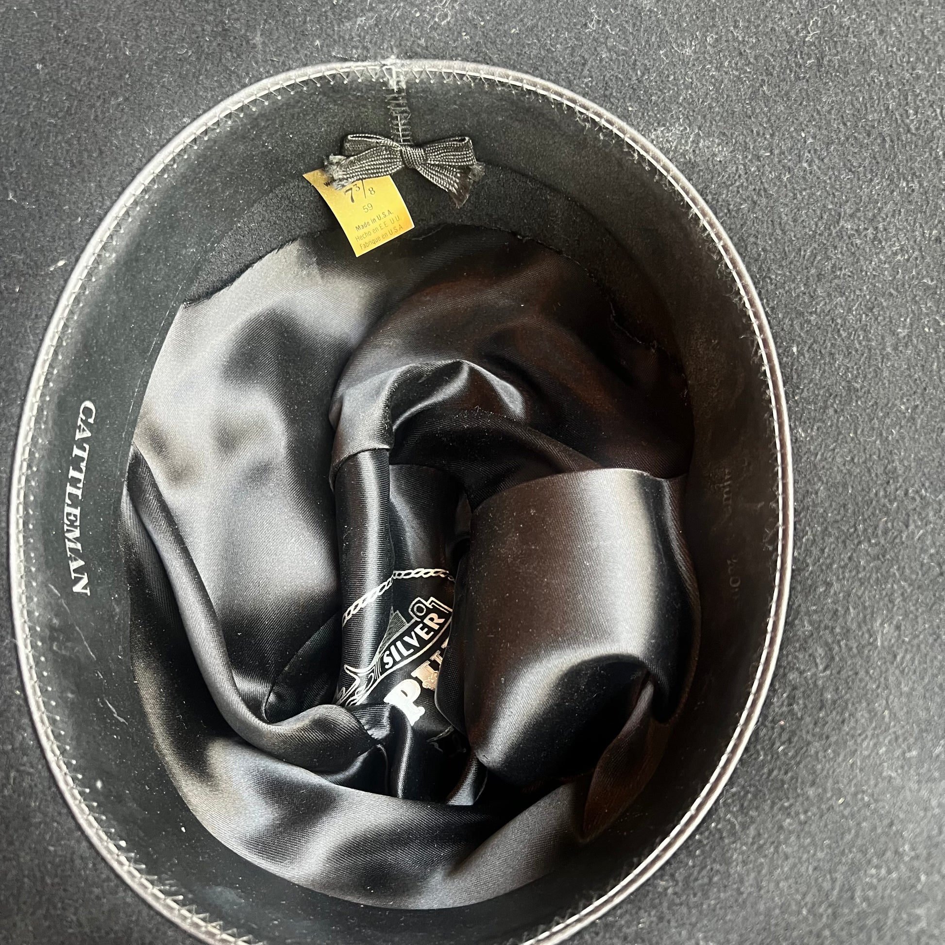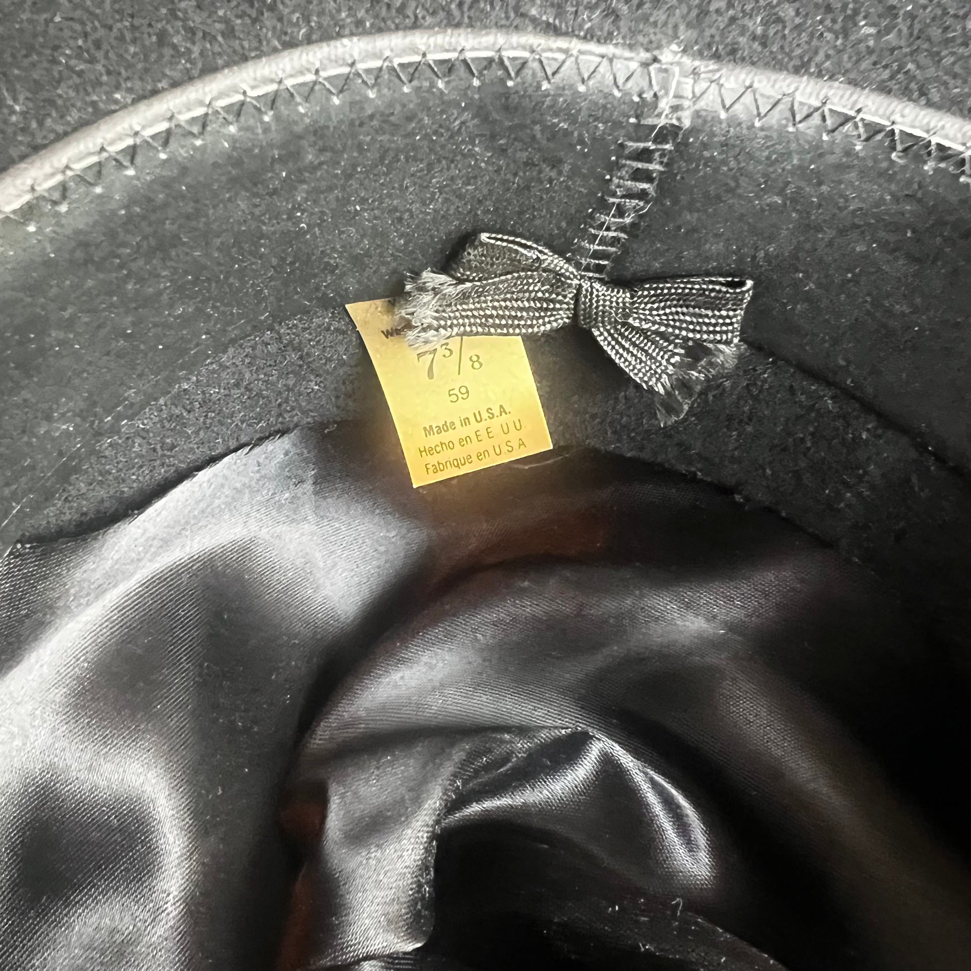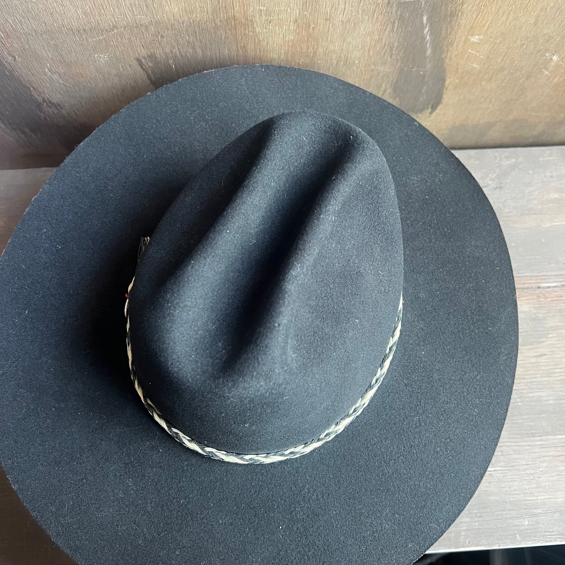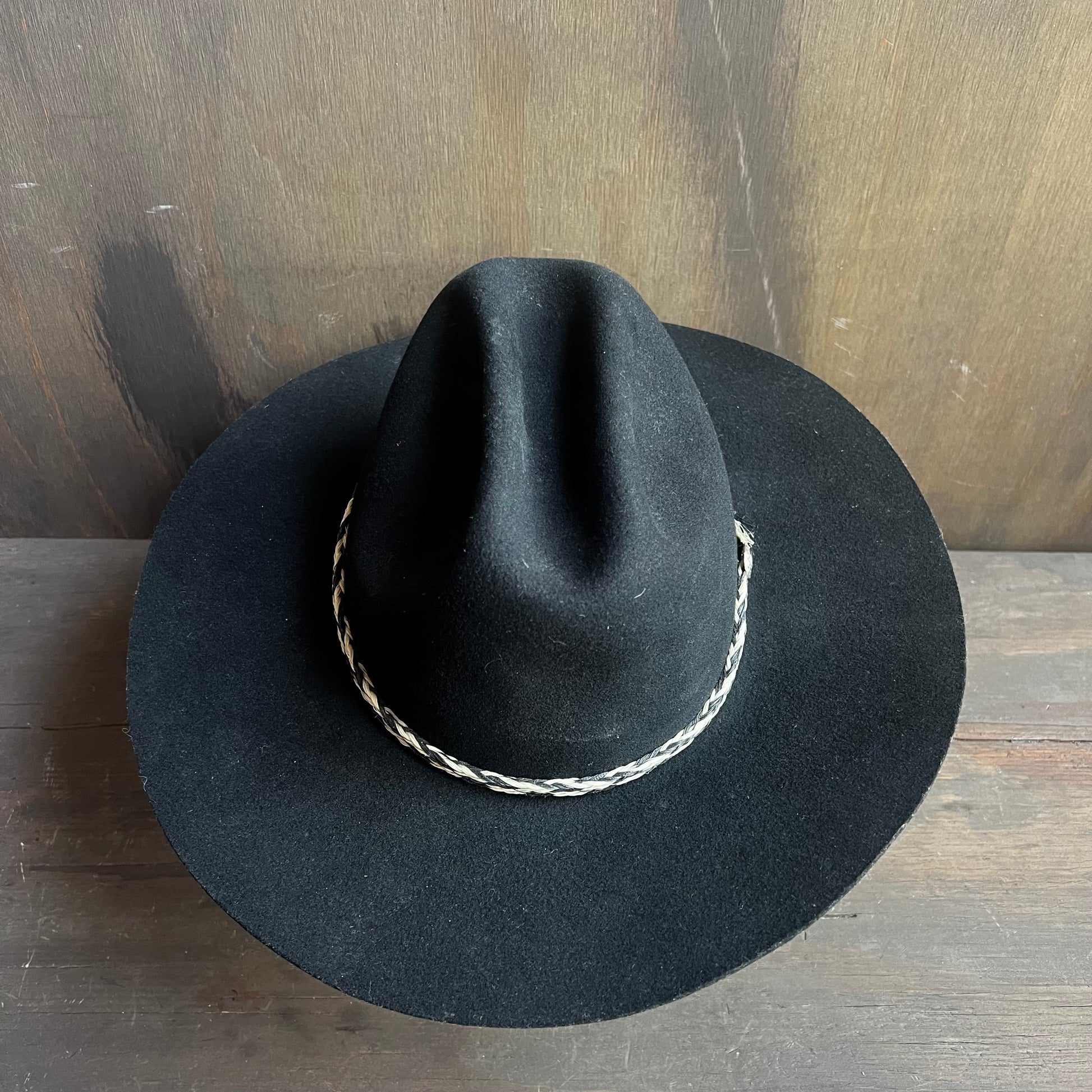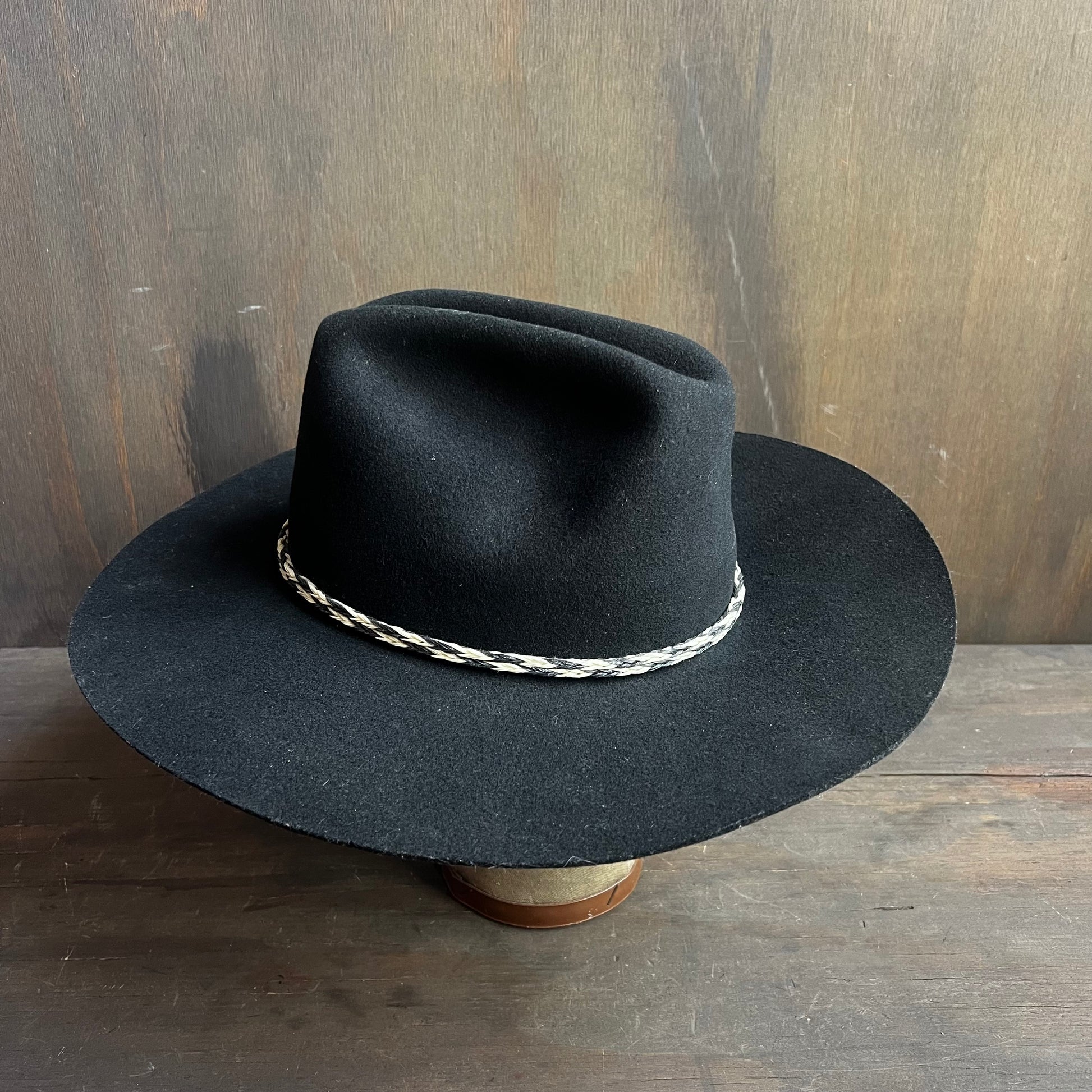 Classy black hat with a braided black and white hat band. In great condition. Size 7 3/8.