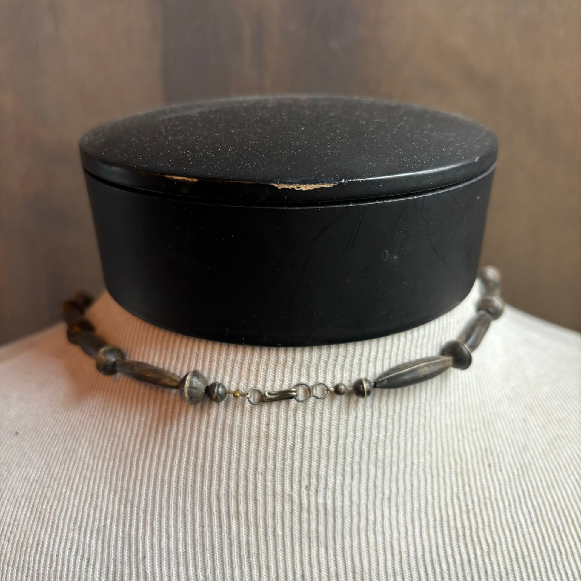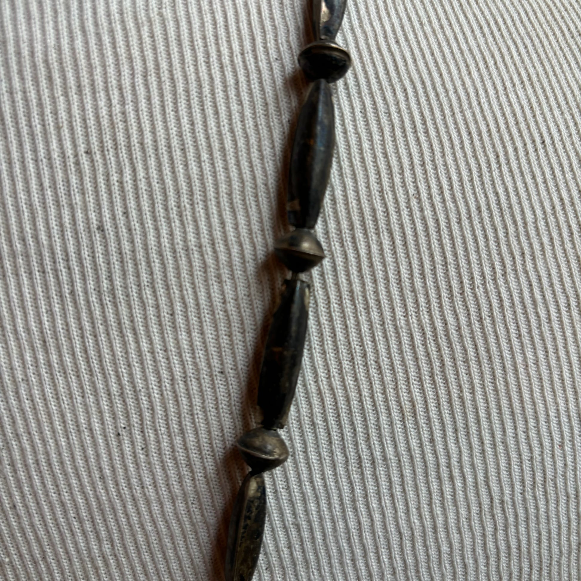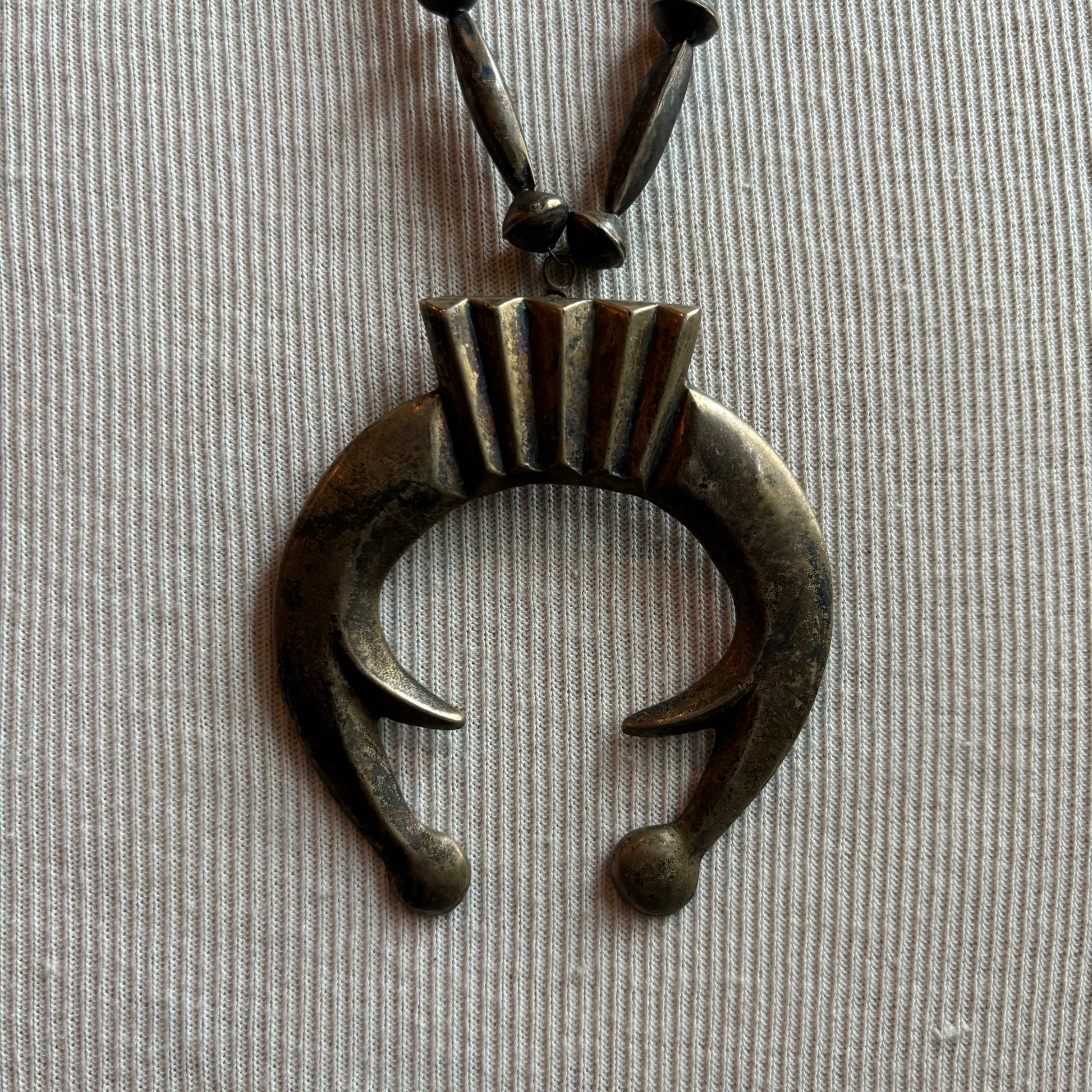 This stunning antique silver squash blossom necklace features intricate detailing and delicate silver beads, creating a unique and eye-catching piece. Add this statement necklace to your collection for a touch of timeless Southwestern style.