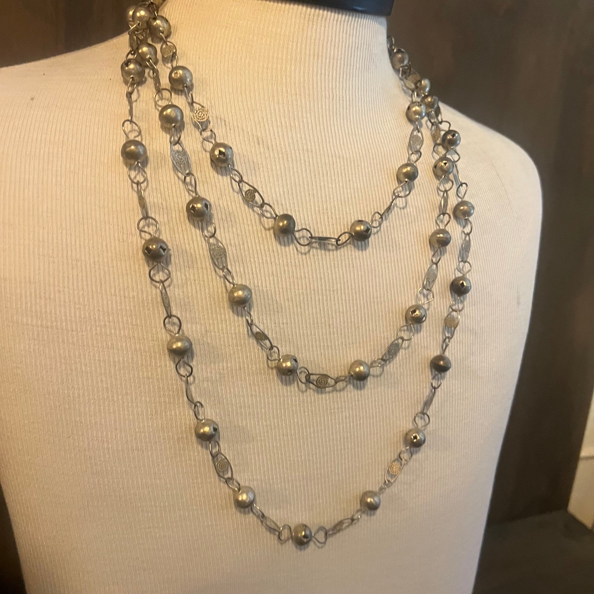 Gorgeous vintage silver necklace. Can be worn wrapped 2-4 times if desired. Necklace is about 2.5 ft long unwrapped. So beautiful and looks good layered with other jewelry or worn on its own!