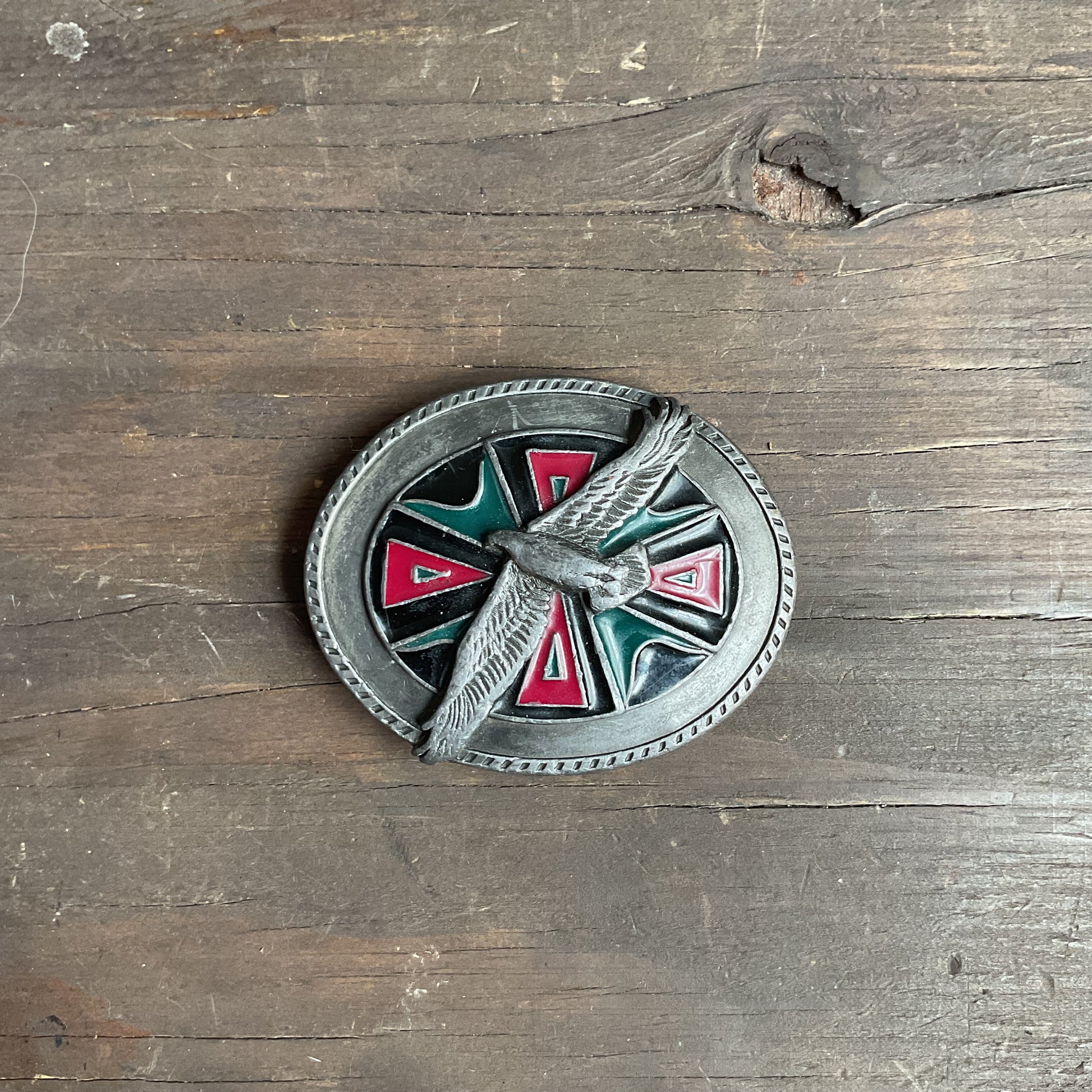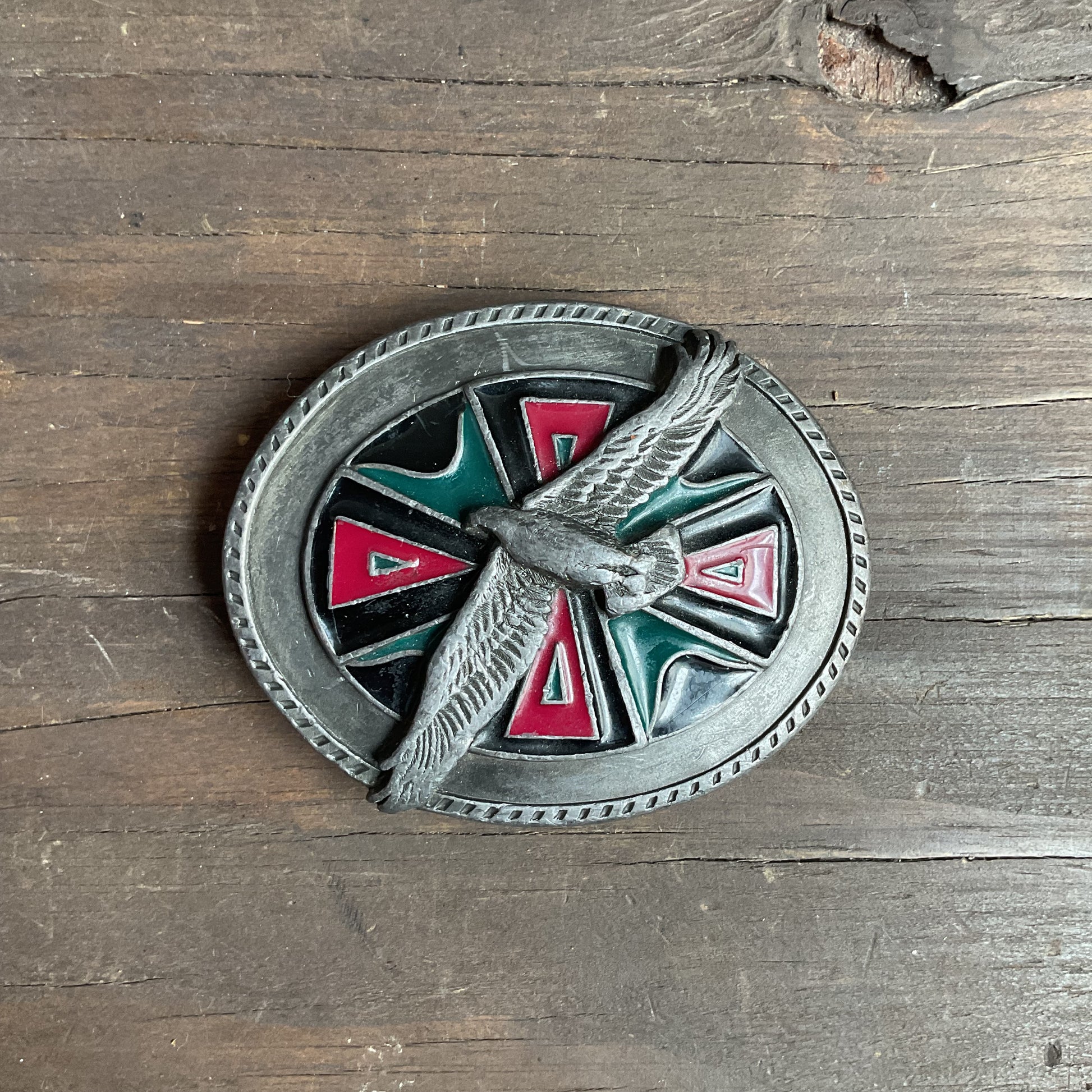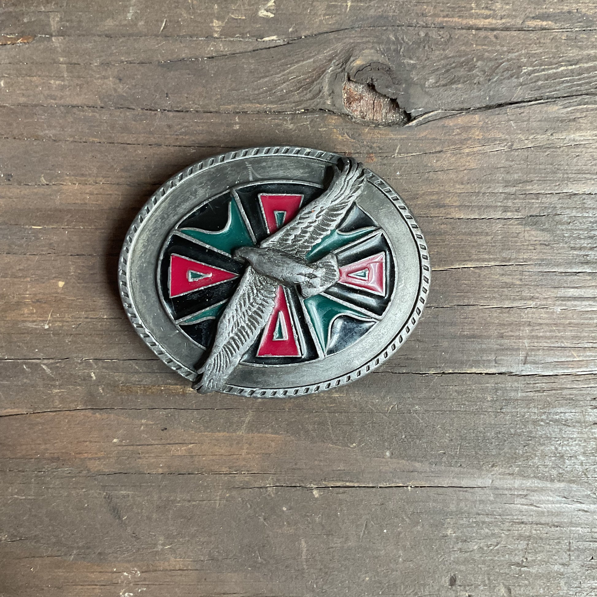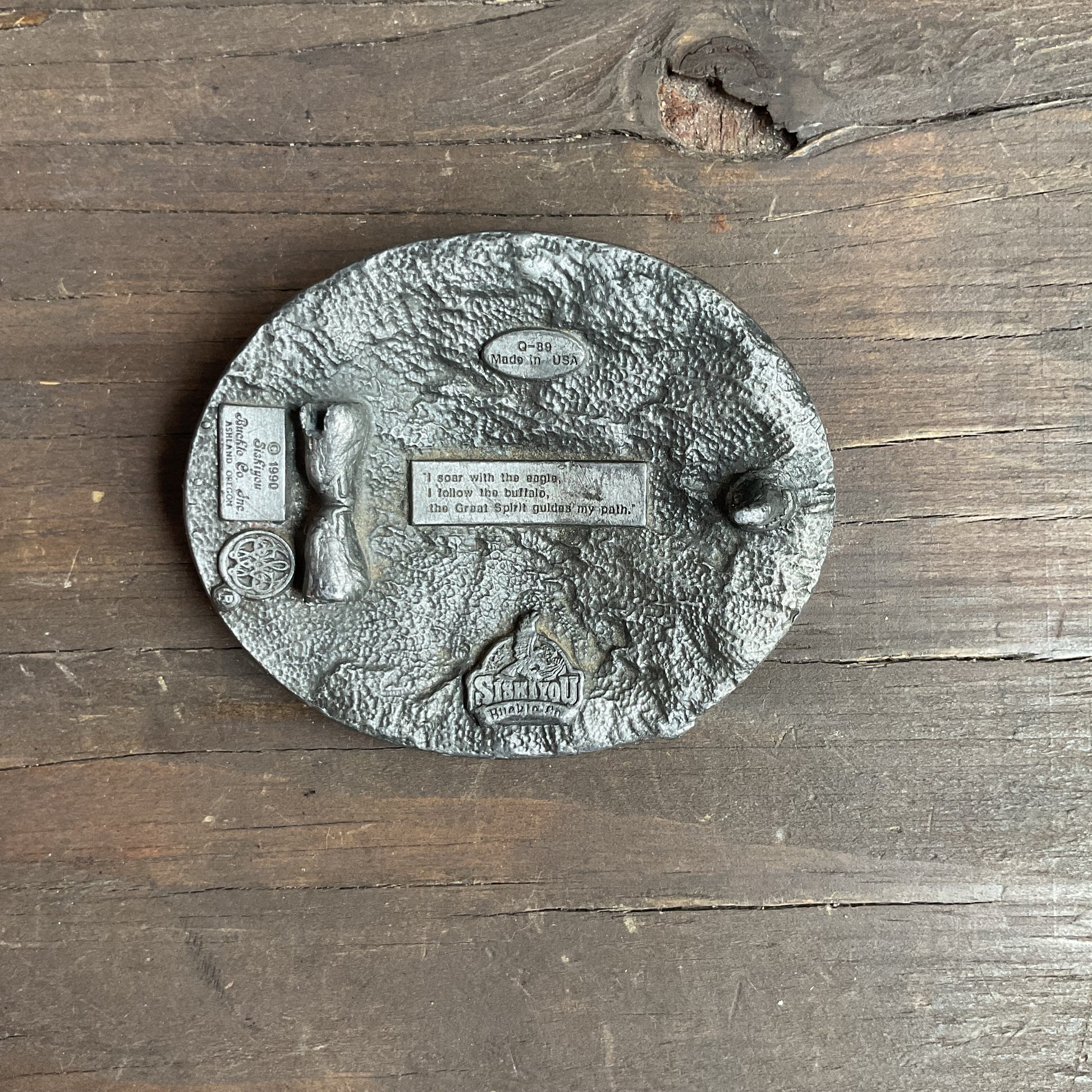 Gorgeous oval-shaped belt buckle with a carved soaring eagle. The back of the belt buckle reads "I soar with the eagle, I follow the buffalo, the Great Spirit guides my path."