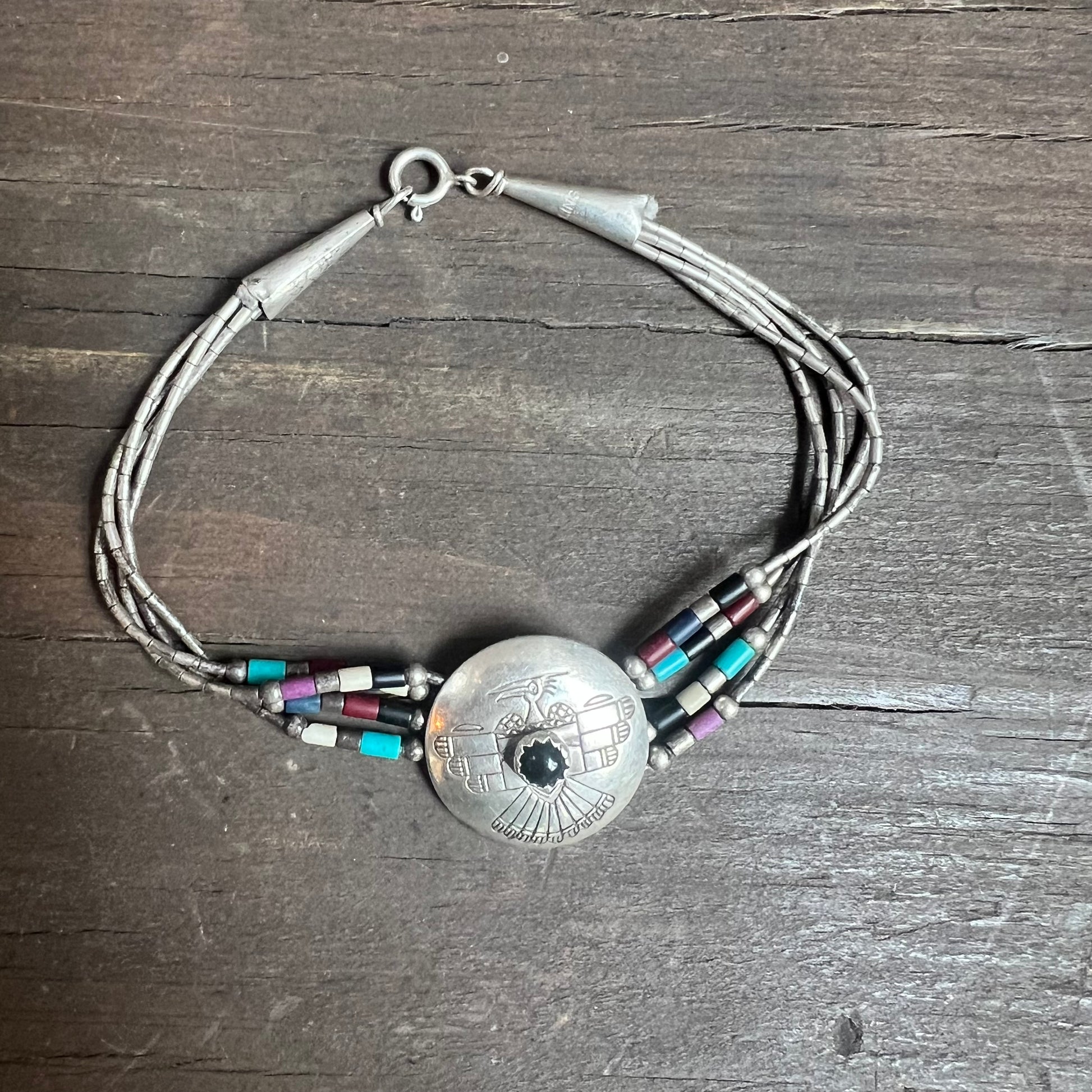 Beautiful beaded bracelet with silver beads, and a few colored beads near the pendant. The pendant has a carved bird in the silver. In great condition.