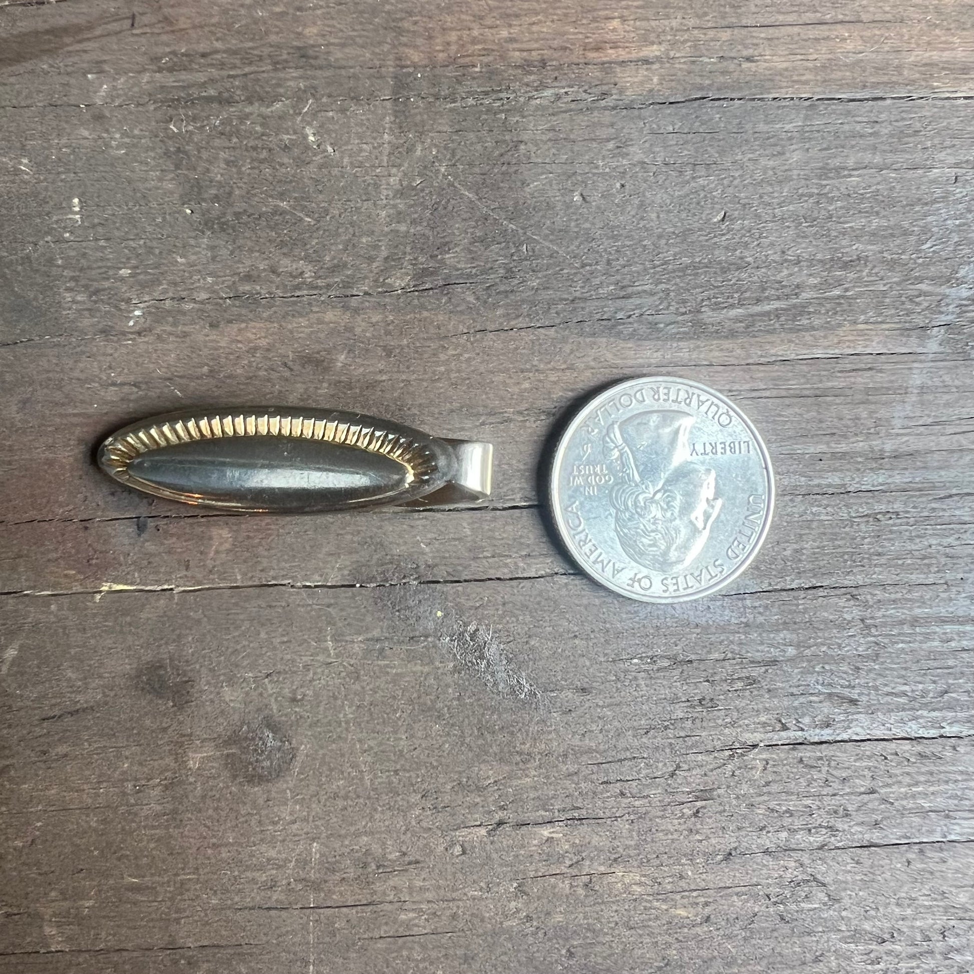 Classy silver colored tie clip to add a touch of flair to your outfit. In excellent condition. See quarter for scale.