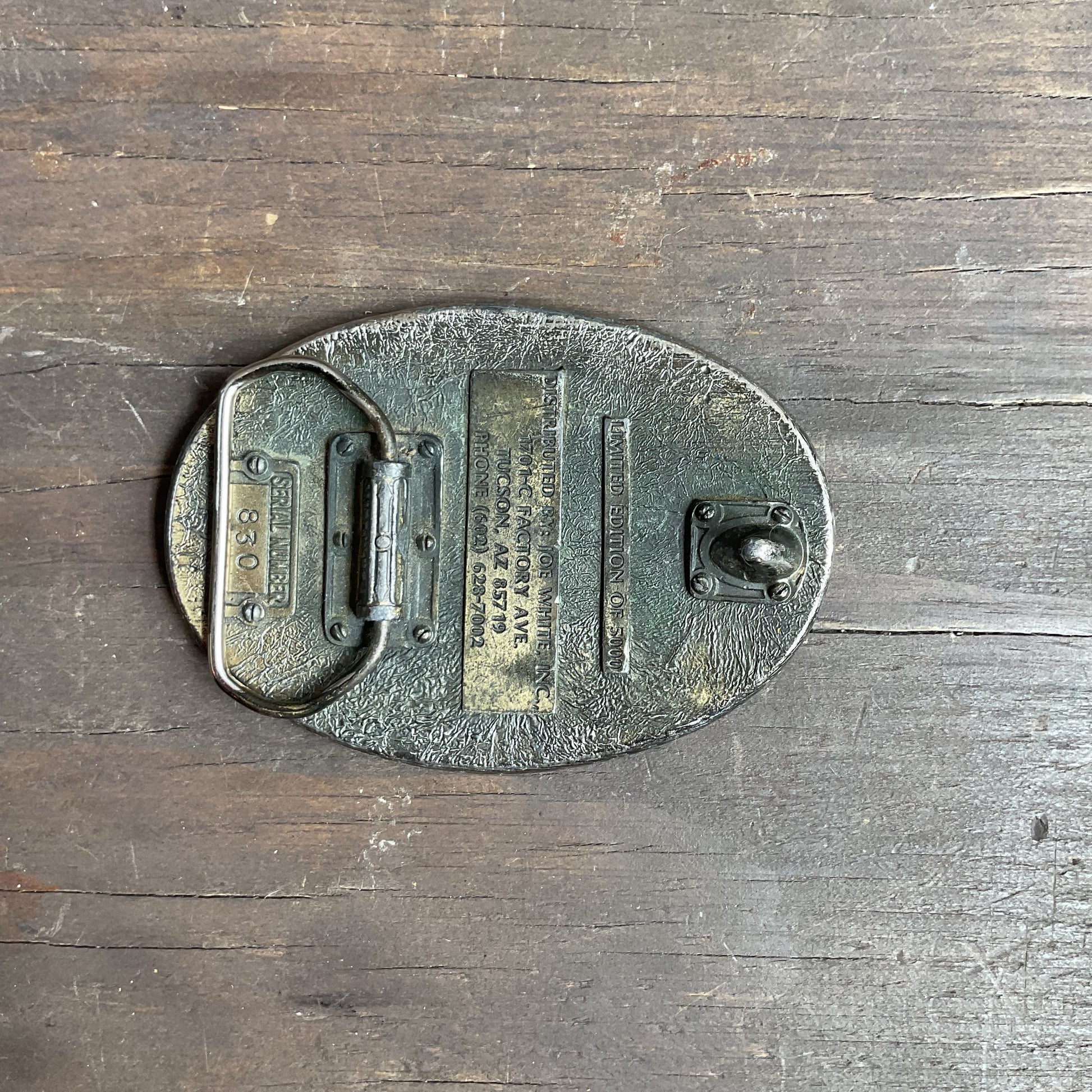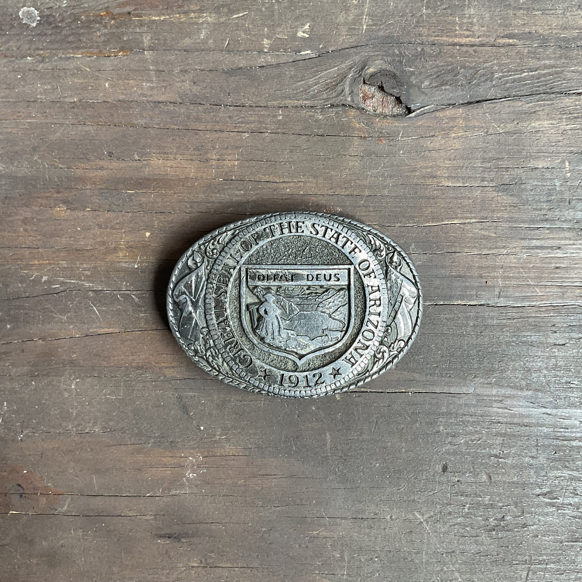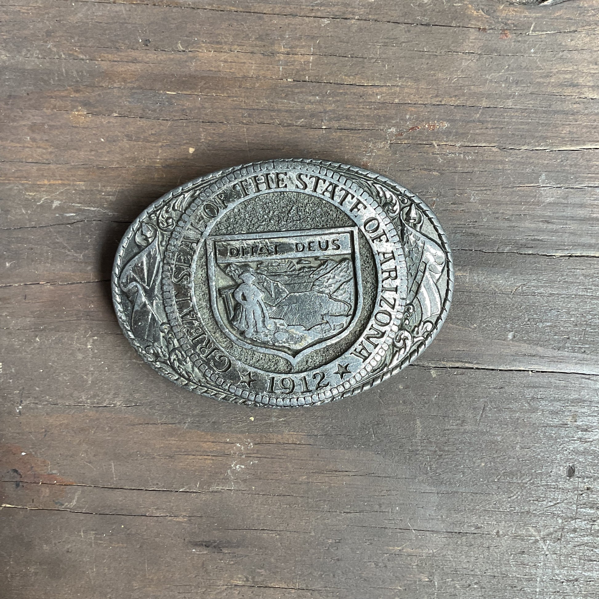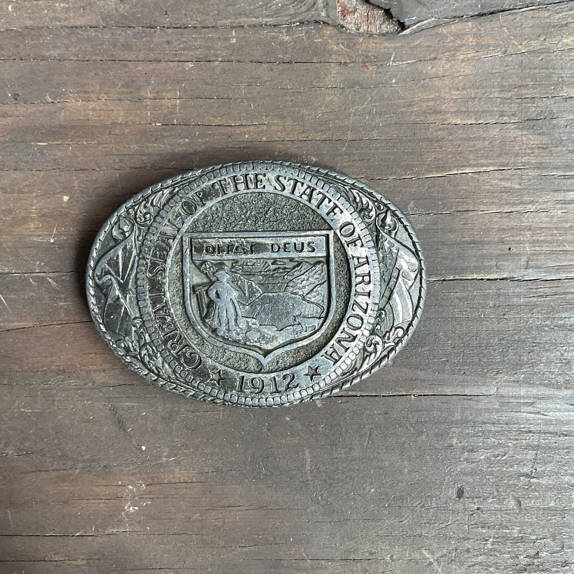 Cool belt buckle featuring the state seal of Arizona. Text on the front side of the buckle reads: "Great Seal of the State of Arizona." This belt buckle was made in Tucson, AZ and is a limited edition.