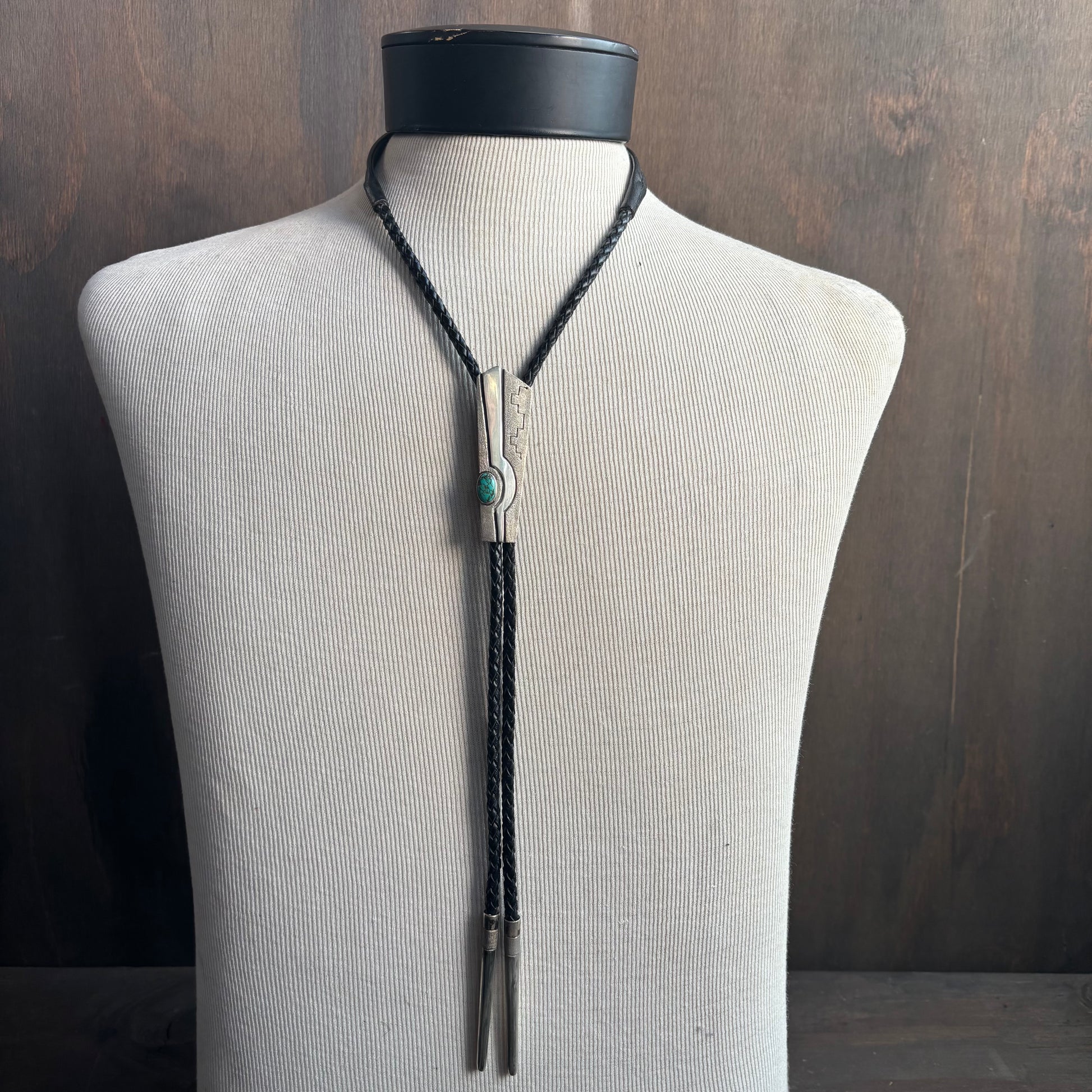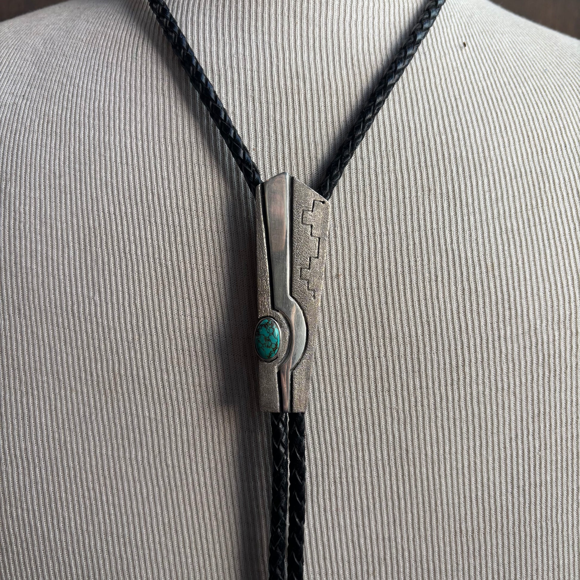 Incredible designer made and signed sterling silver and turquoise bolo on black tie, contemporary beautiful piece by Jim Harrison