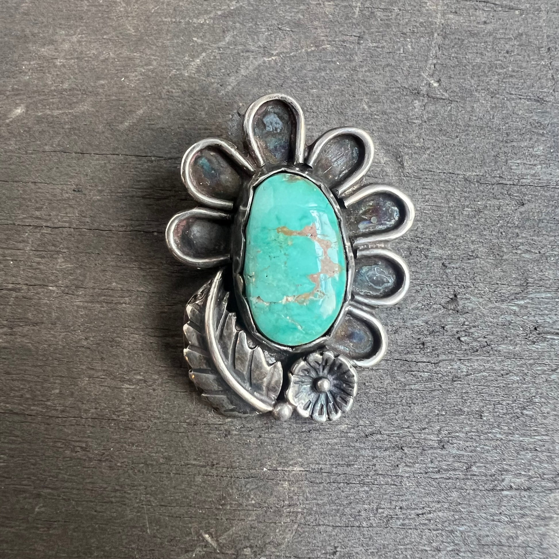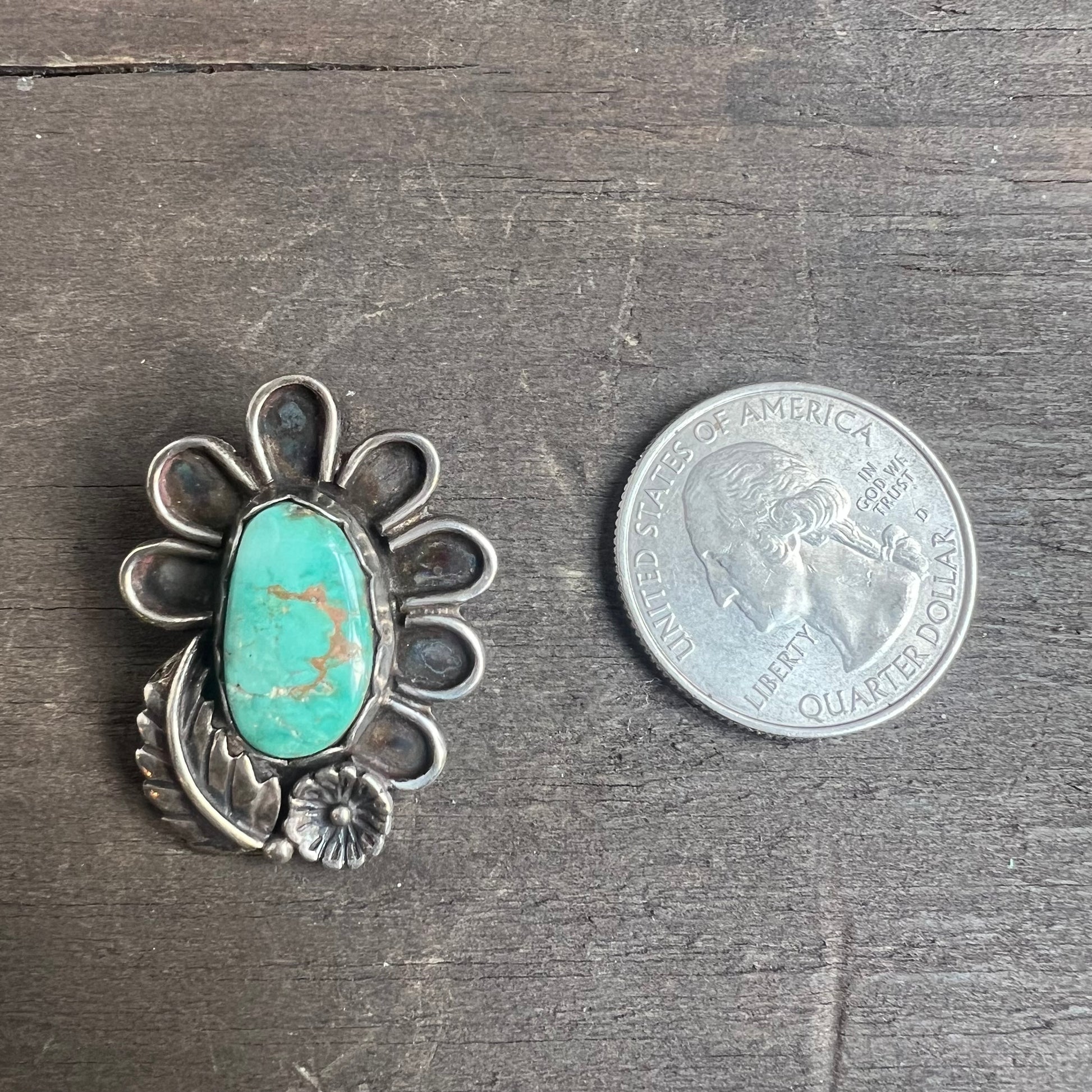 Beautiful pendant made from sterling silver with a turquoise stone. Pendant also has a silver feather and flower for embellishments. In excellent condition and signed by maker "Ann". See quarter for scale.