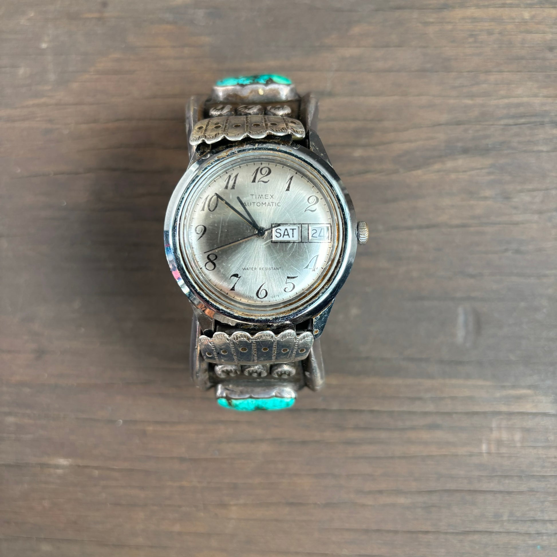 Stunning Sterling Silver custom watchband with Timex face includes authentic turquoise and coral, as well as gorgeous sterling decoration. Likely handmade, own a little piece of American history!