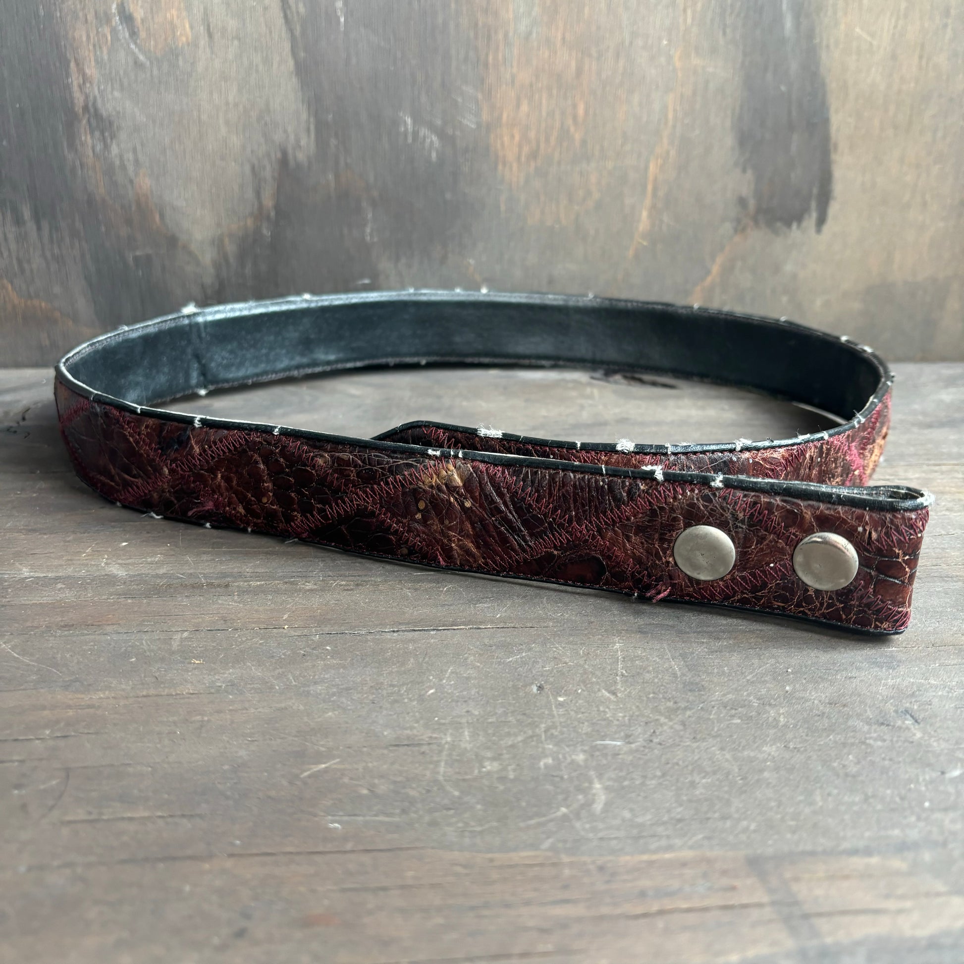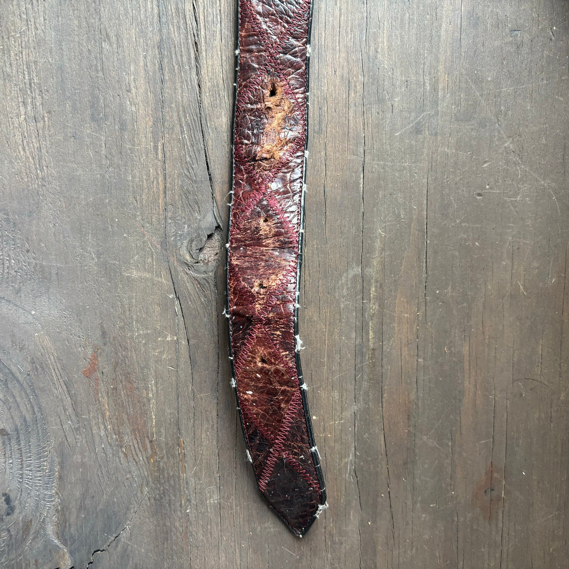 Well-loved leather belt with red zigzag stitching in crisscross shape along length of belt, wear due to age – see photos. No buckle. No size marked, fits like a 36.