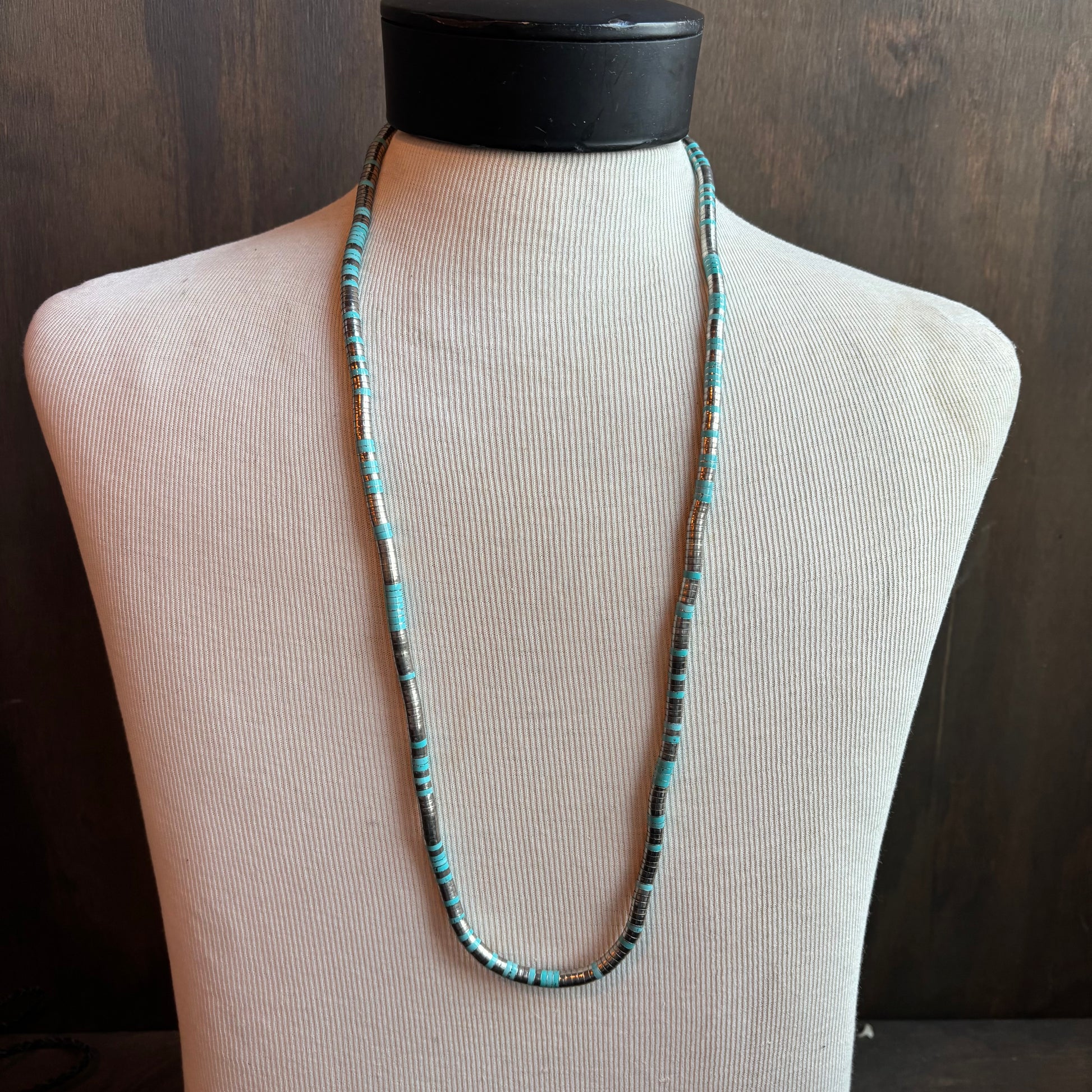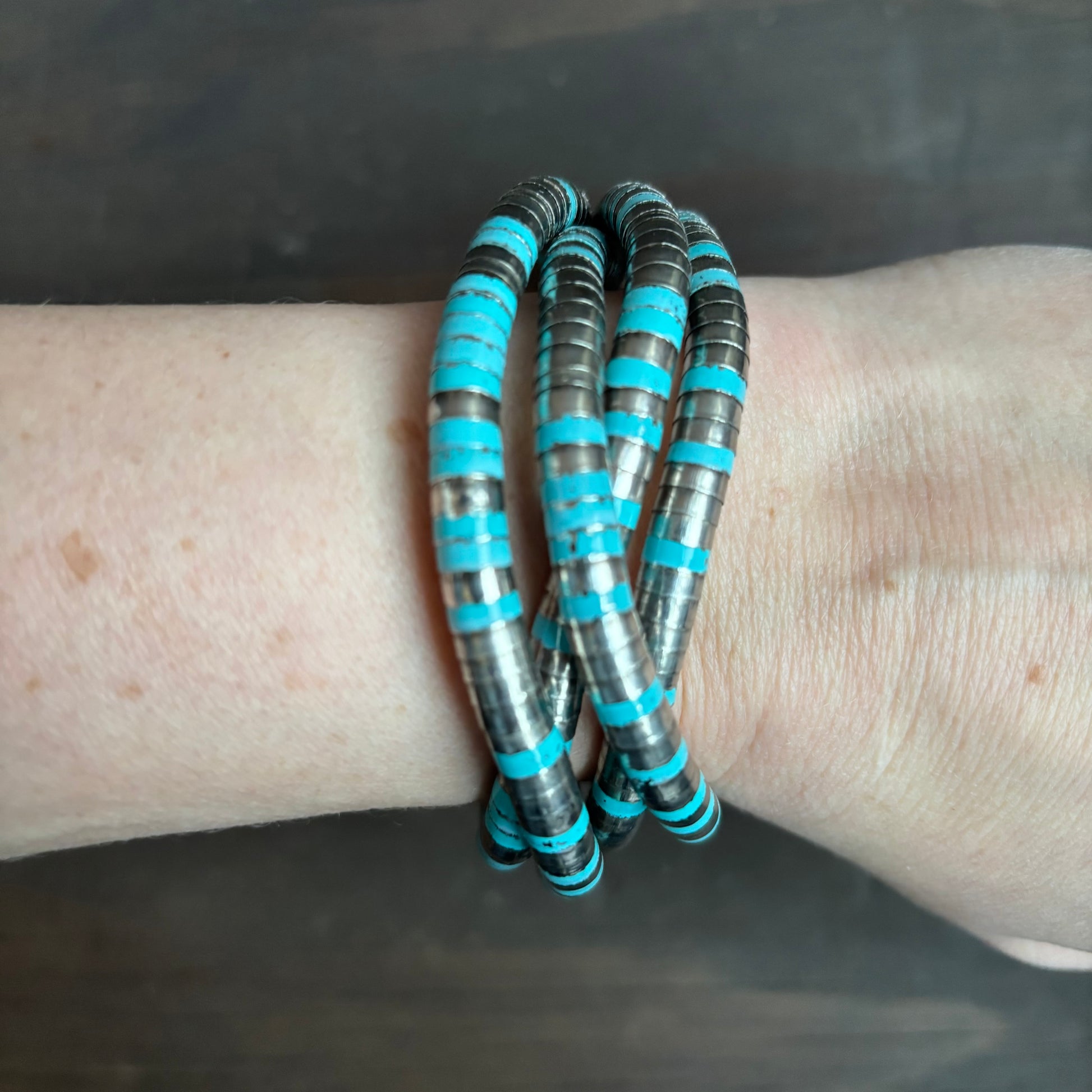 Unique stretch silver necklace with turquoise colored pieces throughout, can be worn as a long necklace or as a bracelet
