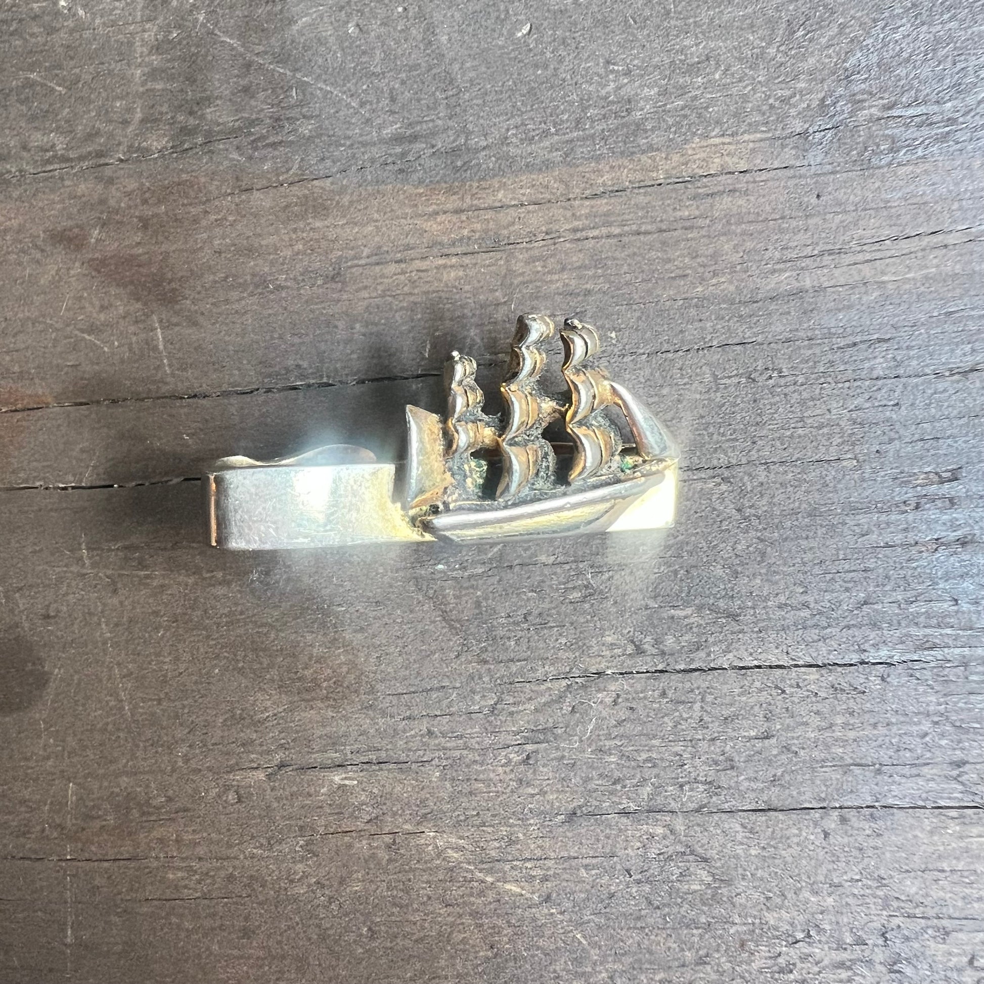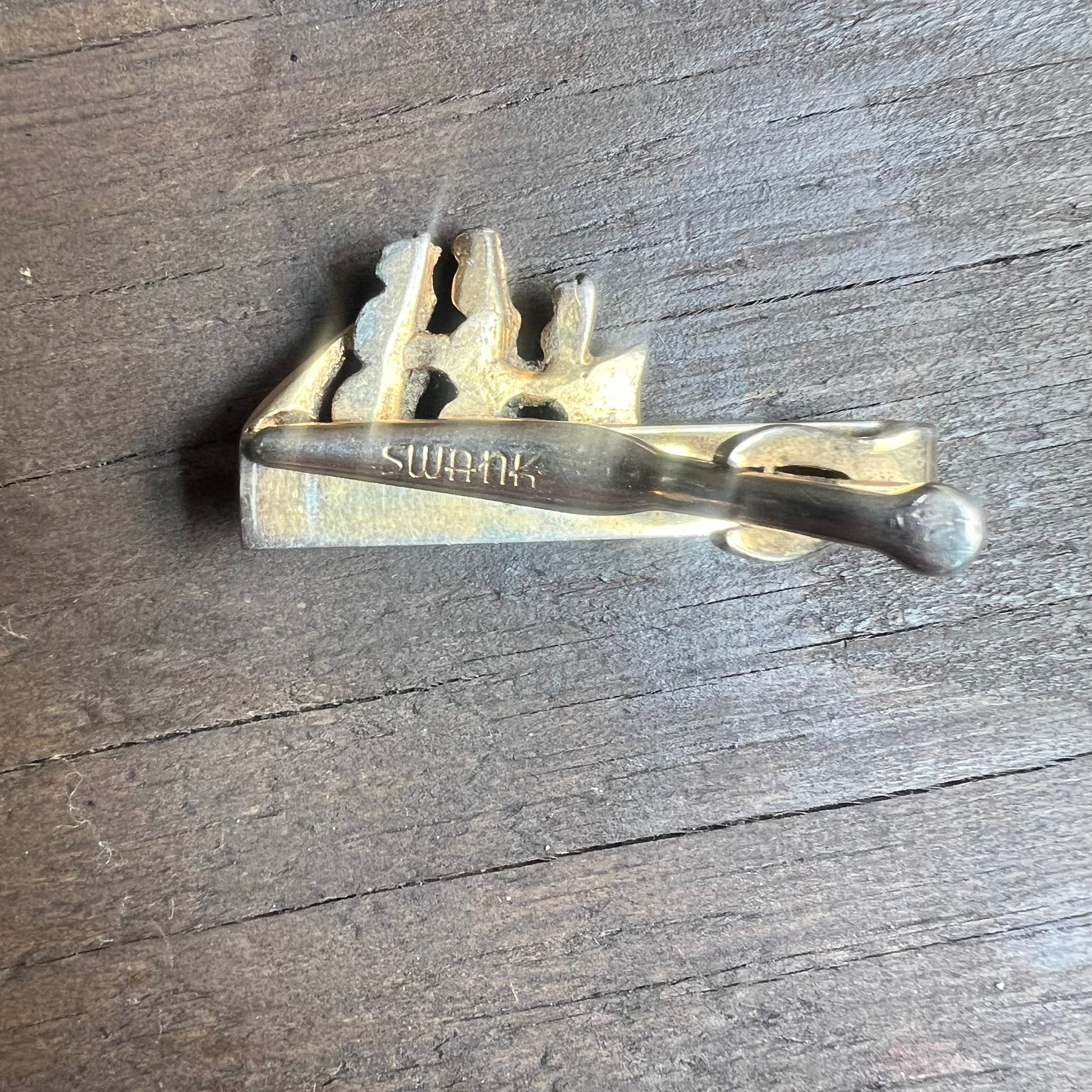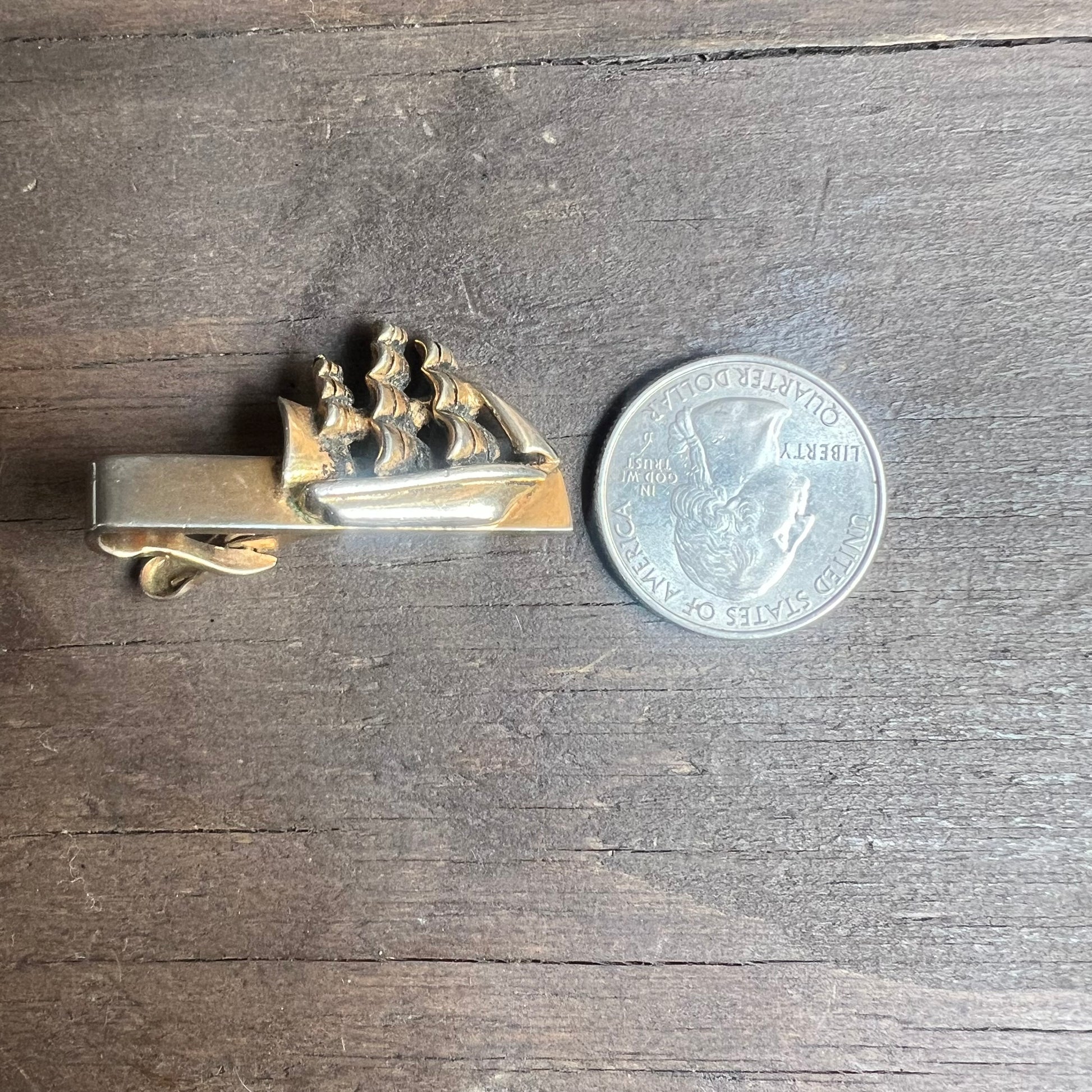 Tie clip from Swank, made from gold and silver colored metals. The tie clip features a carved ship. In excellent condition! See quarter for scale.