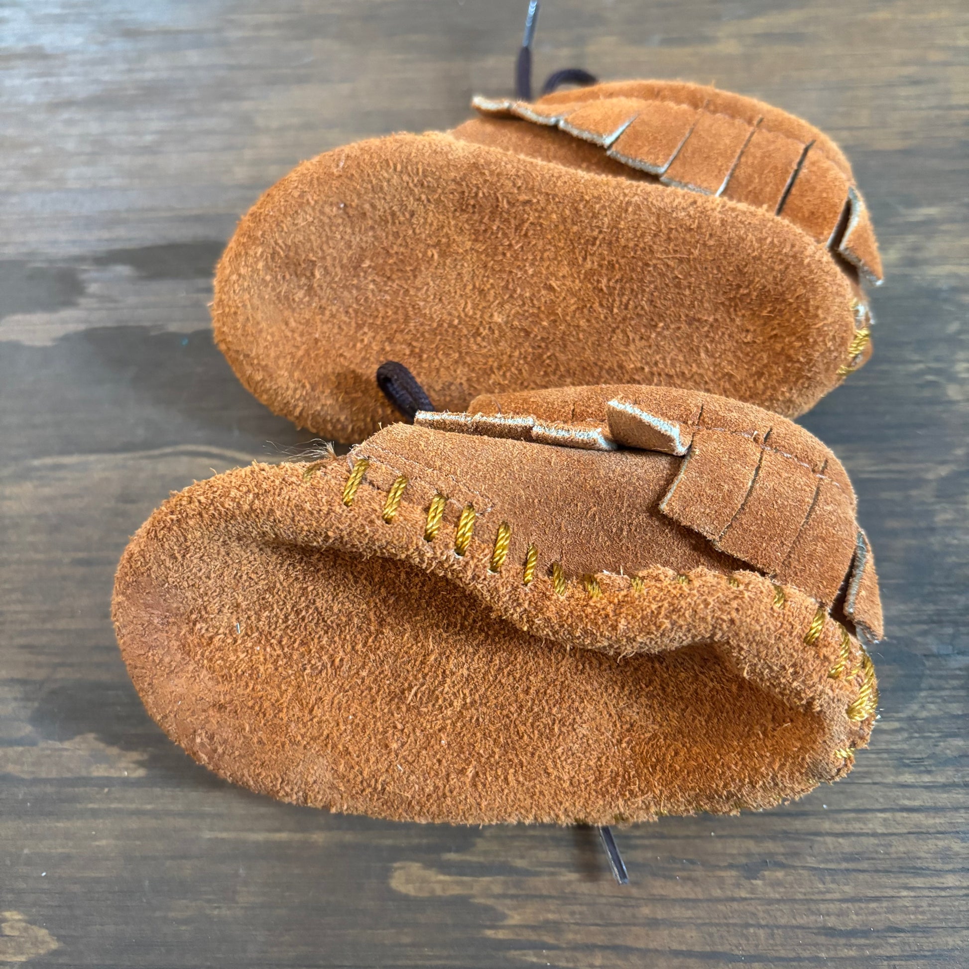 Beautiful and well-made tan leather baby moccasins, made in the USA and reservation crafted by the Oglala Sioux Indians, nearly new condition