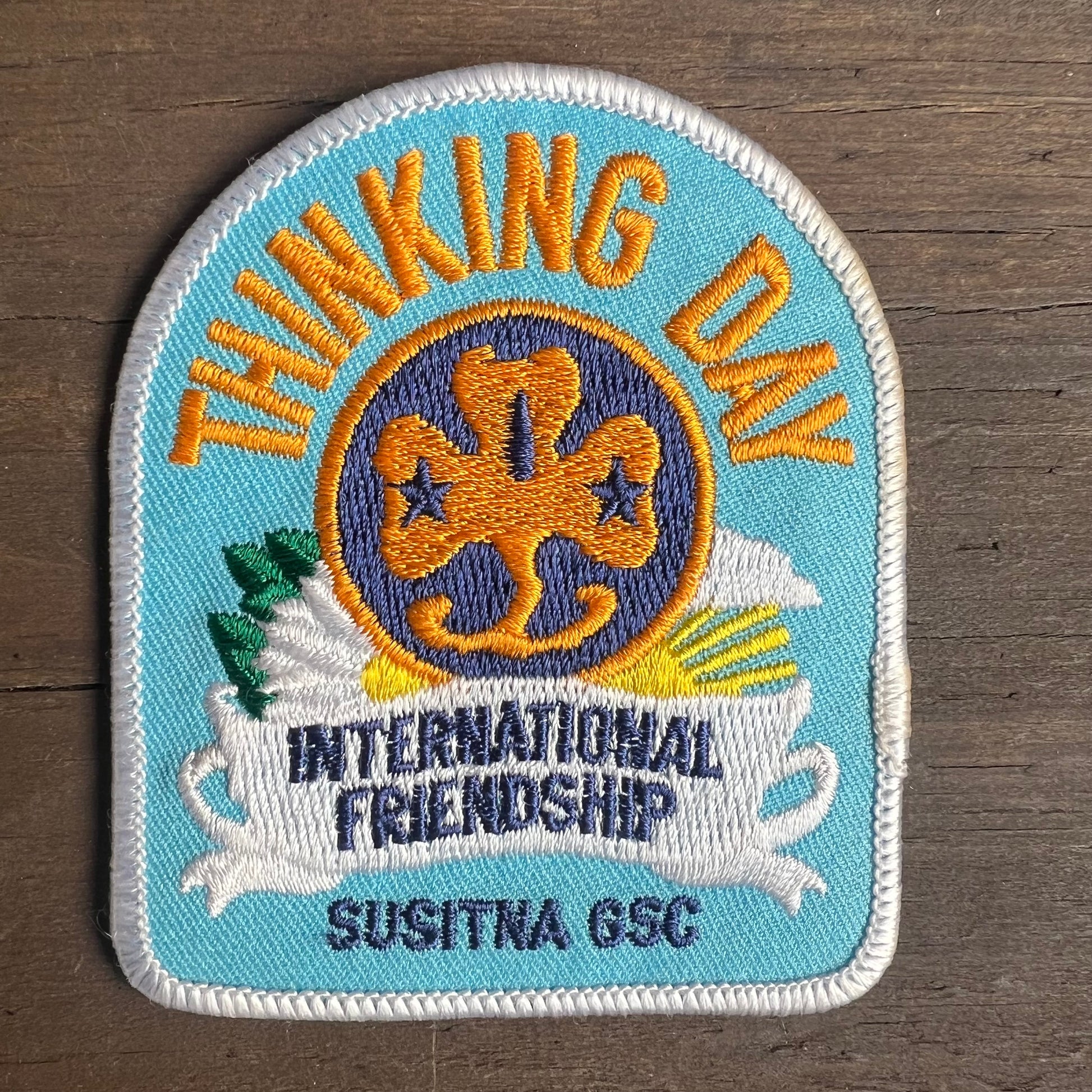 This vintage Thinking Day patch features a three-leaf clover, symbolizing the spirit of friendship, unity, and global connection. Below the clover, the words “International Friendship” are embroidered, reflecting the values of Thinking Day, an annual event celebrated by Girl Guides and Girl Scouts worldwide. On this day, members honor the global sisterhood and reflect on the importance of cross- cultural understanding and support. Patch is in good condition, about 4” tall and 3” wide.