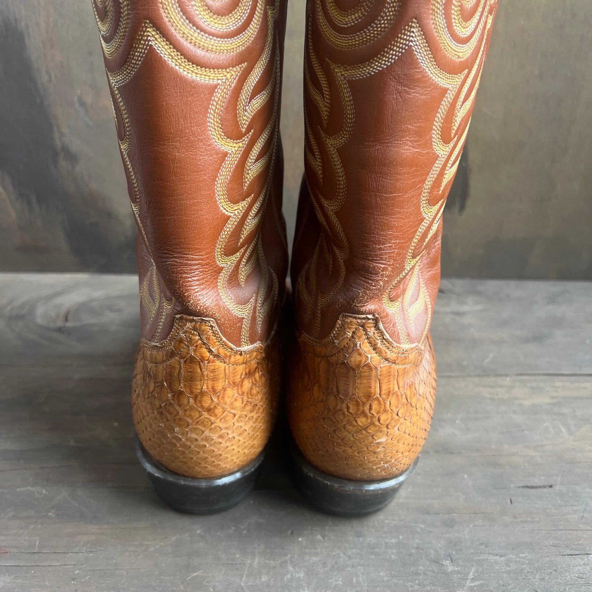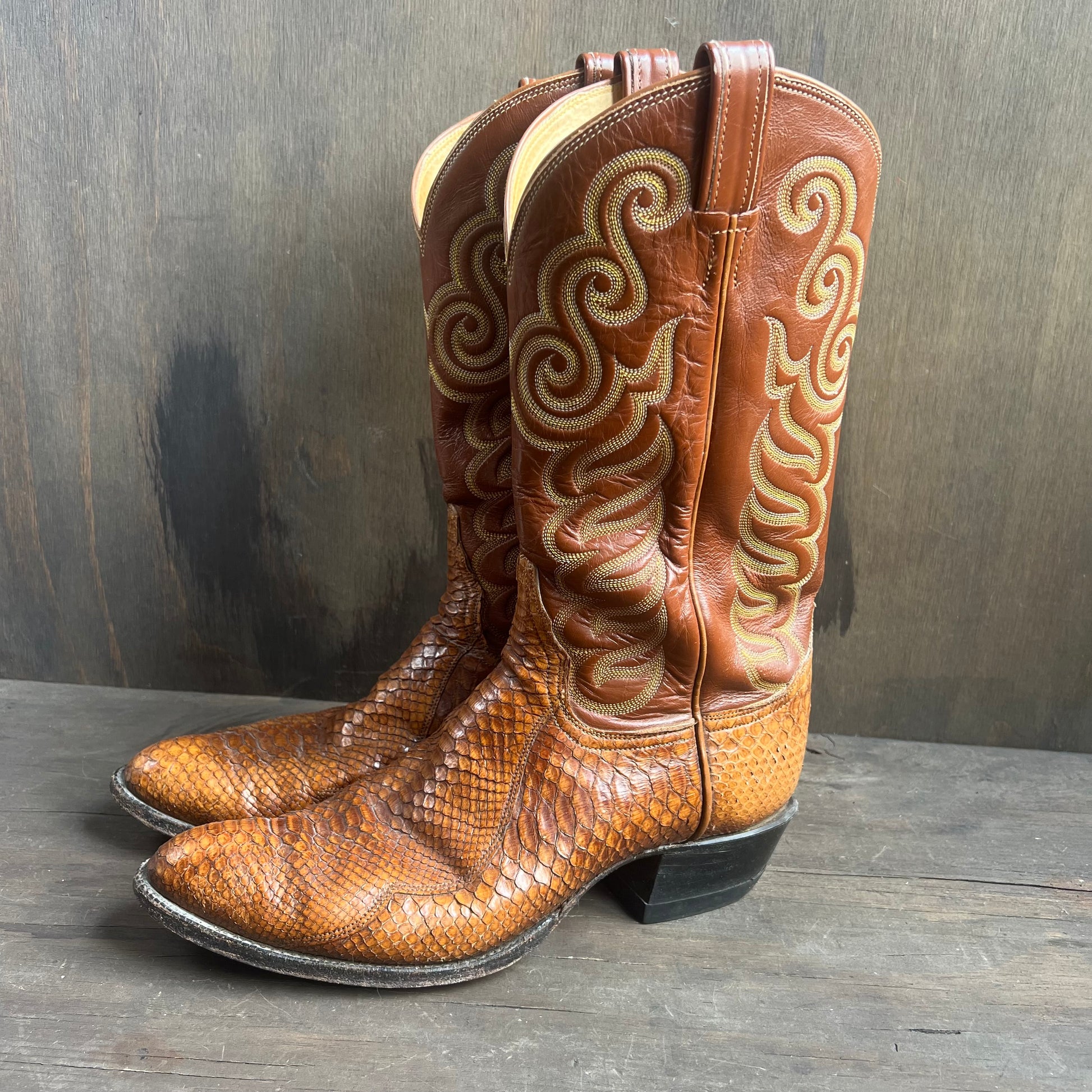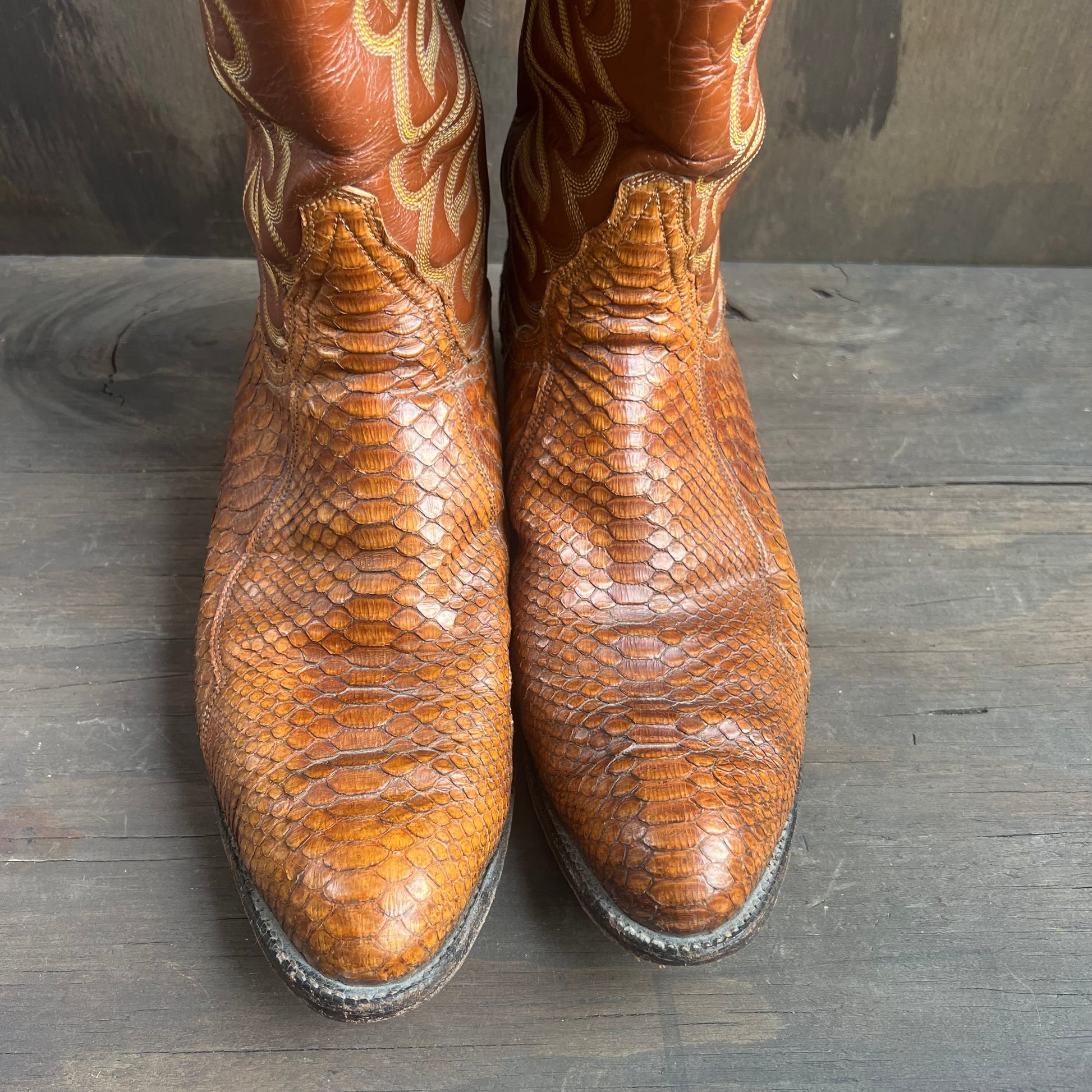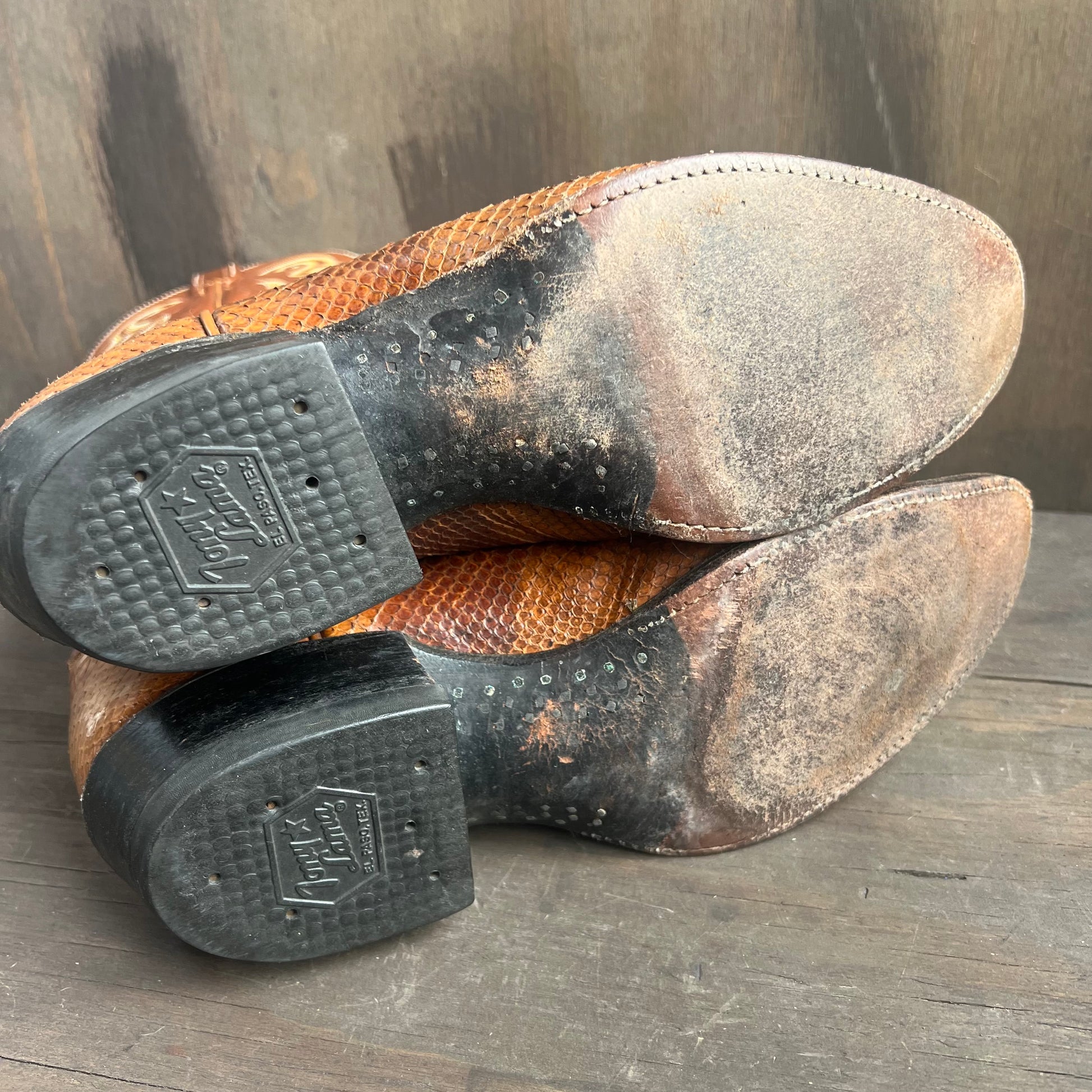 Beautiful leather and snakeskin boots. The shaft is made from brown leather, and the vamp is made from brown snakeskin. These boots features a classic round toe. The boots are stamped with a “factory defect” stamp which means they were likely never sold in the Tony Lama store, but these shoes are in excellent condition and have no noticeable flaws. Men’s 11, women’s 12.5.