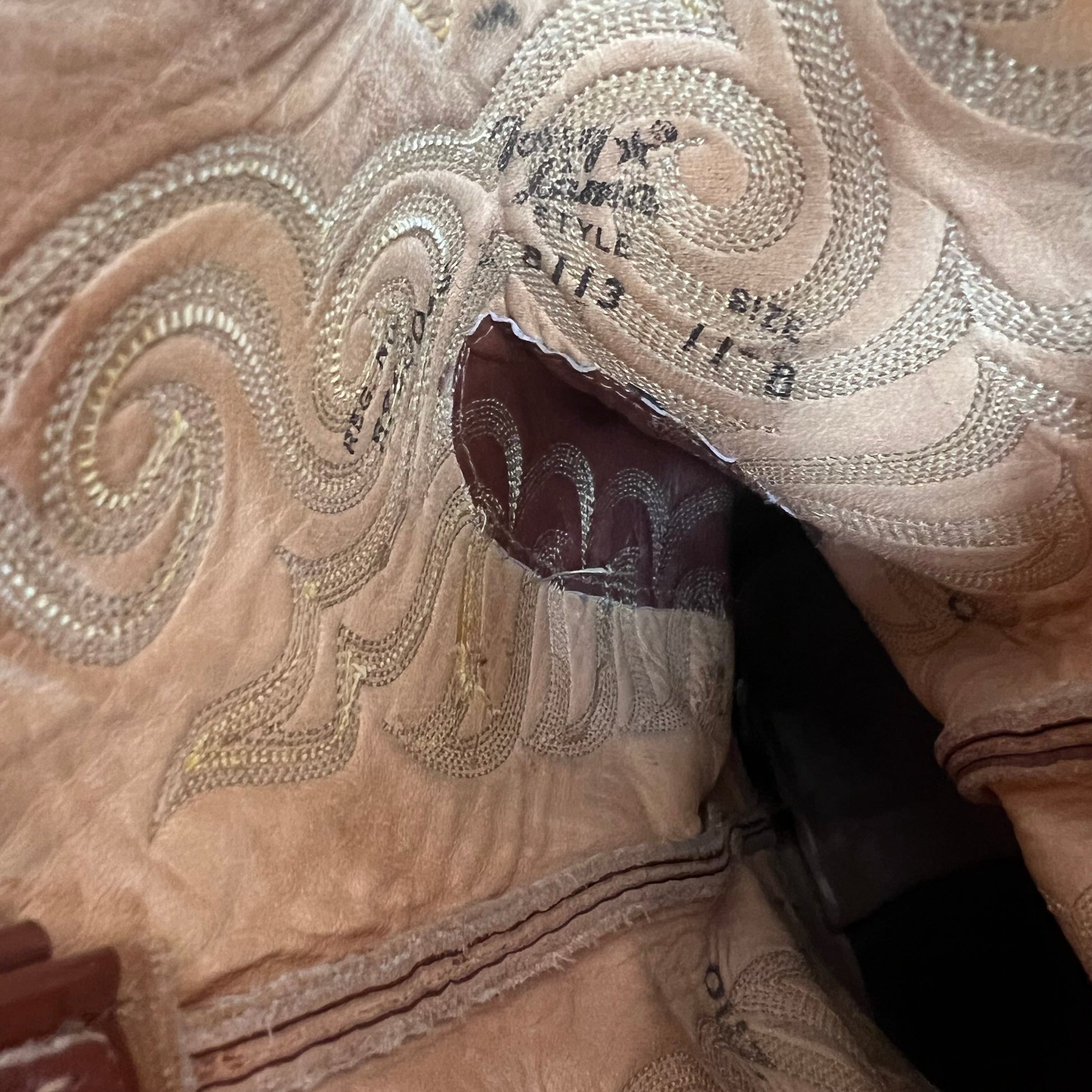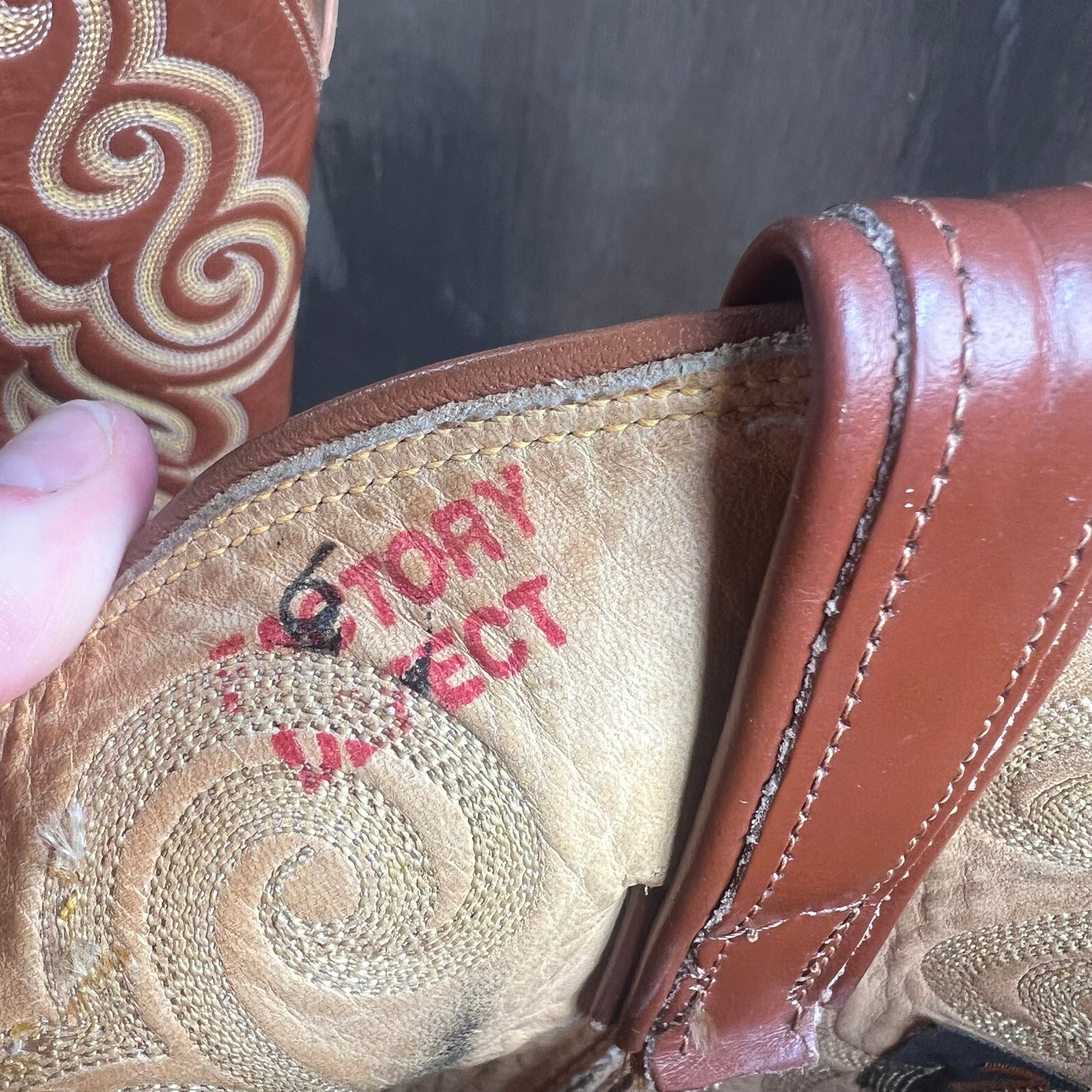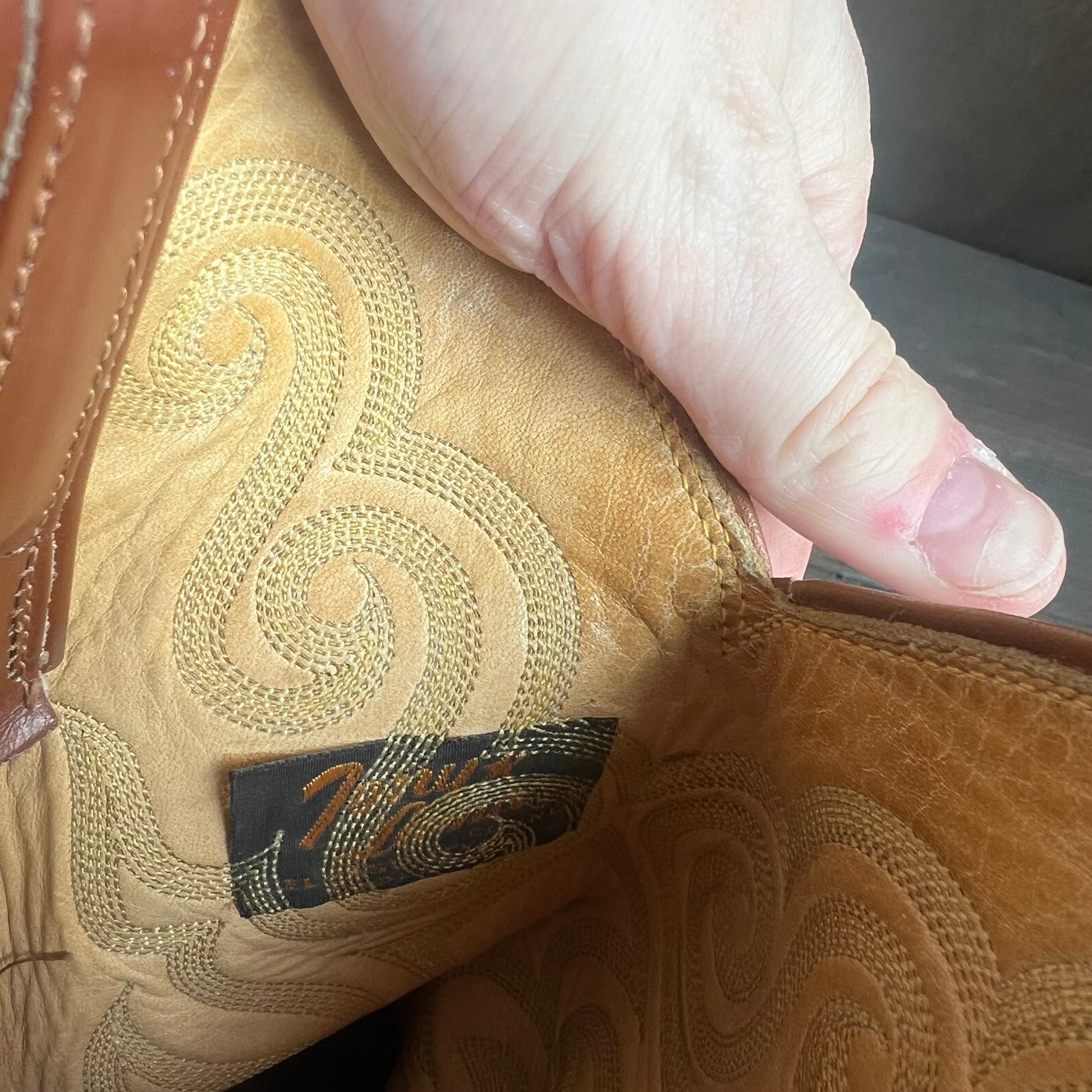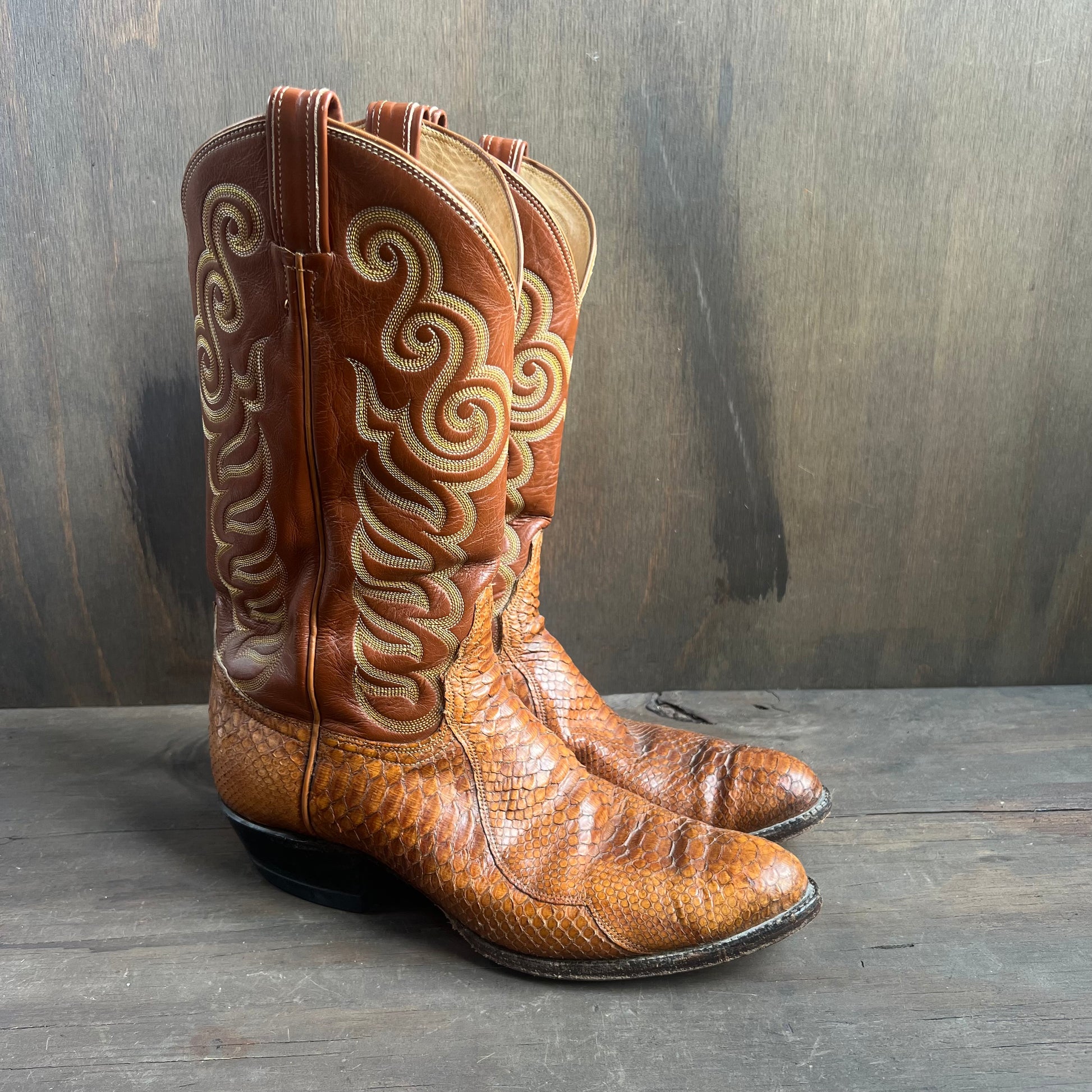 Beautiful leather and snakeskin boots. The shaft is made from brown leather, and the vamp is made from brown snakeskin. These boots features a classic round toe. The boots are stamped with a “factory defect” stamp which means they were likely never sold in the Tony Lama store, but these shoes are in excellent condition and have no noticeable flaws. Men’s 11, women’s 12.5.