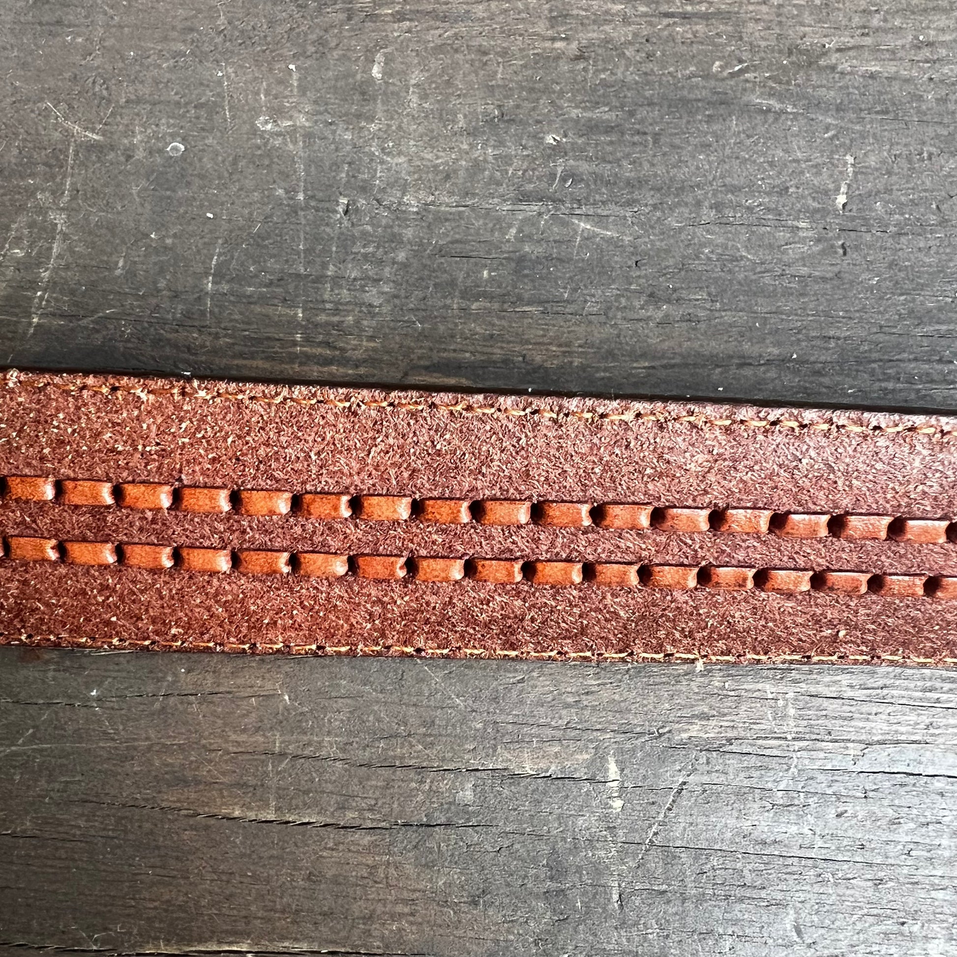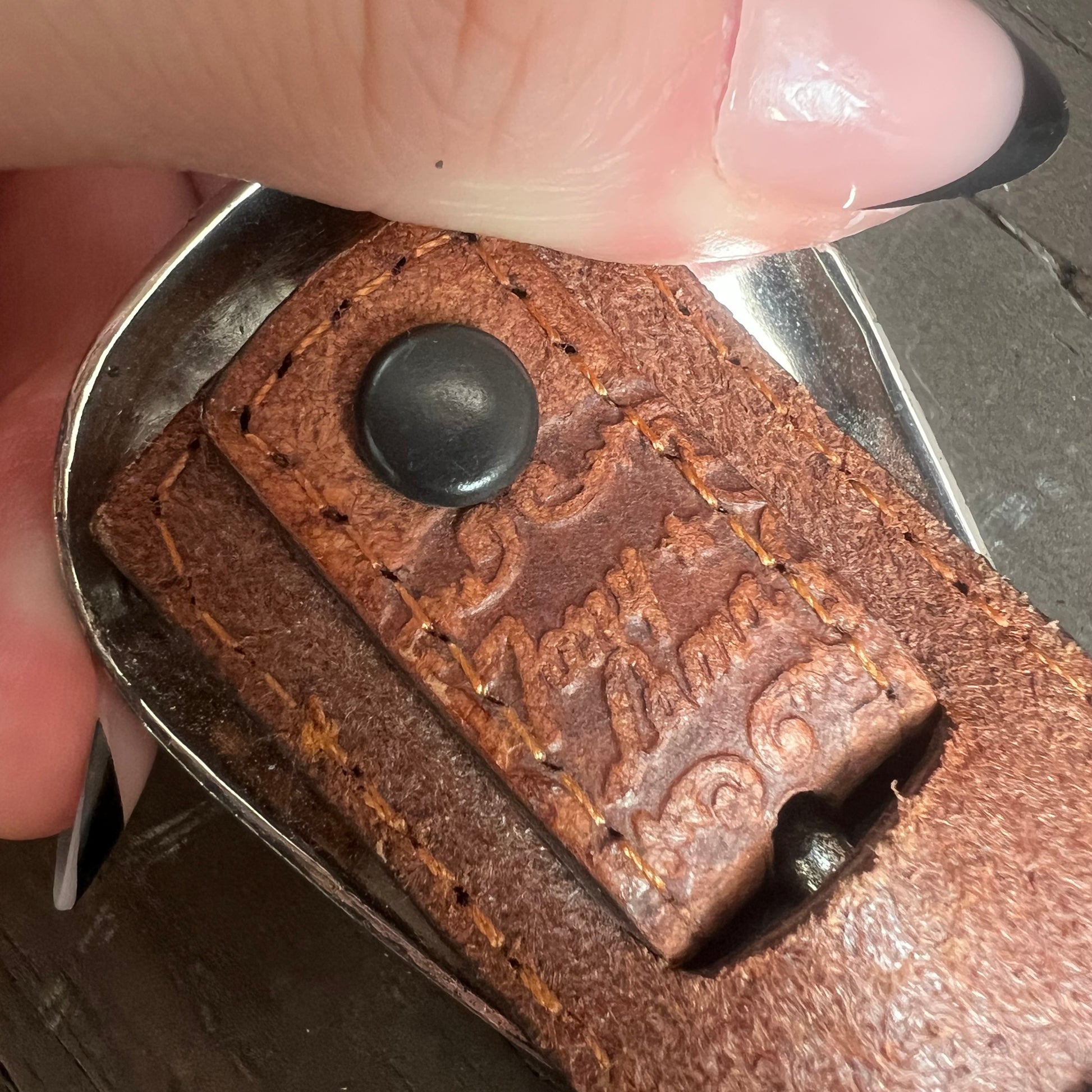 Gorgeous leather belt from Tony Lama with an intricate silver buckle and braided leather inlay. In excellent condition, size 38 (L).