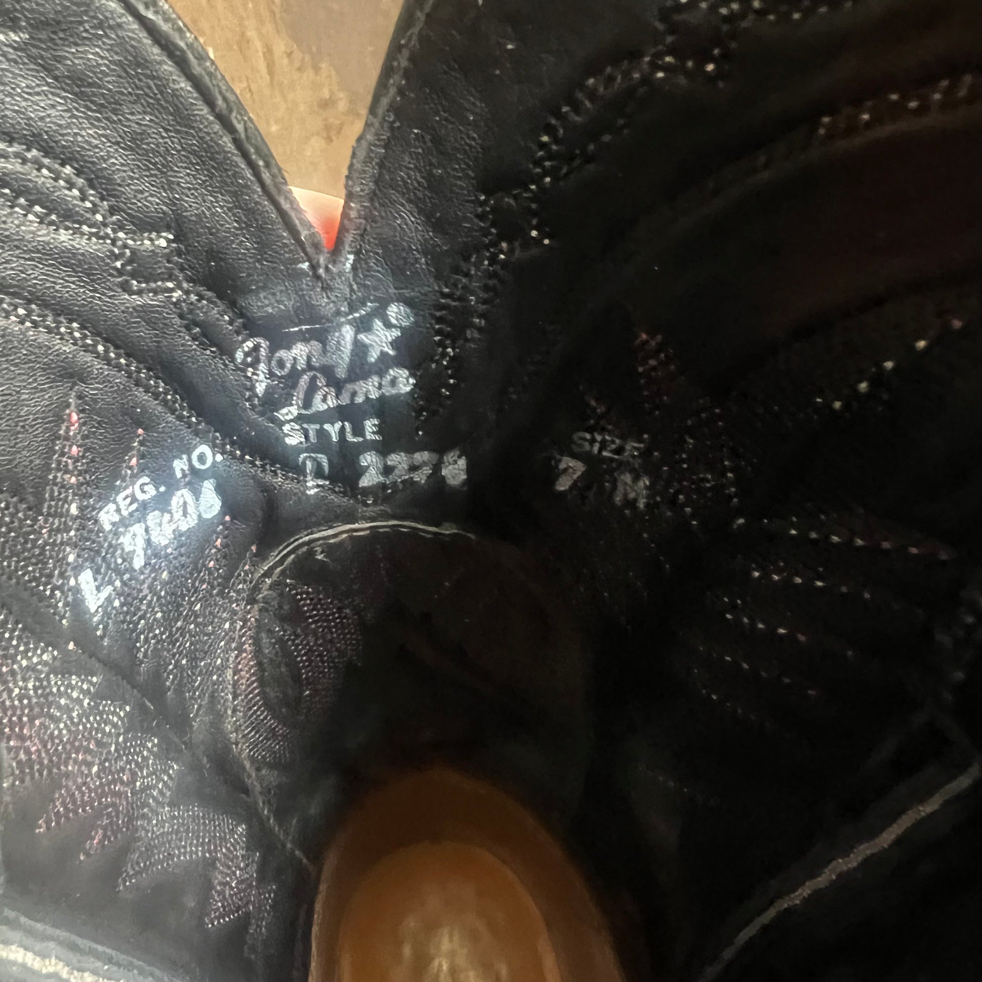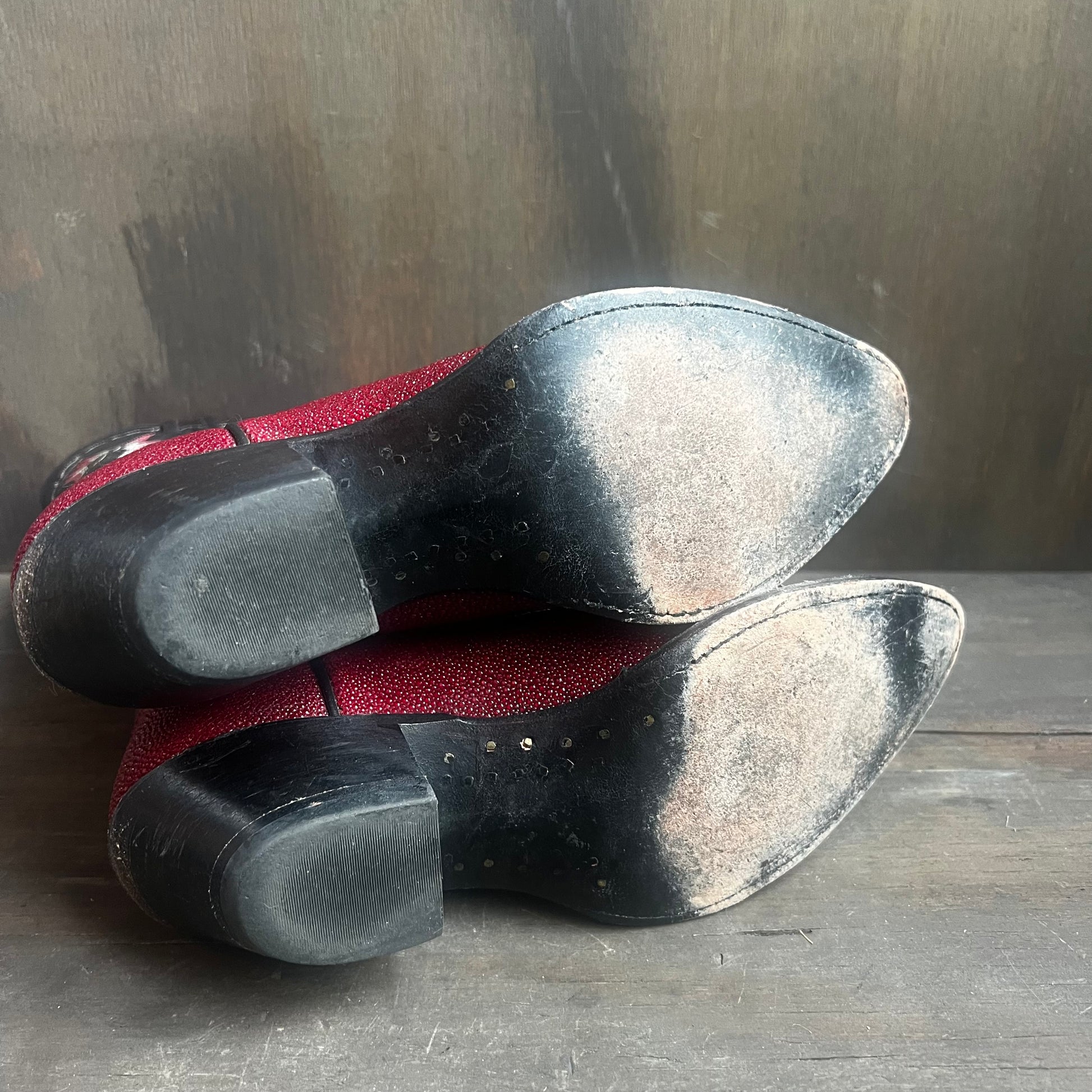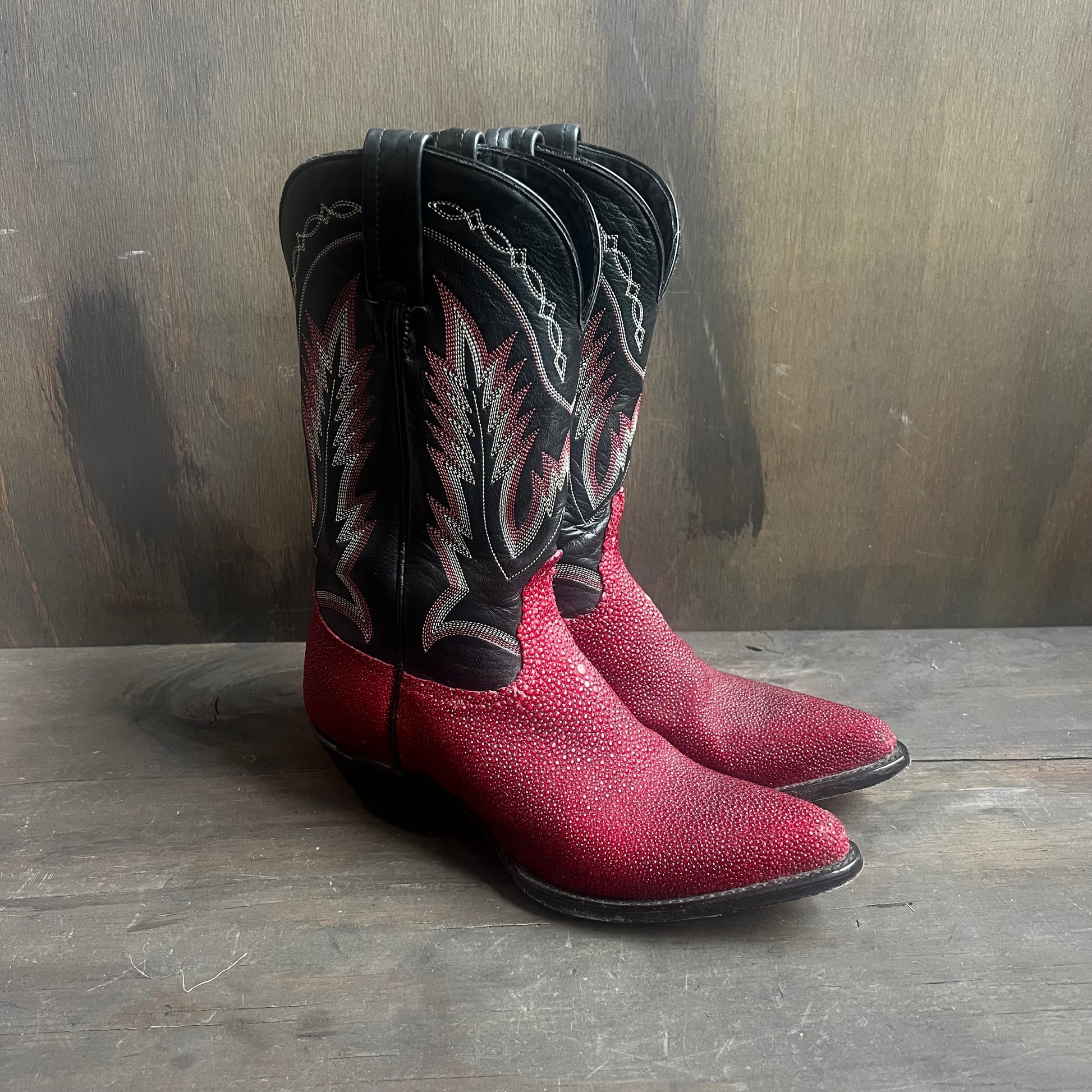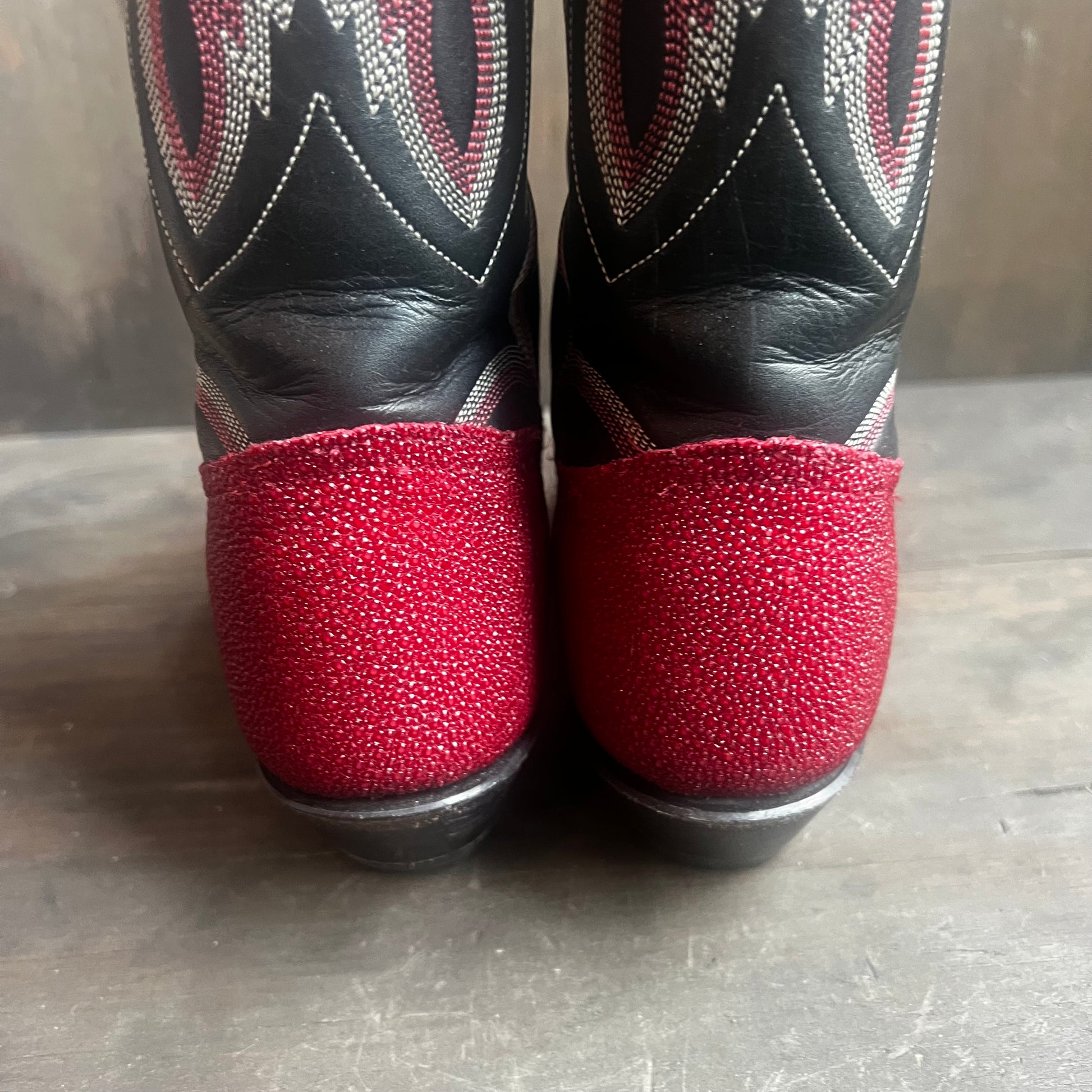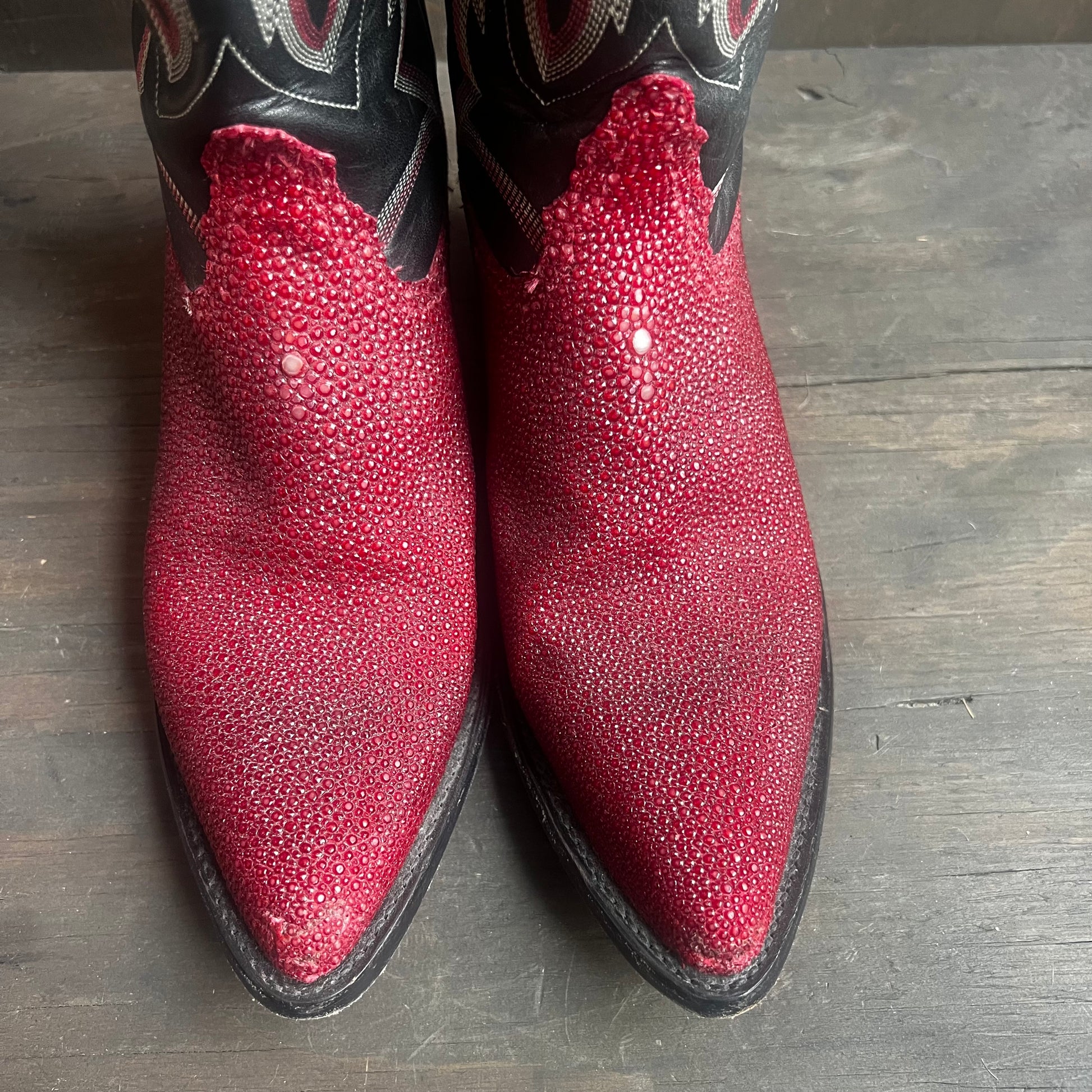 The coolest boots from Tony Lama made from black leather with a red stingray vamp. These boots are in great condition. Women’s 7, men’s 5.5.