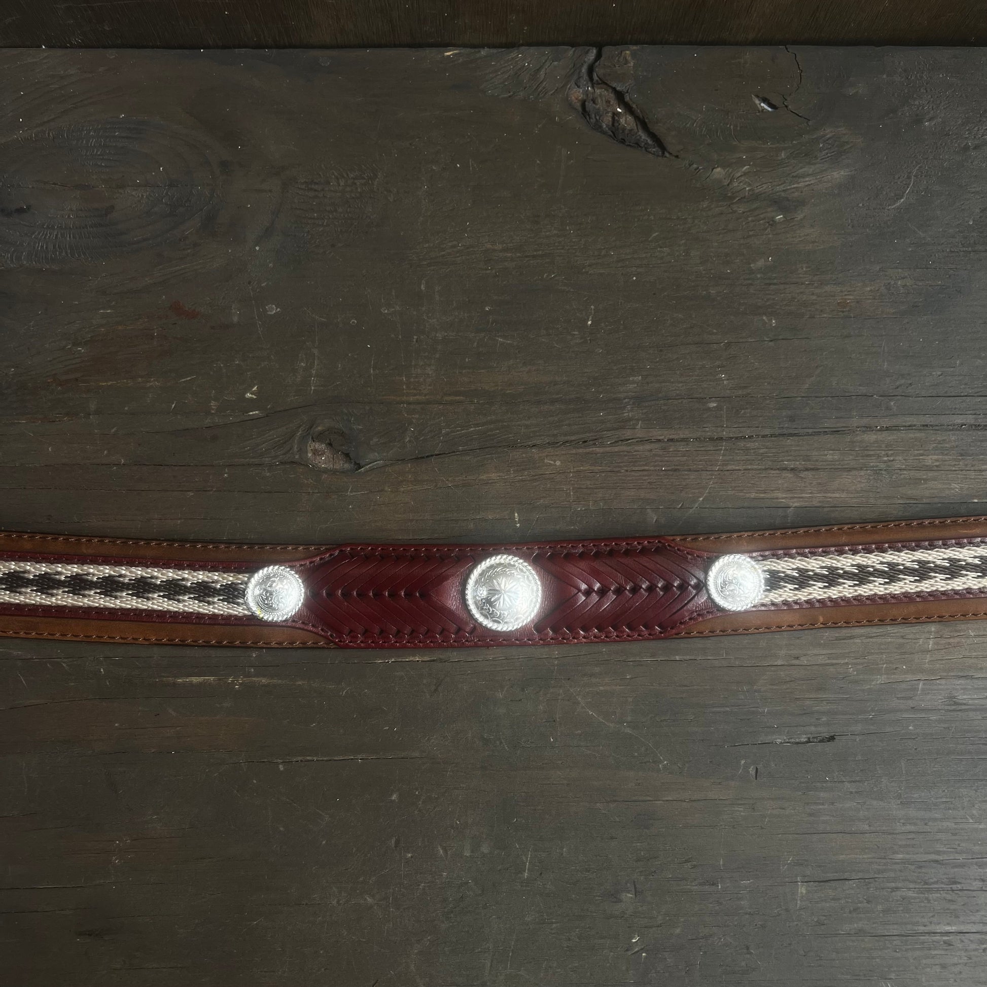 Gorgeous western belt with an embroidered inlay and silver conch detailing. In excellent condition, size 36 (M).