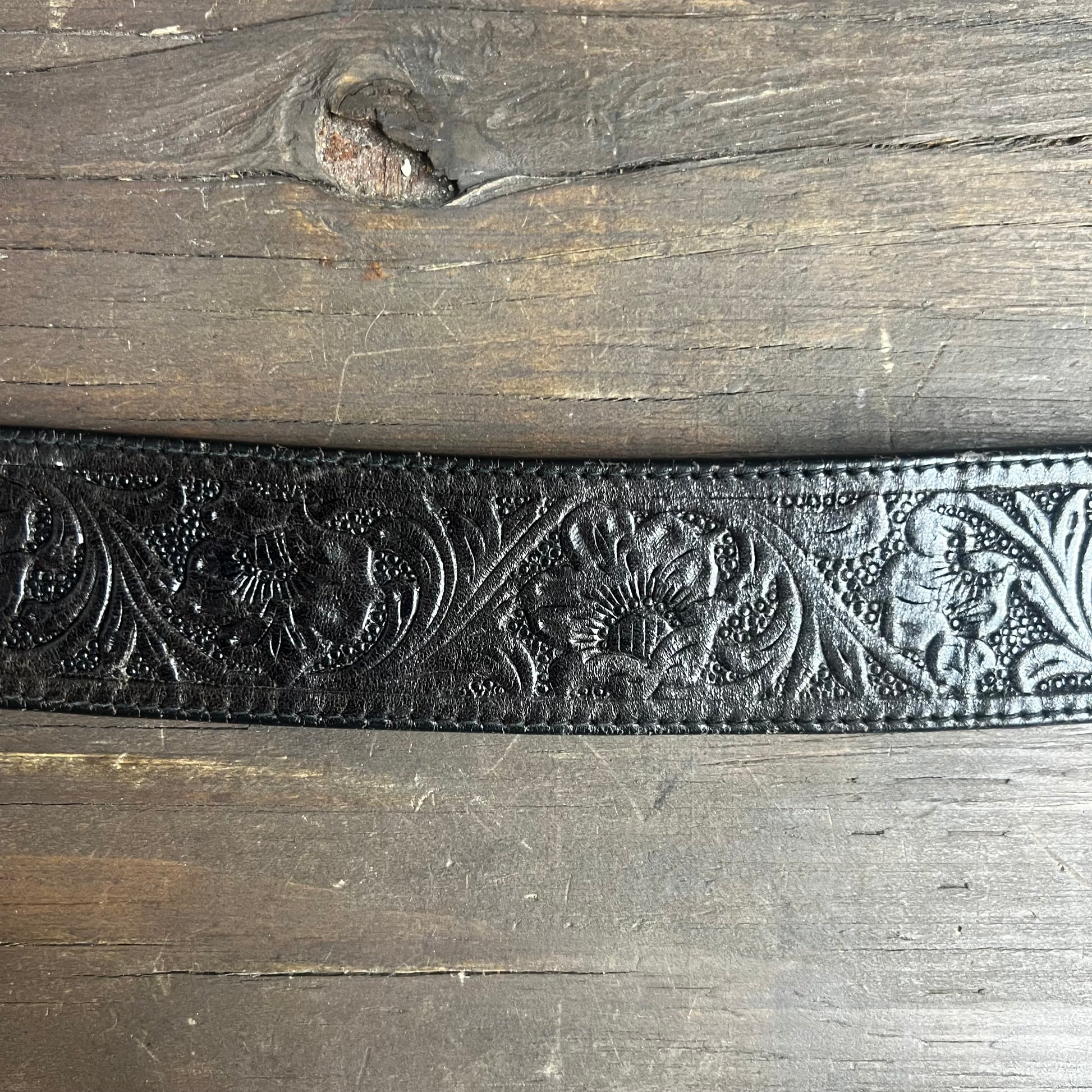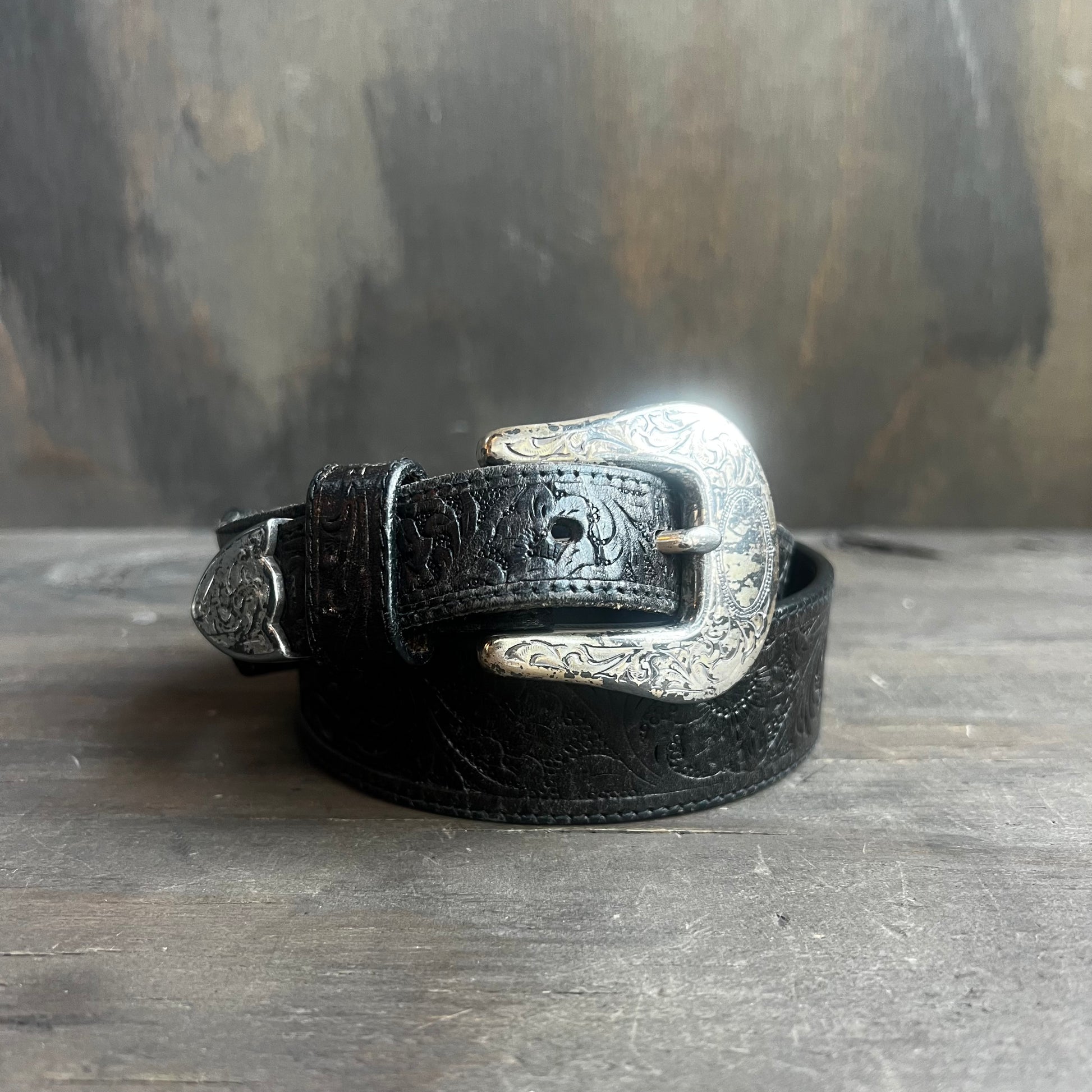 Tooled Black Leather Belt with Silver Buckle