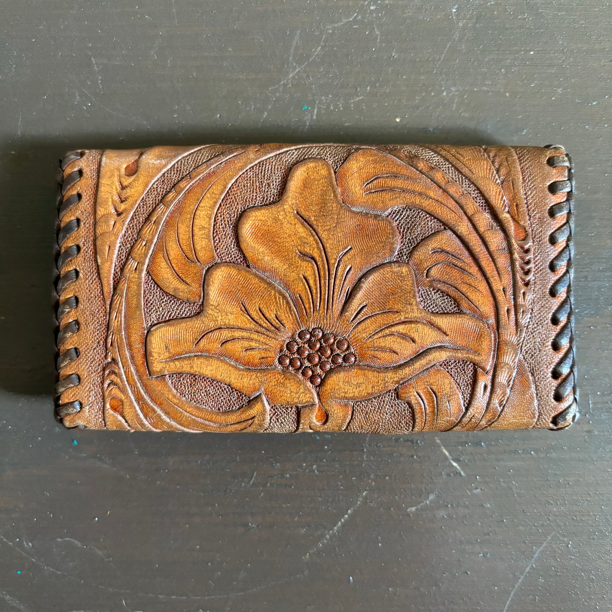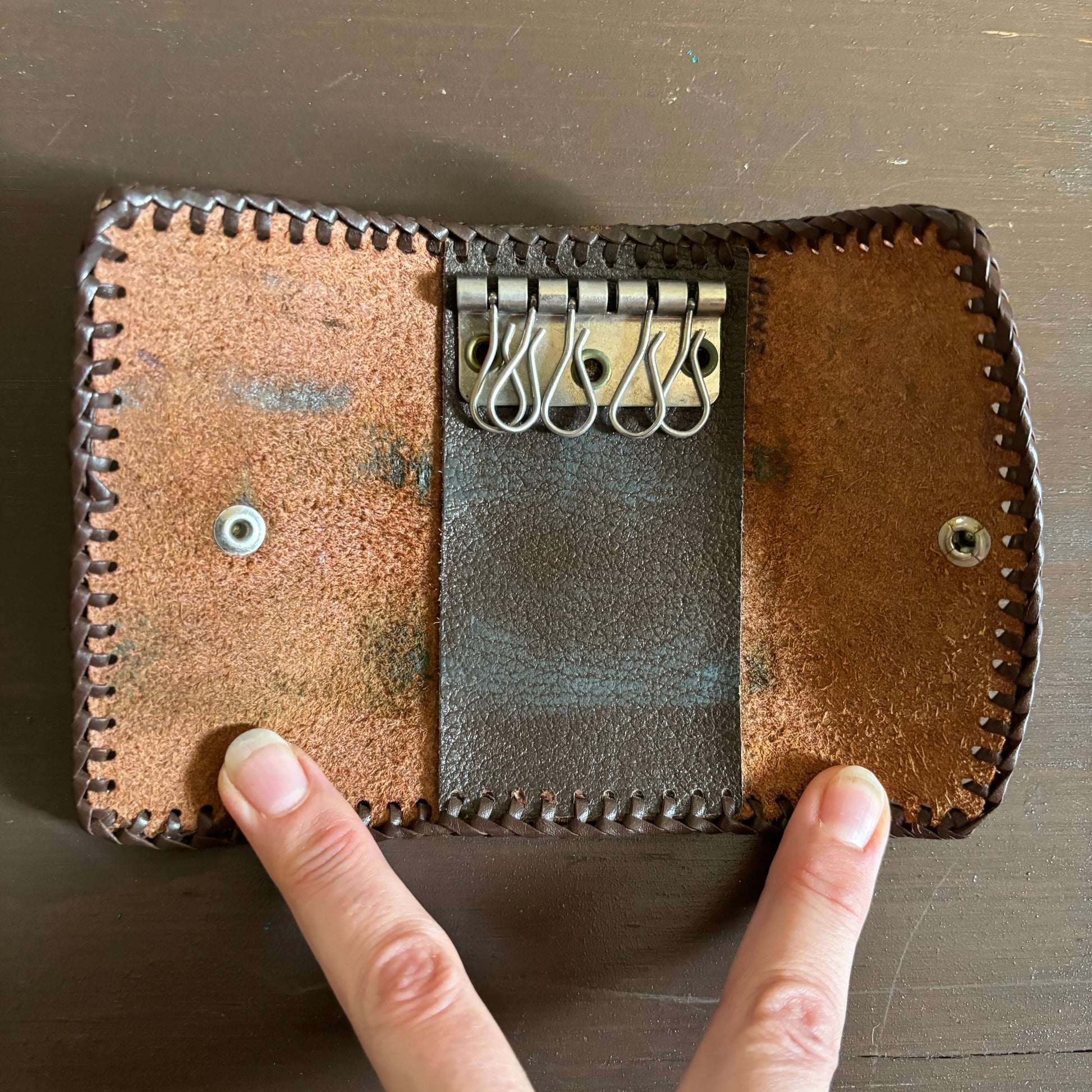 Vintage tooled leather trifold key-holder with snap closure. Has five hooks inside for different keys. Cool and functional way to store keys without the jingle.