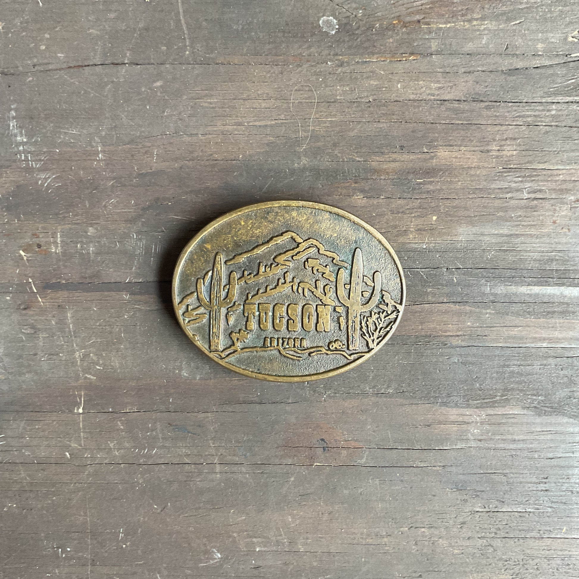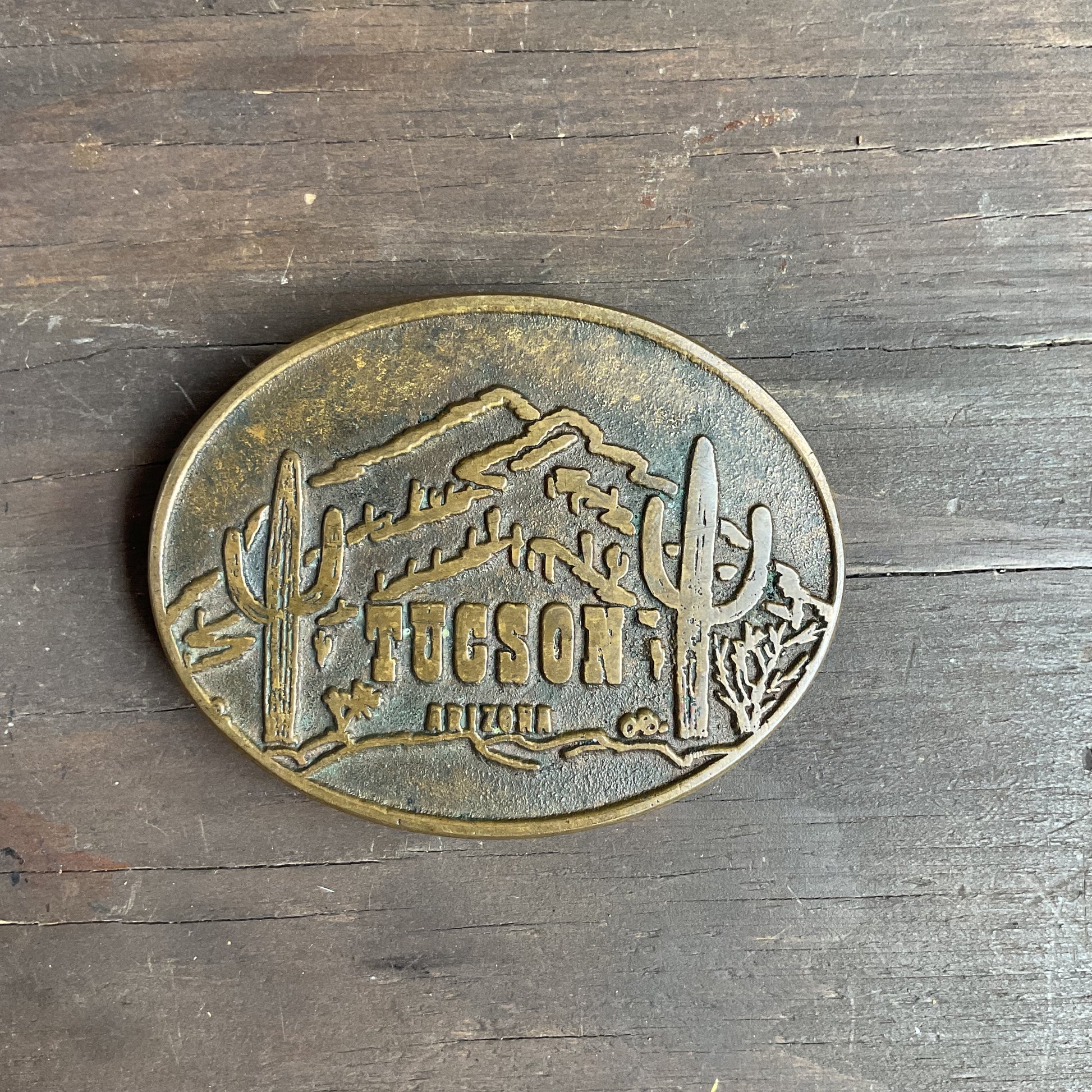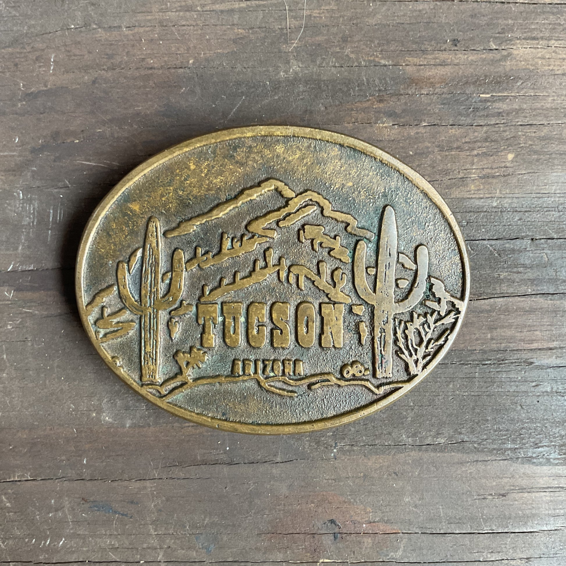 Rustic style belt buckle from Tucson, AZ. Buckle has etchings of the classic Tucson Saguaro Cactus. In great condition, 4" across.