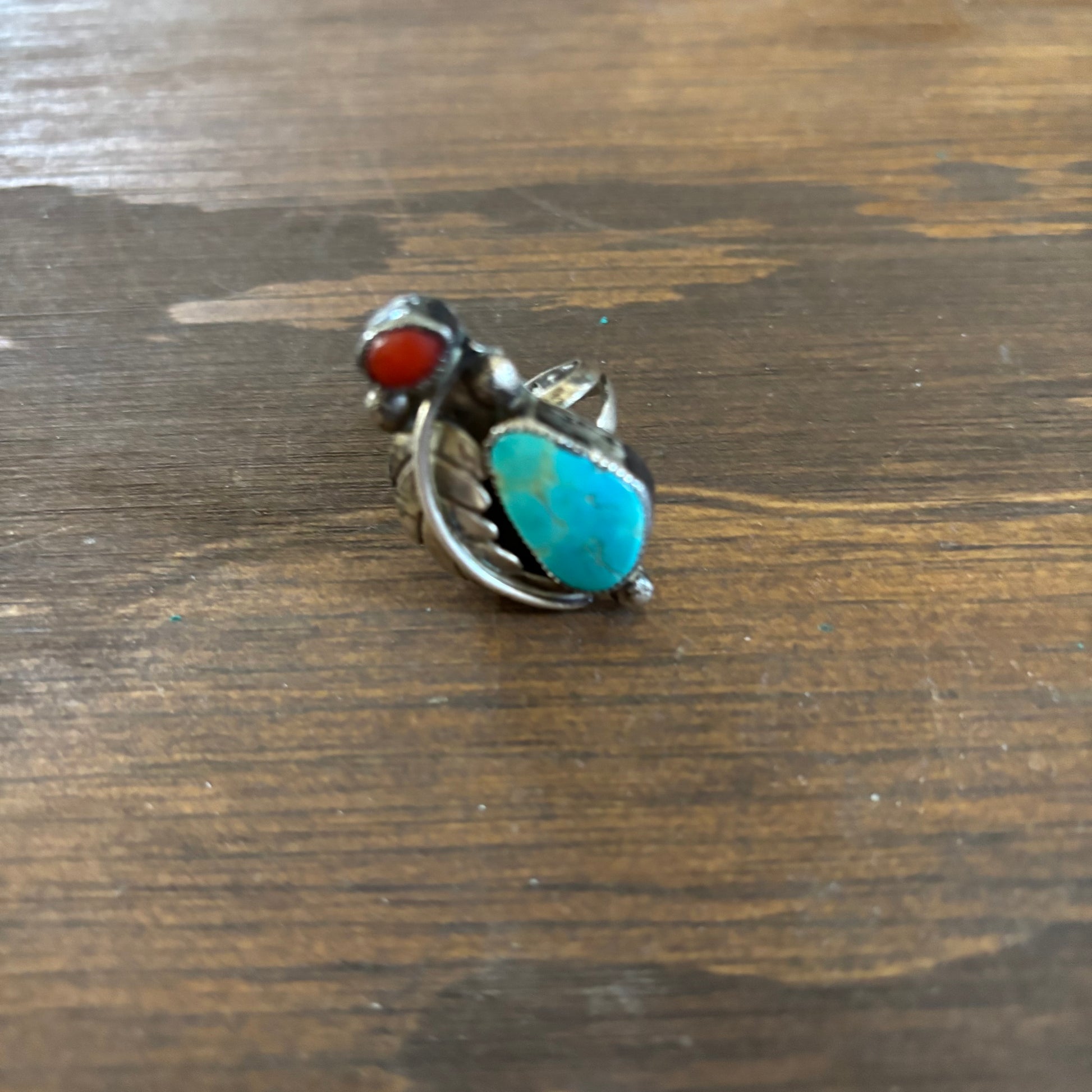 Ornate and organic feeling silver turquoise ring with leaf and red coral accent, band out of shape - likely a size 7 but fits like a 6, priced as is