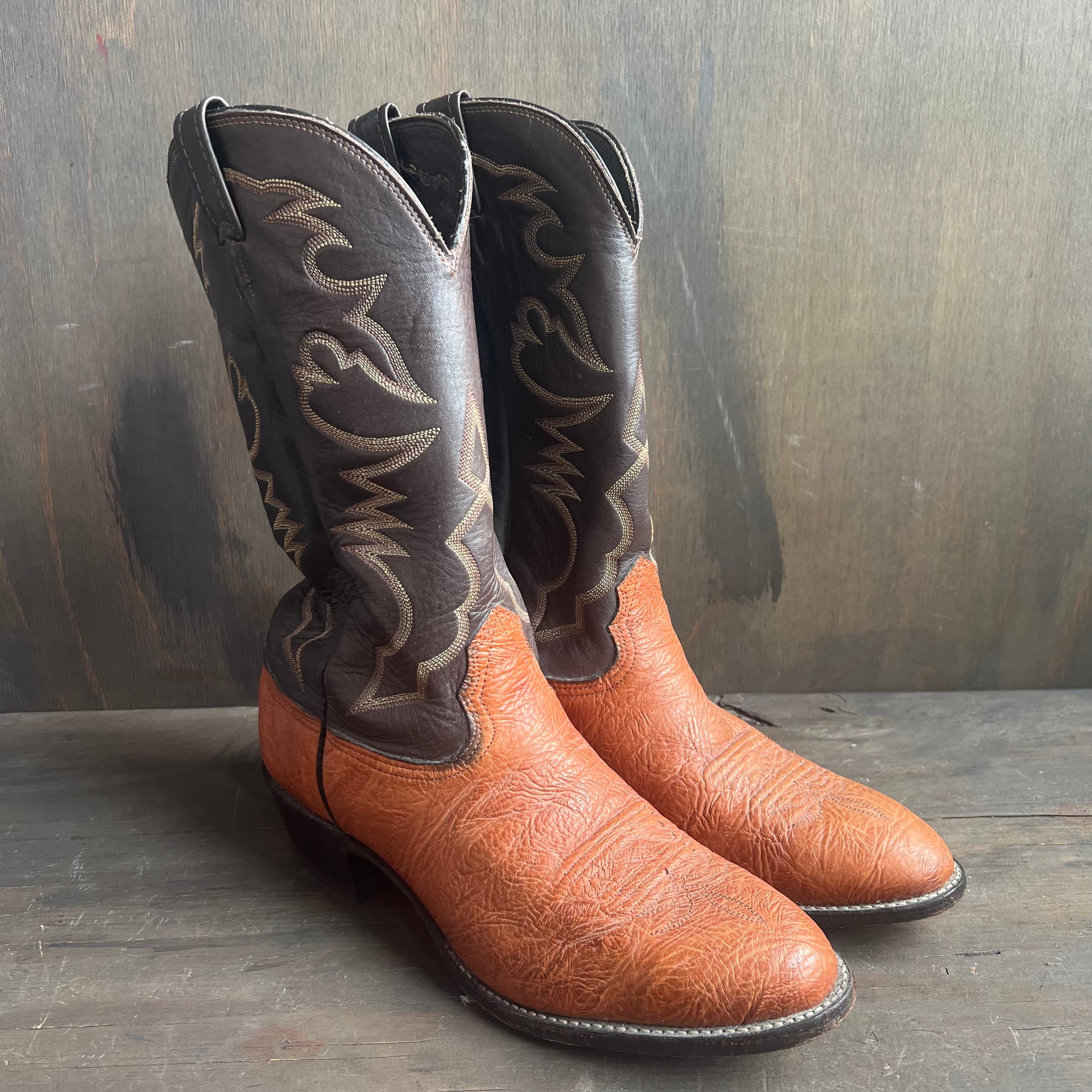 Larry Mahan two tone brown and tan textures leather boots with stitching detail; men’s size 12